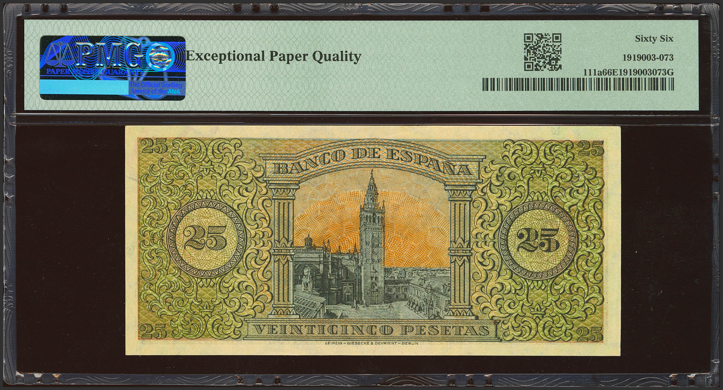 25 Pesetas. May 20, 1938. Series C. (Edifil 2023: 430a, Pick: 111a). Rare in this exceptional quality, original sizing. Uncirculated. PMG66EPQ package.