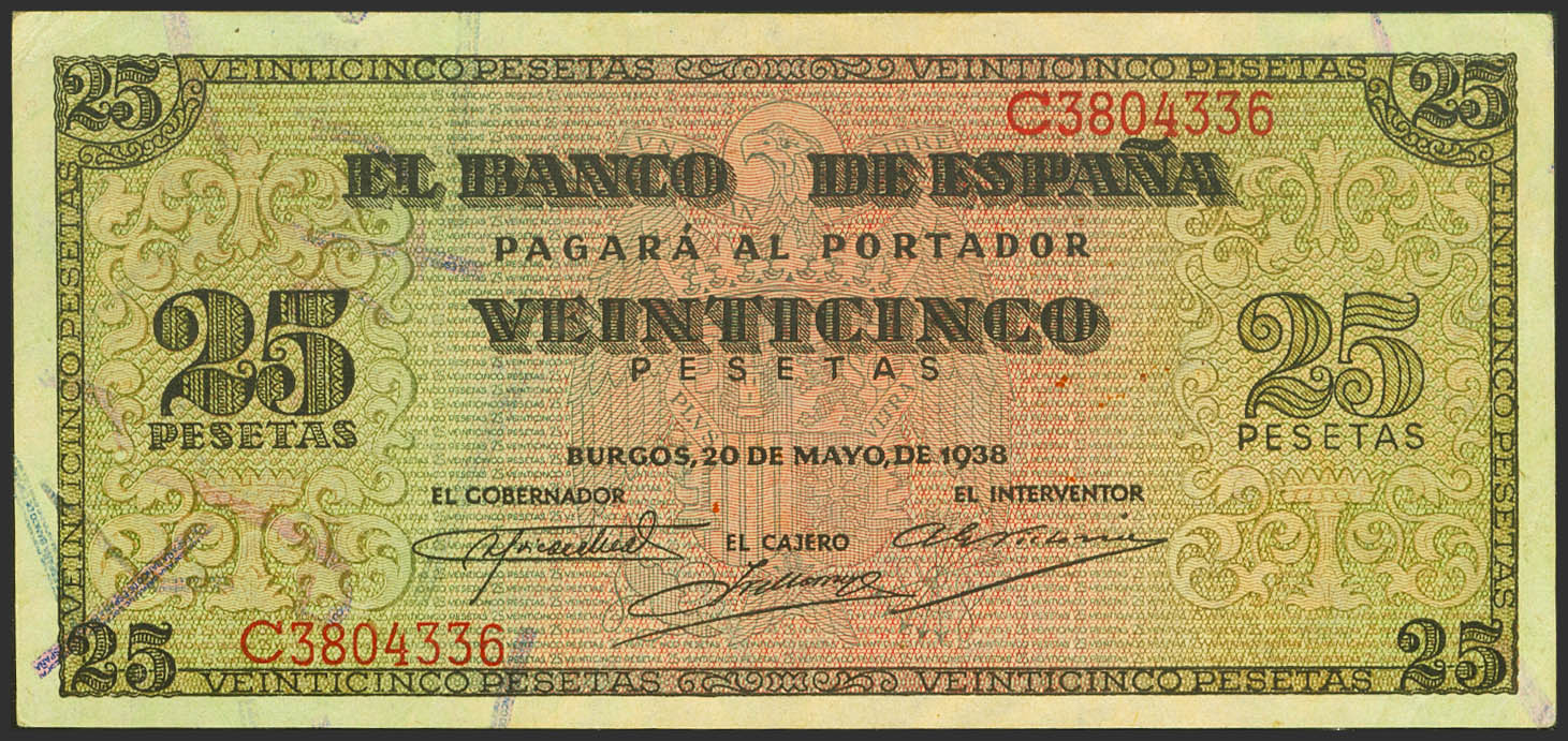 25 Pesetas. May 20, 1938. Series C. (Edifil 2023: 430a). Unusual, original sizing. Uncirculated-.