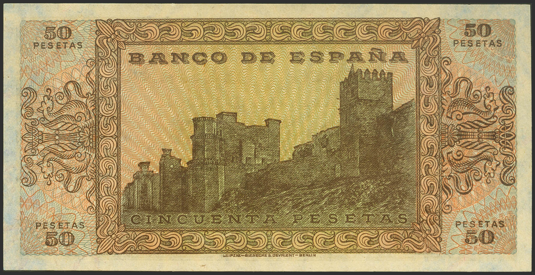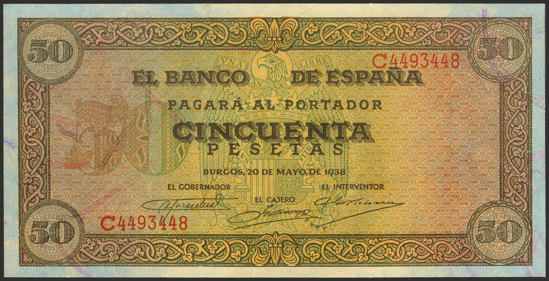 English 50 Pesetas. May 20, 1938. Series C. (Edifil 2023: 431a). Original sizing, natural wrinkles on the paper (this is the only reason for "removing" the Uncirculated). Good Extremely Fine++.
