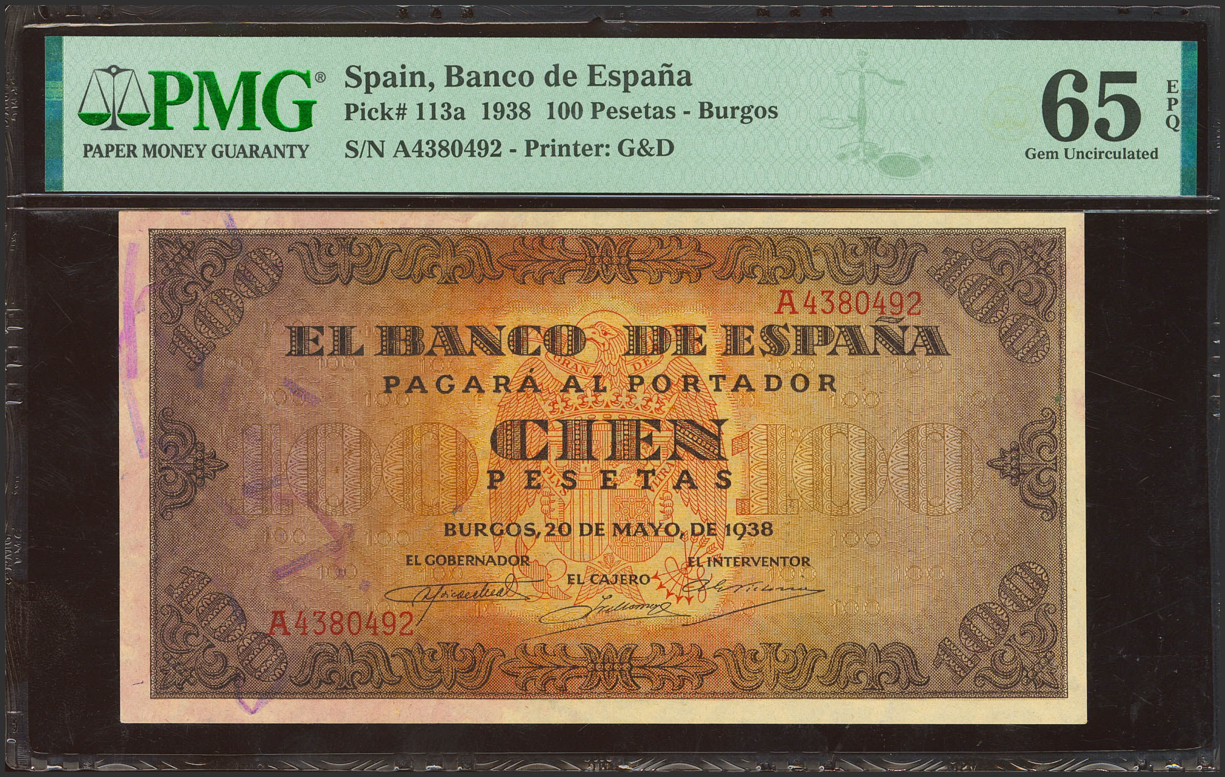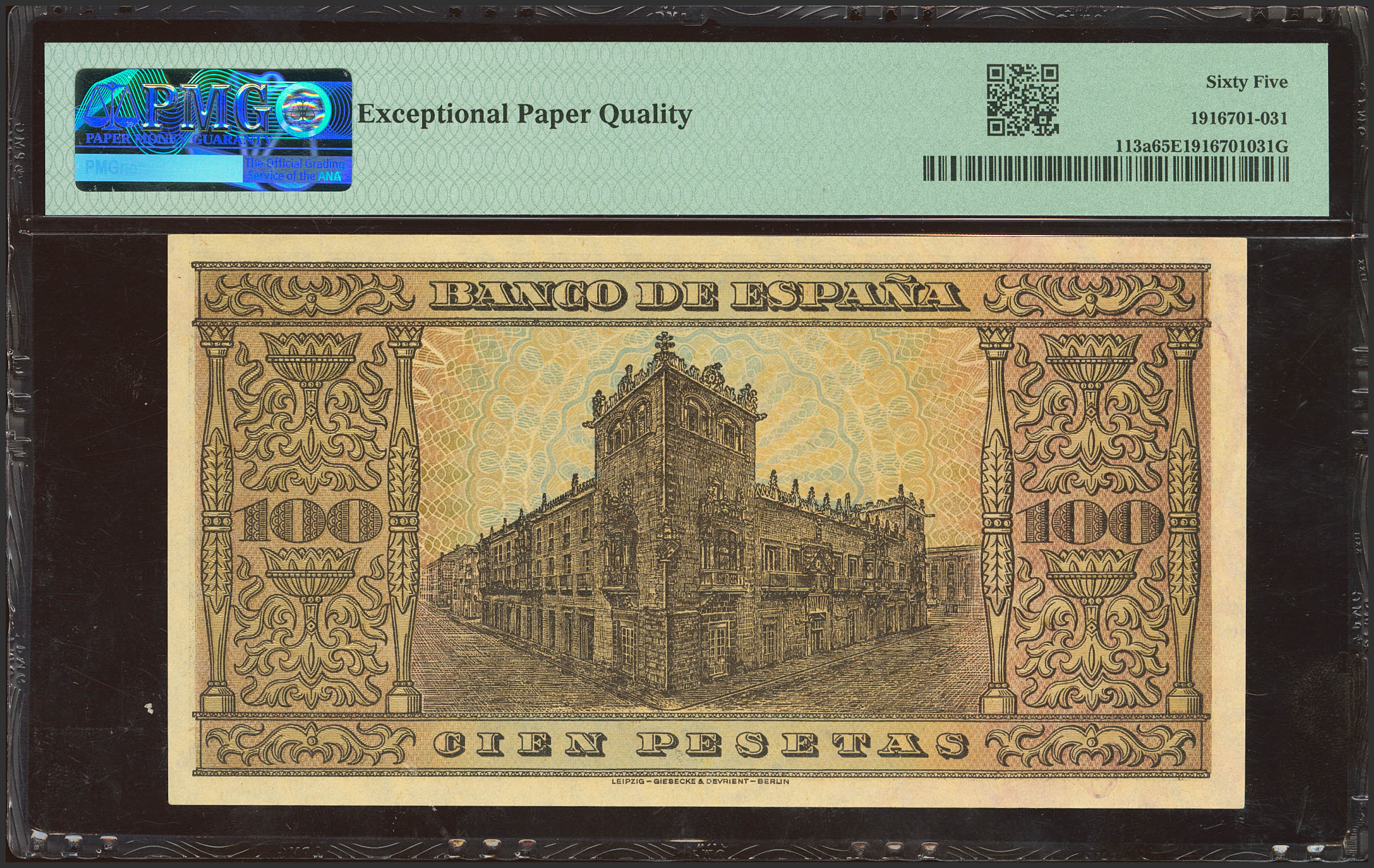 100 Pesetas. May 20, 1938. Series A. (Edifil 2023: 432, Pick: 113a). Very rare in this exceptional quality, original sizing. Uncirculated. PMG65EPQ package.