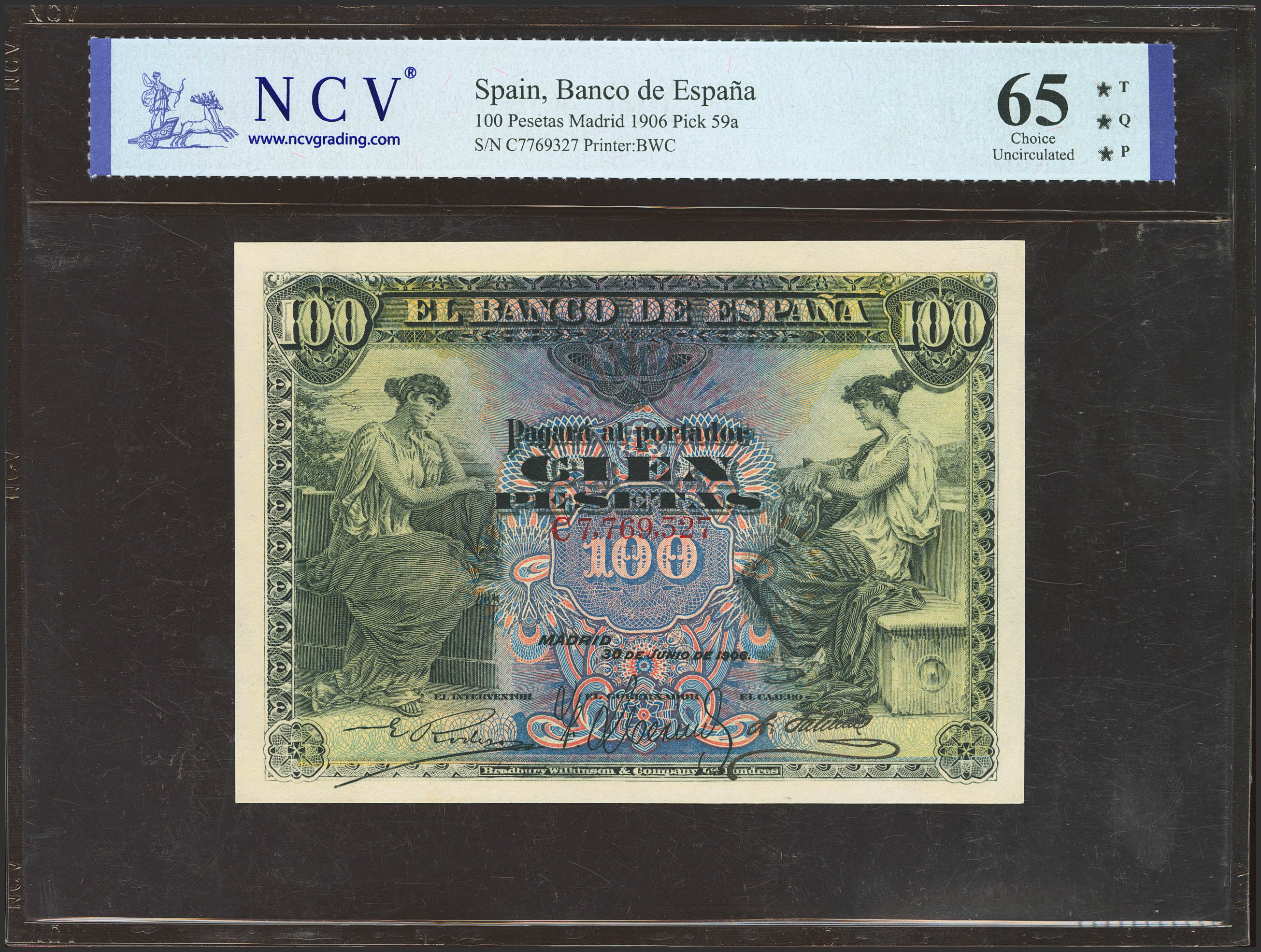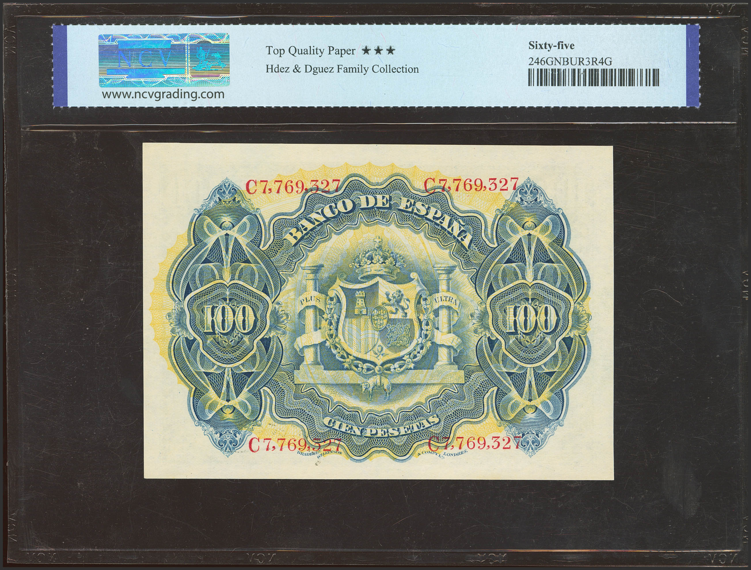 100 Pesetas. June 30, 1906. Series C. (Edifil 2021: 313a, 59a). Rare, especially in this exceptional quality, original sizing. Uncirculated. NCV65TQP package.