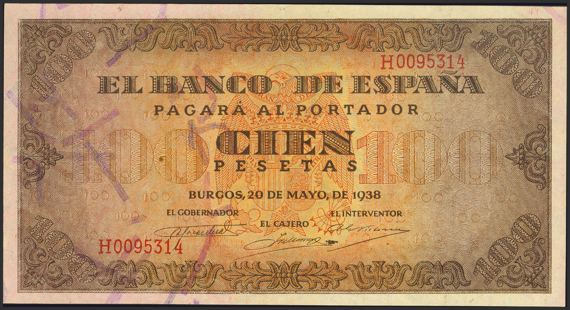 100 Pesetas. May 20, 1938. Series H, last series issued. (Edifil 2023: 432b). It retains part of the original finish. Extremely Fine.