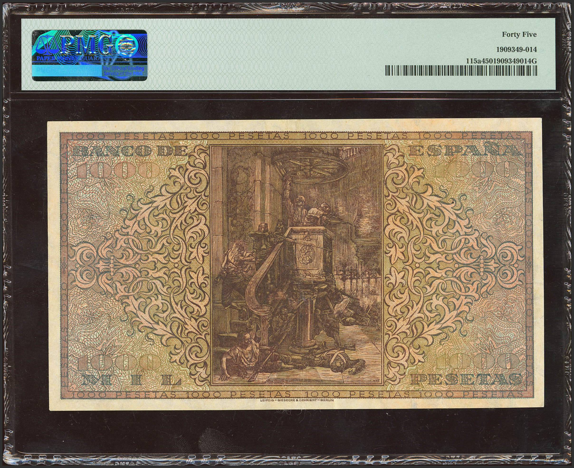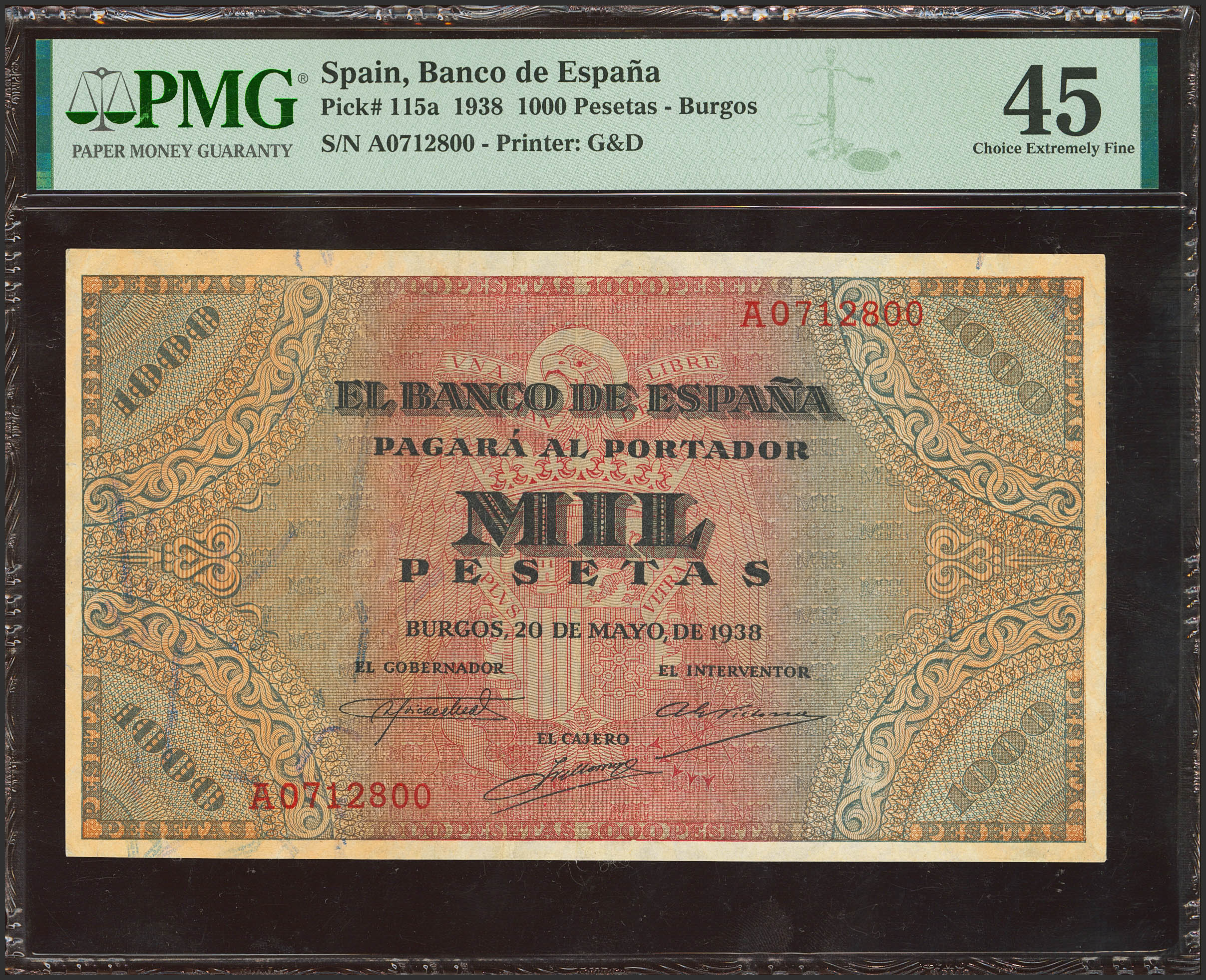 1000 Pesetas. May 20, 1938. Series A. (Edifil 2023: 434, Pick: 115a). Unusual. Extremely Fine-. PMG45 encapsulation.