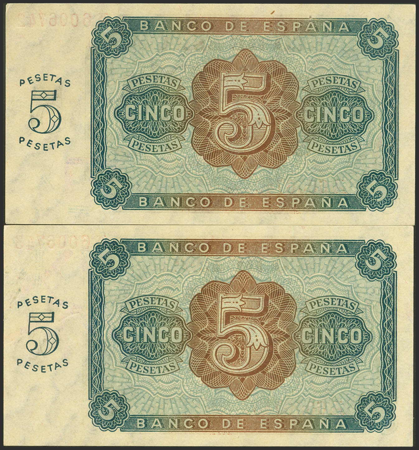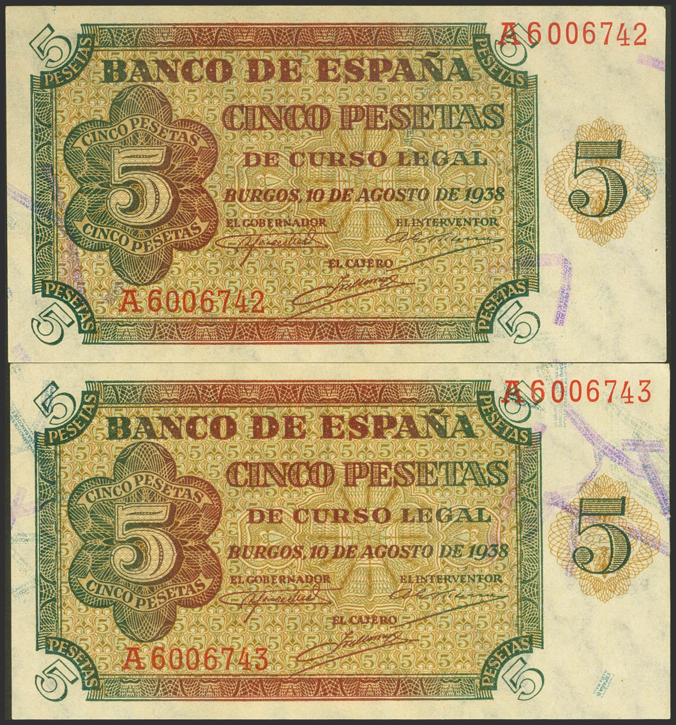 5 Pesetas. August 10, 1938. Correlative couple. Series A. (Edifil 2023: 435). It retains all its original finish. Good Extremely Fine++.