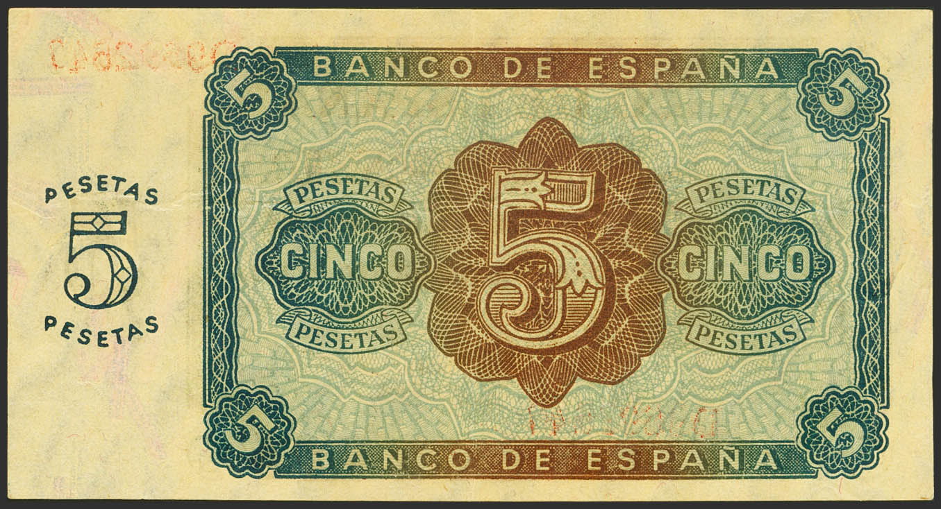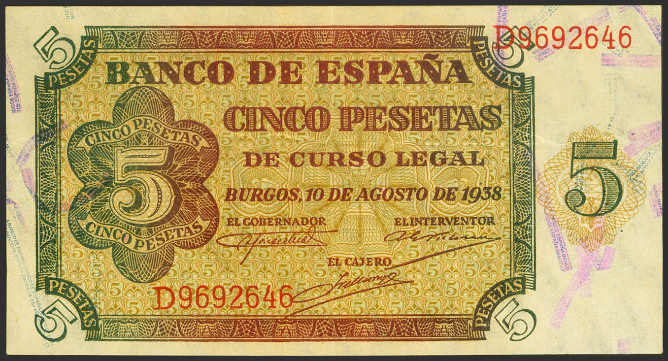 5 Pesetas. August 10, 1938. Series D. (Edifil 2021: 435a). It retains much of its original size and natural wrinkle of the paper. Good Extremely Fine.