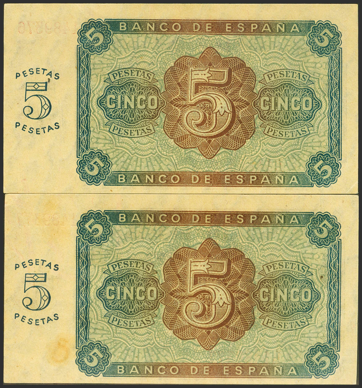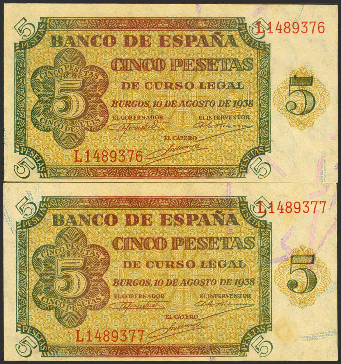 5 Pesetas. August 10, 1938. Correlative couple. Series L. (Edifil 2021: 435a). They retain all their original finish, one of them has a small shadow. Uncirculated/Uncirculated-.