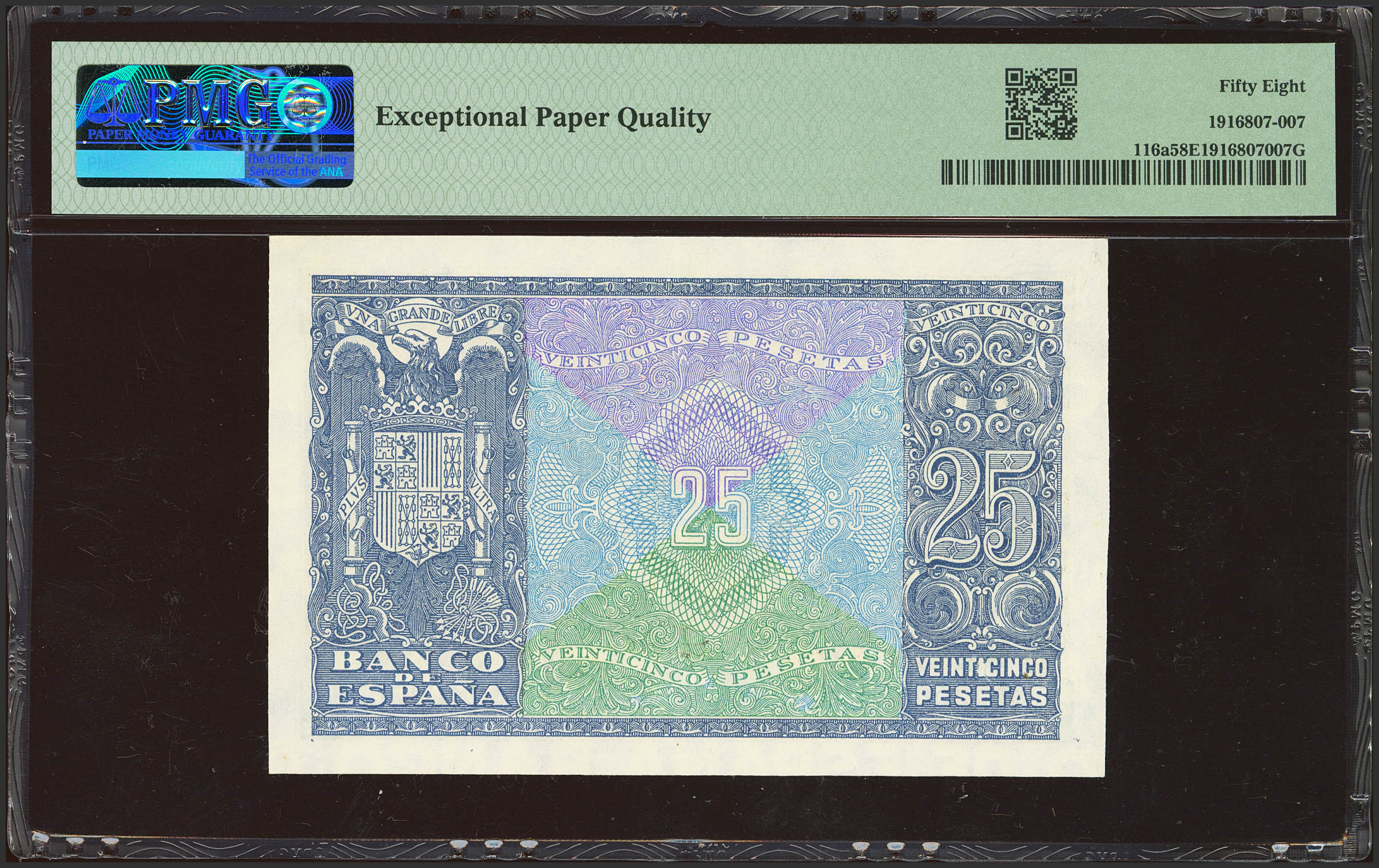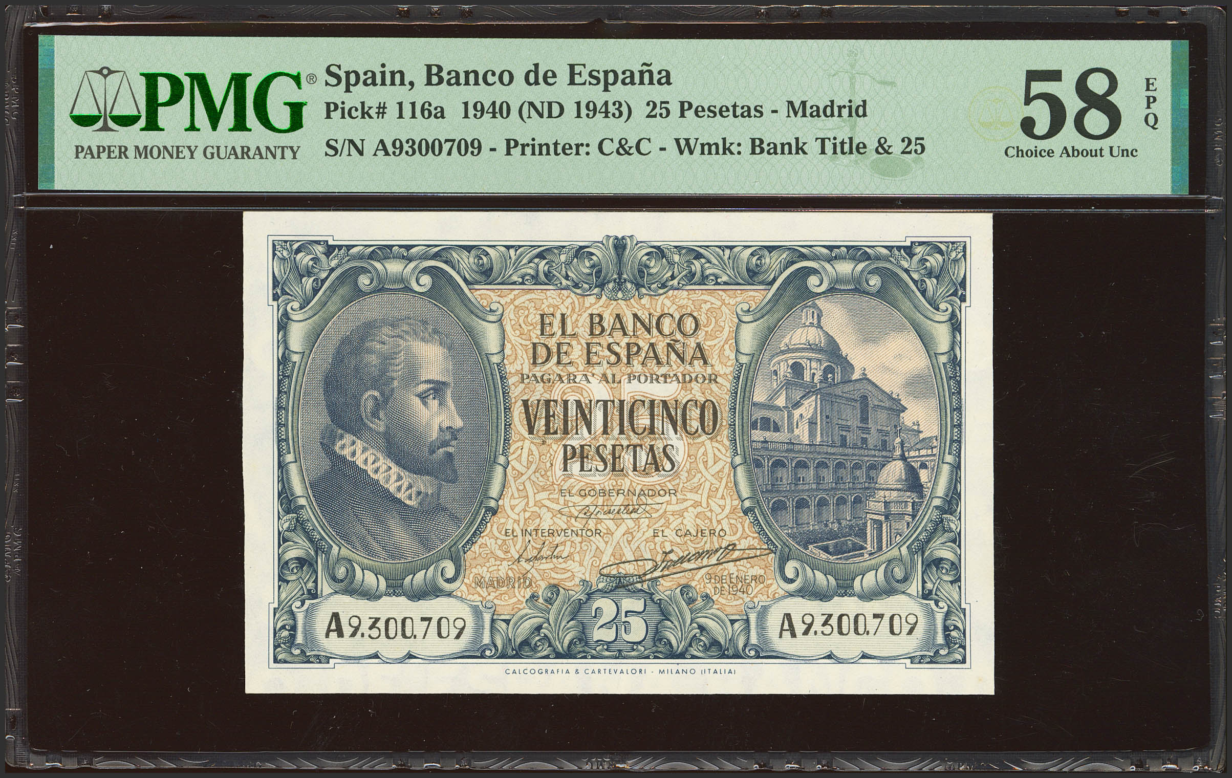 25 Pesetas. January 9, 1940. Series A. (Edifil 2023: 436, Pick: 116a). Original sizing. Good Extremely Fine++. PMG58EPQ package.