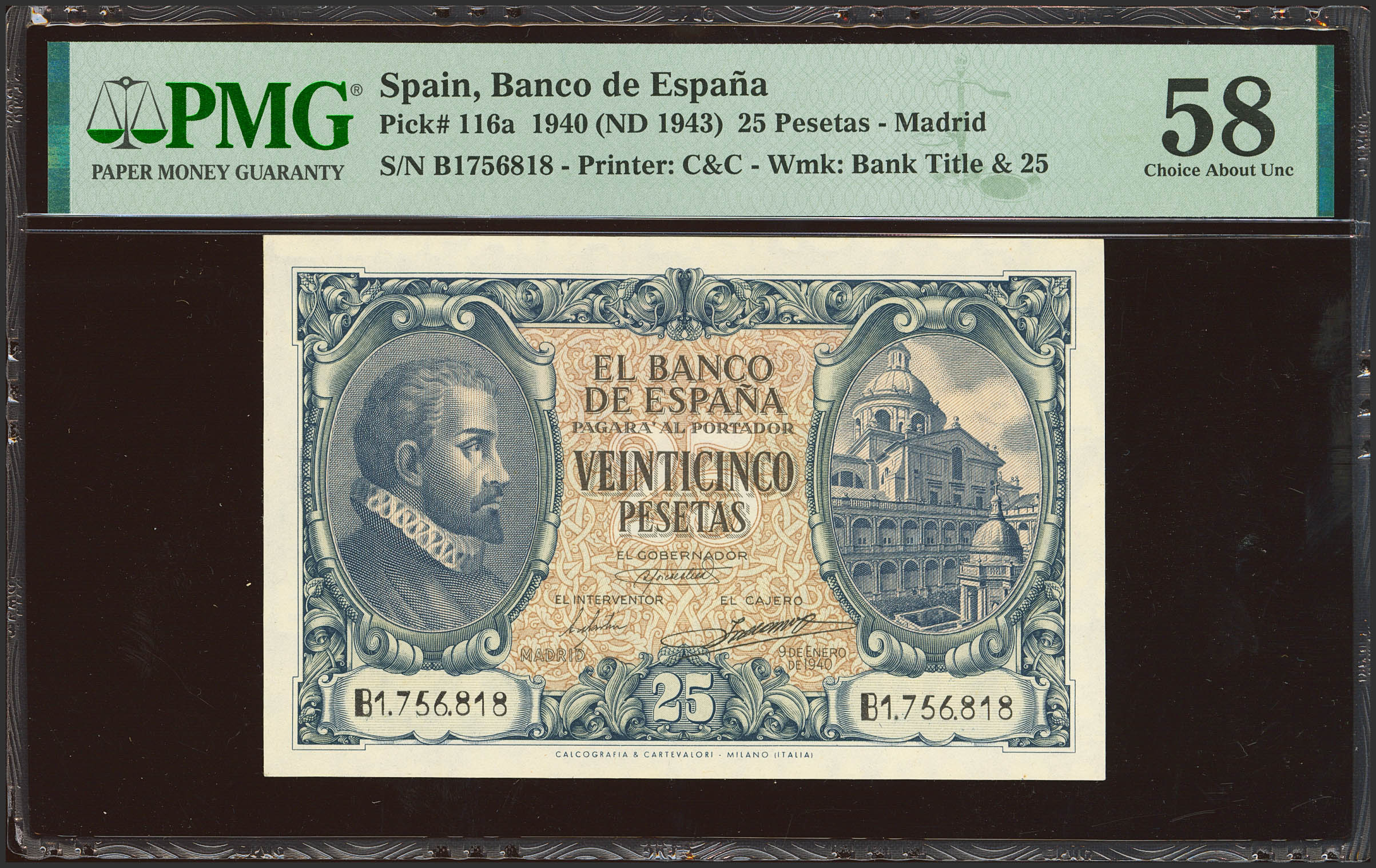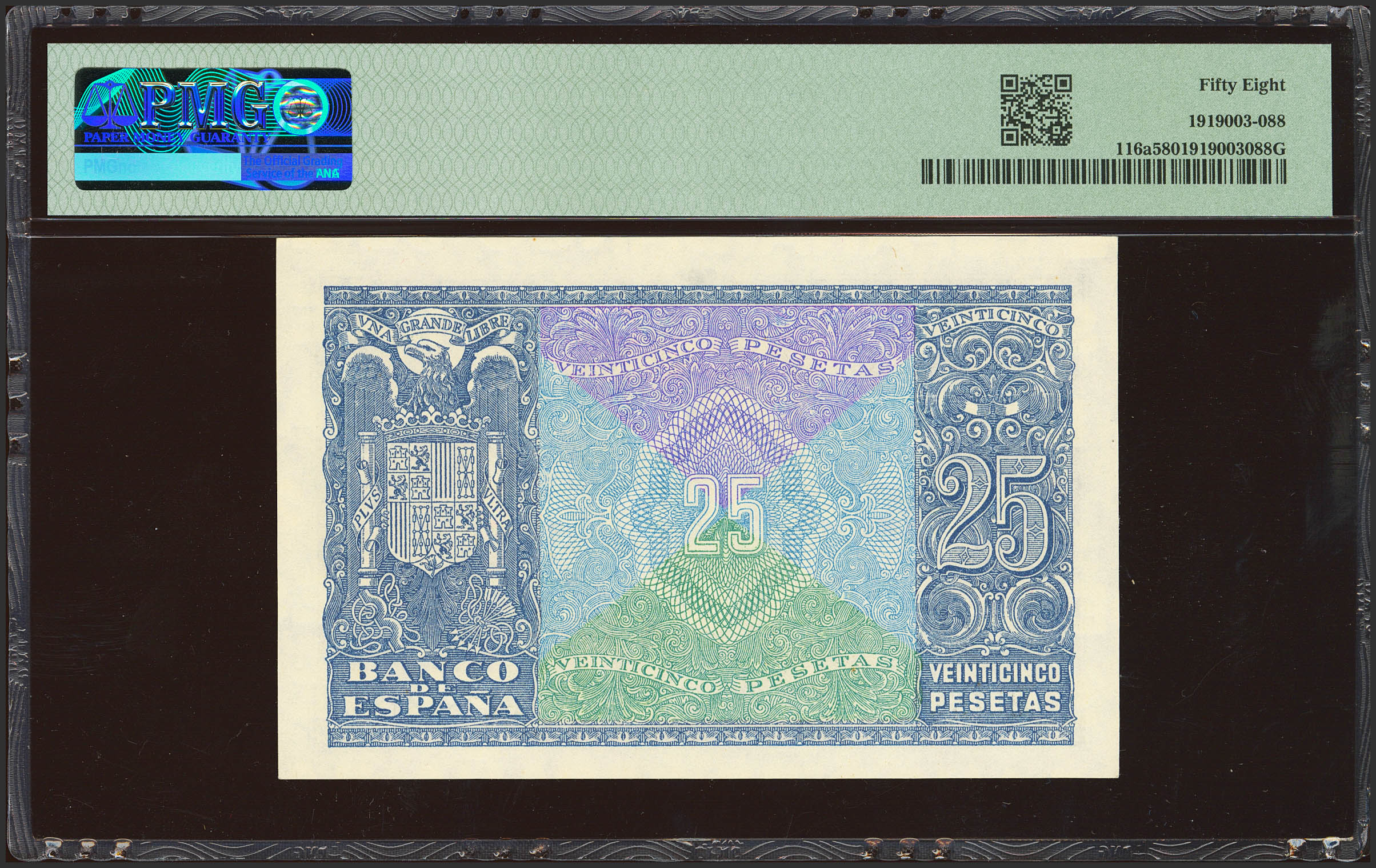 25 Pesetas. January 9, 1940. Series B. (Edifil 2023: 436a, Pick: 116a). Unusual. Good Extremely Fine+. PMG58 encapsulation.