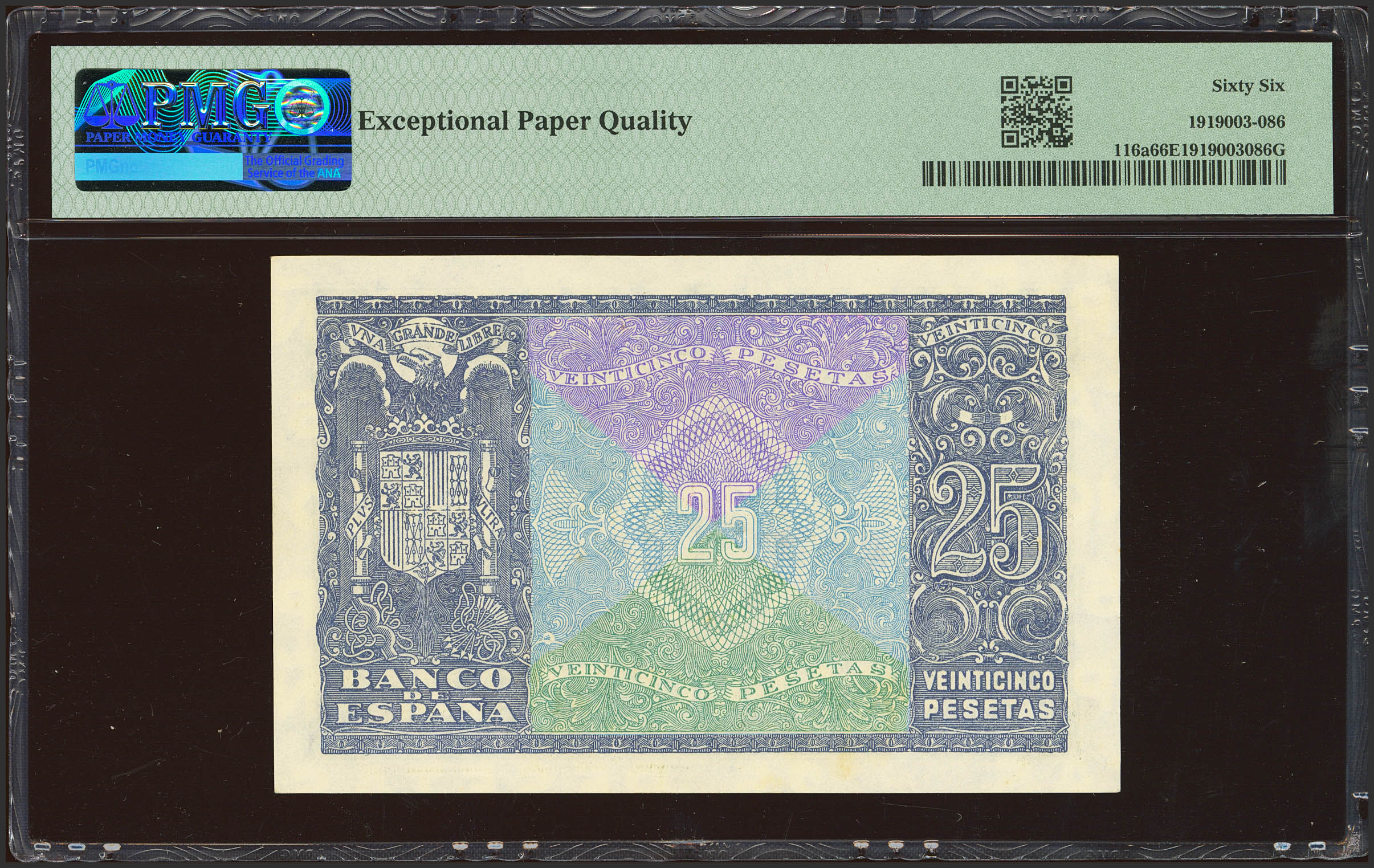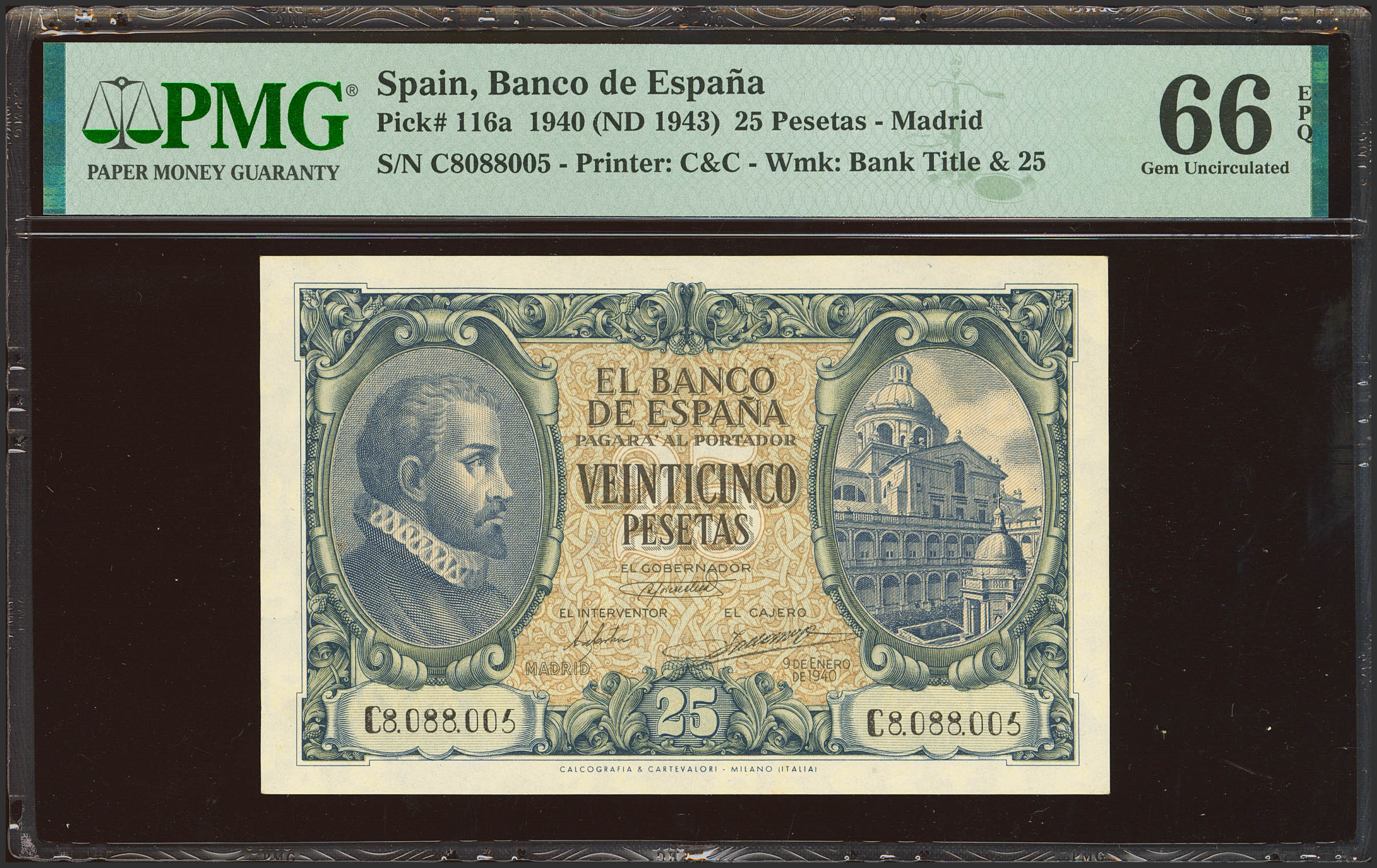 25 Pesetas. January 9, 1940. Series C. (Edifil 2023: 436a, Pick: 116a). Rare in this exceptional quality, original sizing. Uncirculated. PMG66EPQ package.