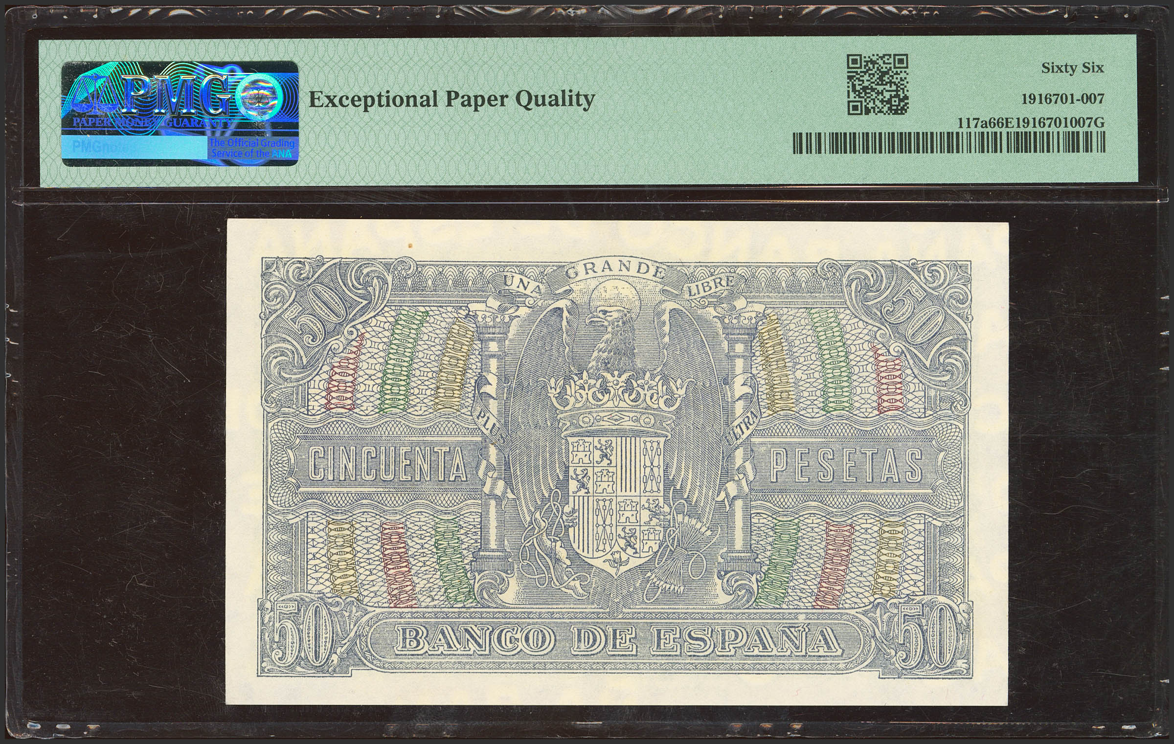 50 Pesetas. January 9, 1940. Series B. (Edifil 2023: 437a, Pick: 117a). Rare in this exceptional quality, original sizing. Uncirculated. PMG66EPQ package