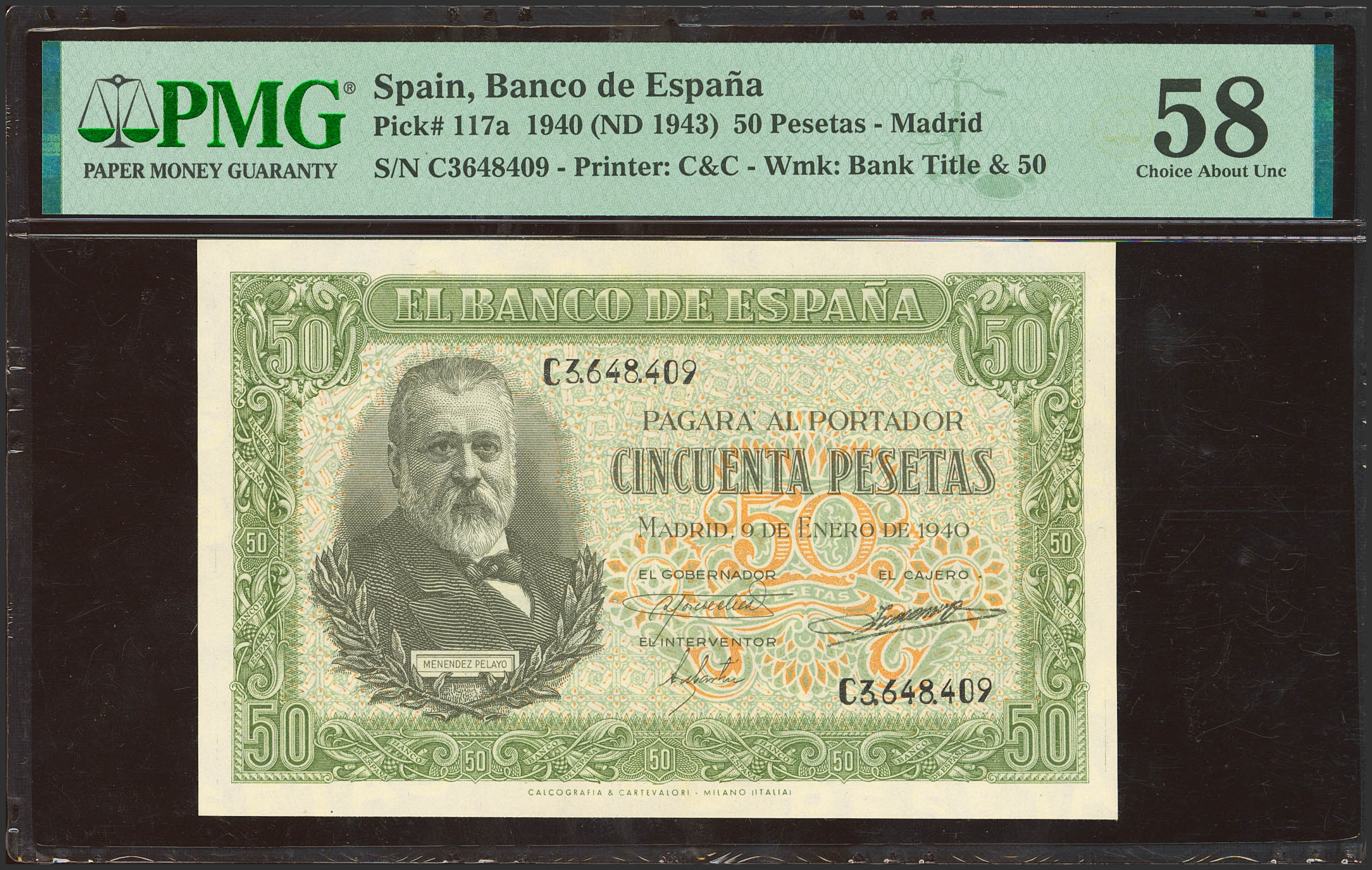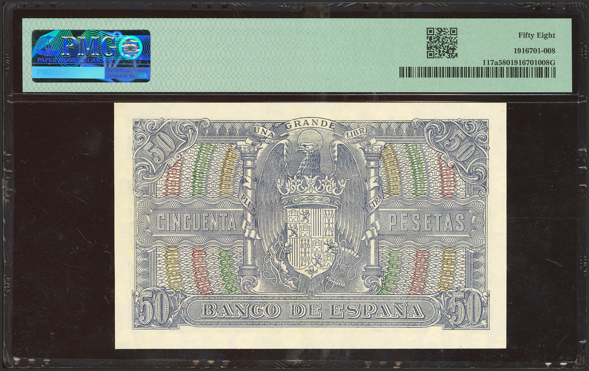 50 Pesetas. January 9, 1940. Series C. (Edifil 2023: 437a, Pick: 117a). Unusual. Good Extremely Fine+. PMG58 encapsulation.