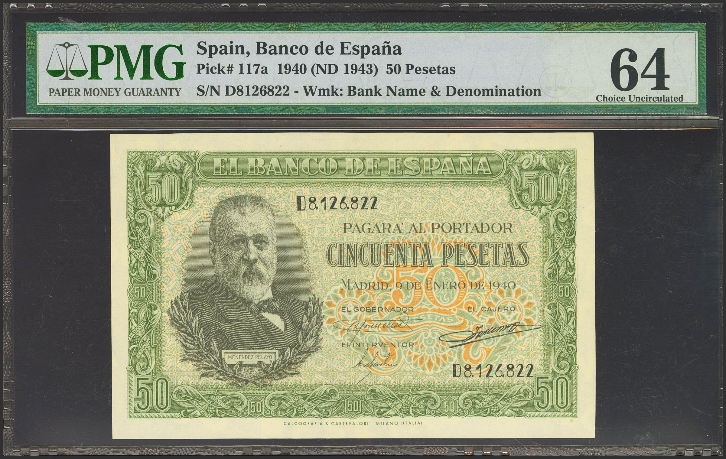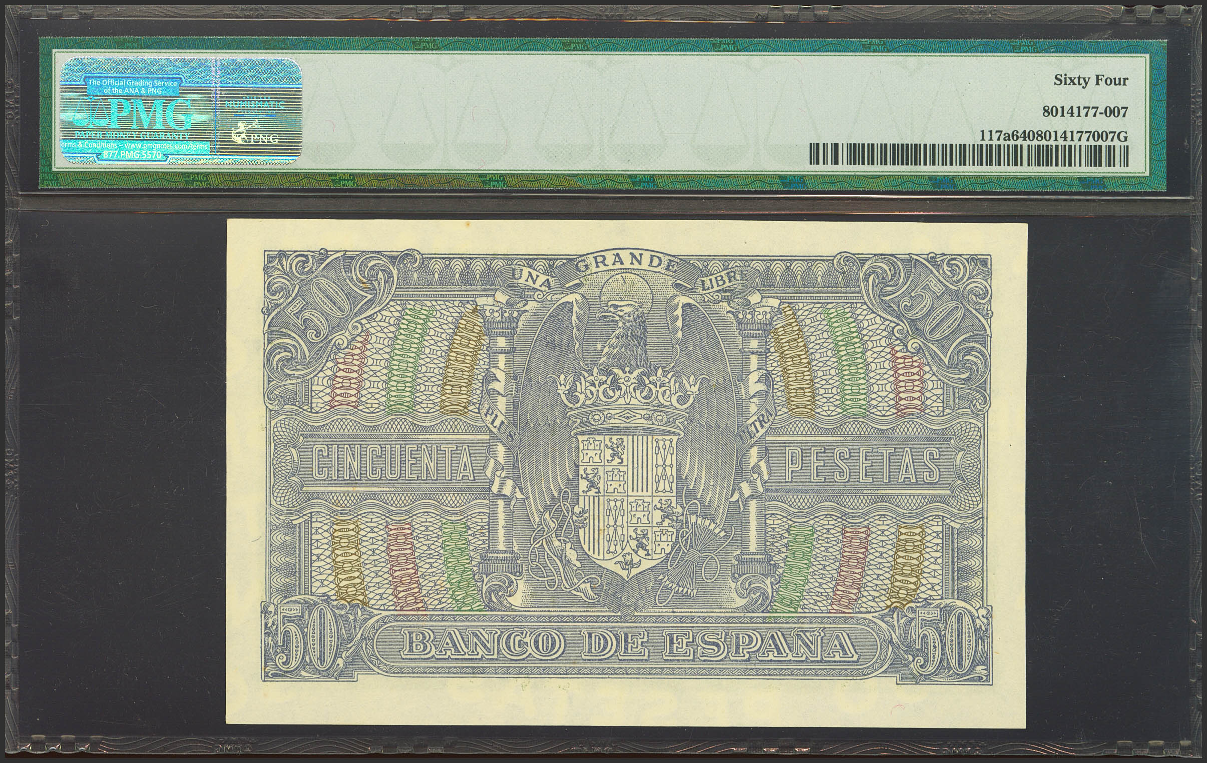 50 Pesetas. January 9, 1940. Series D. (Edifil 2023: 437a, Pick: 117a). Unusual in this quality. Uncirculated. PMG64 encapsulation.