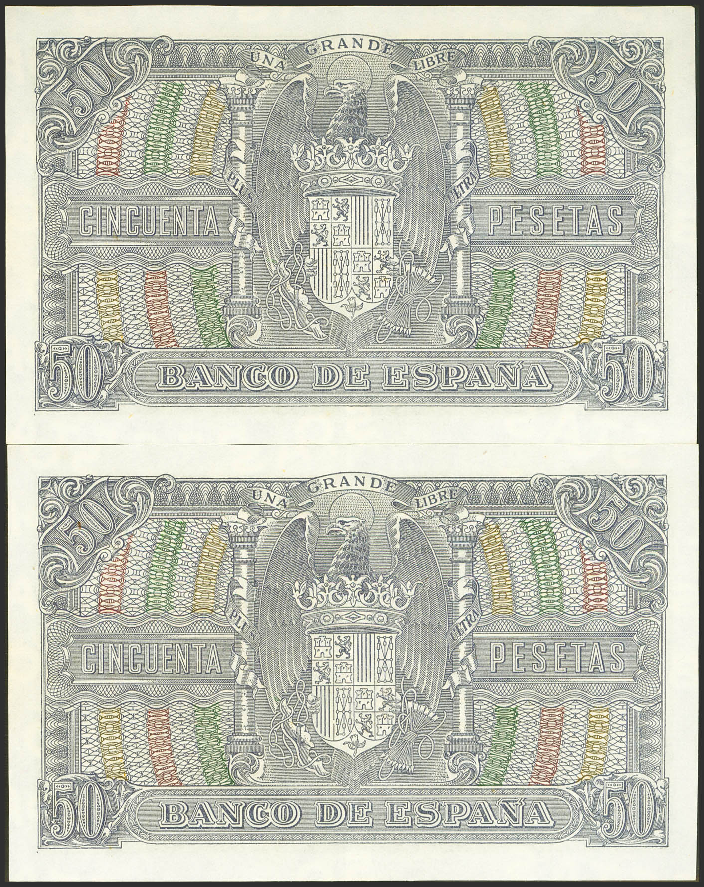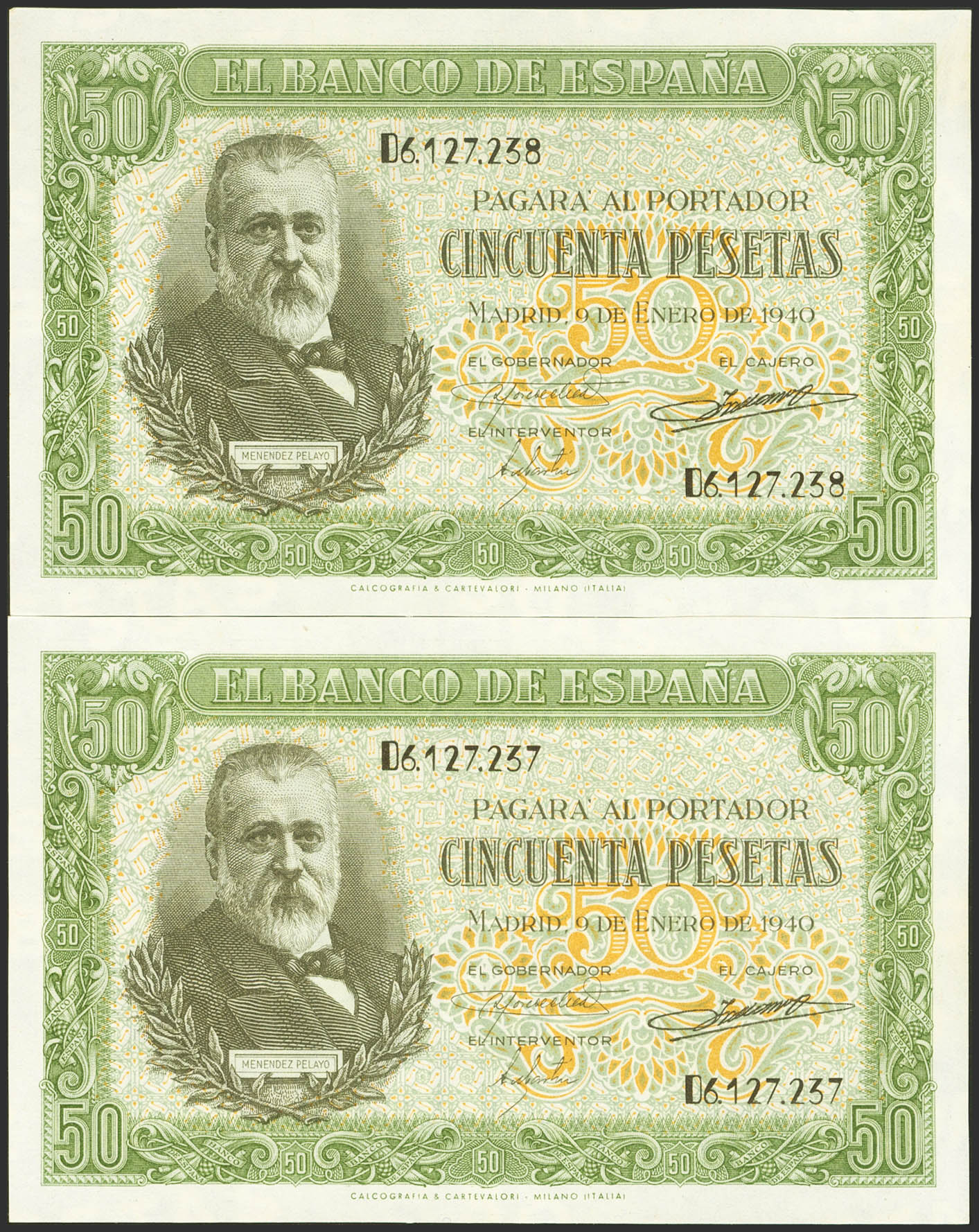 50 Pesetas. January 9, 1940. Correlative pair. Series D. (Edifil 2023: 437a). Unusual, it retains part of its original finish. Good Extremely Fine+.