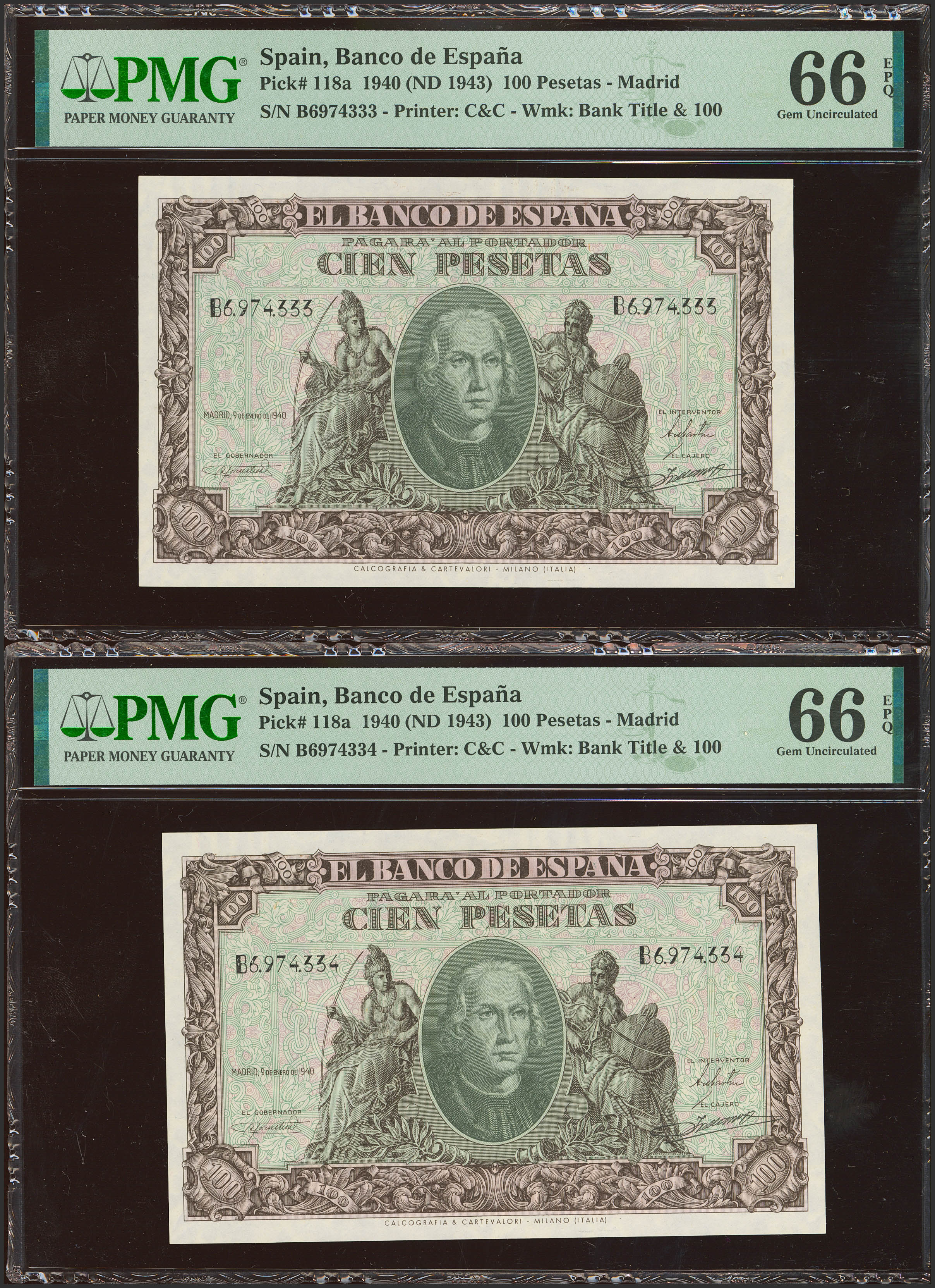 English 100 Pesetas. January 9, 1940. Correlative couple. Series B. (Edifil 2023: 438a, Pick: 118a). Very rare in this exceptional quality, original sizing. Uncirculated. PMG66EPQ packages, both.