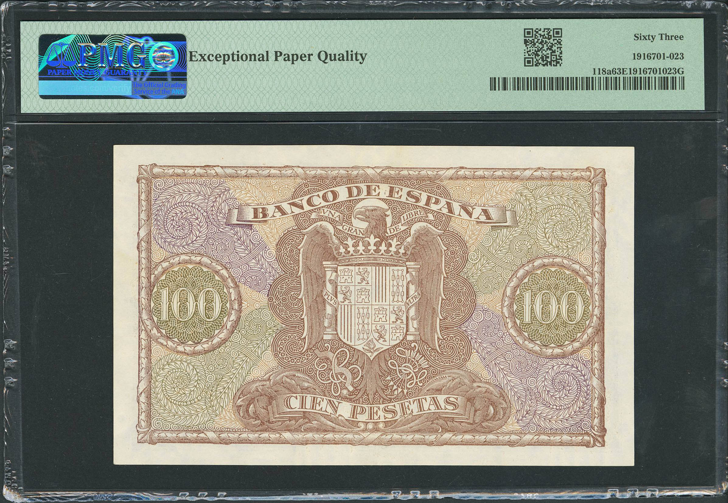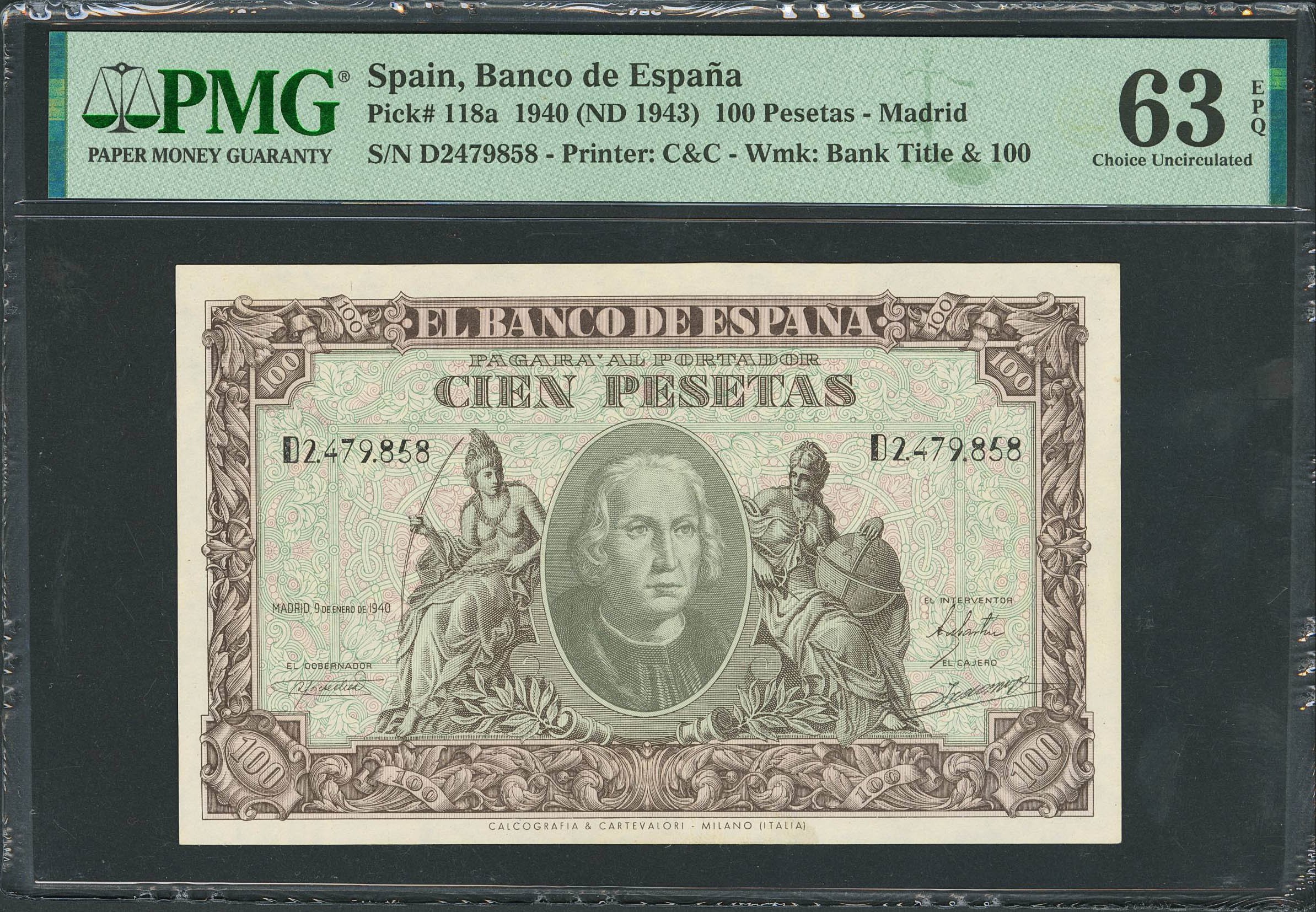 100 Pesetas. January 9, 1940. Series D. (Edifil 2023: 438a, Pick: 118a). Very rare in this exceptional quality, original sizing. Uncirculated. PMG63EPQ package.