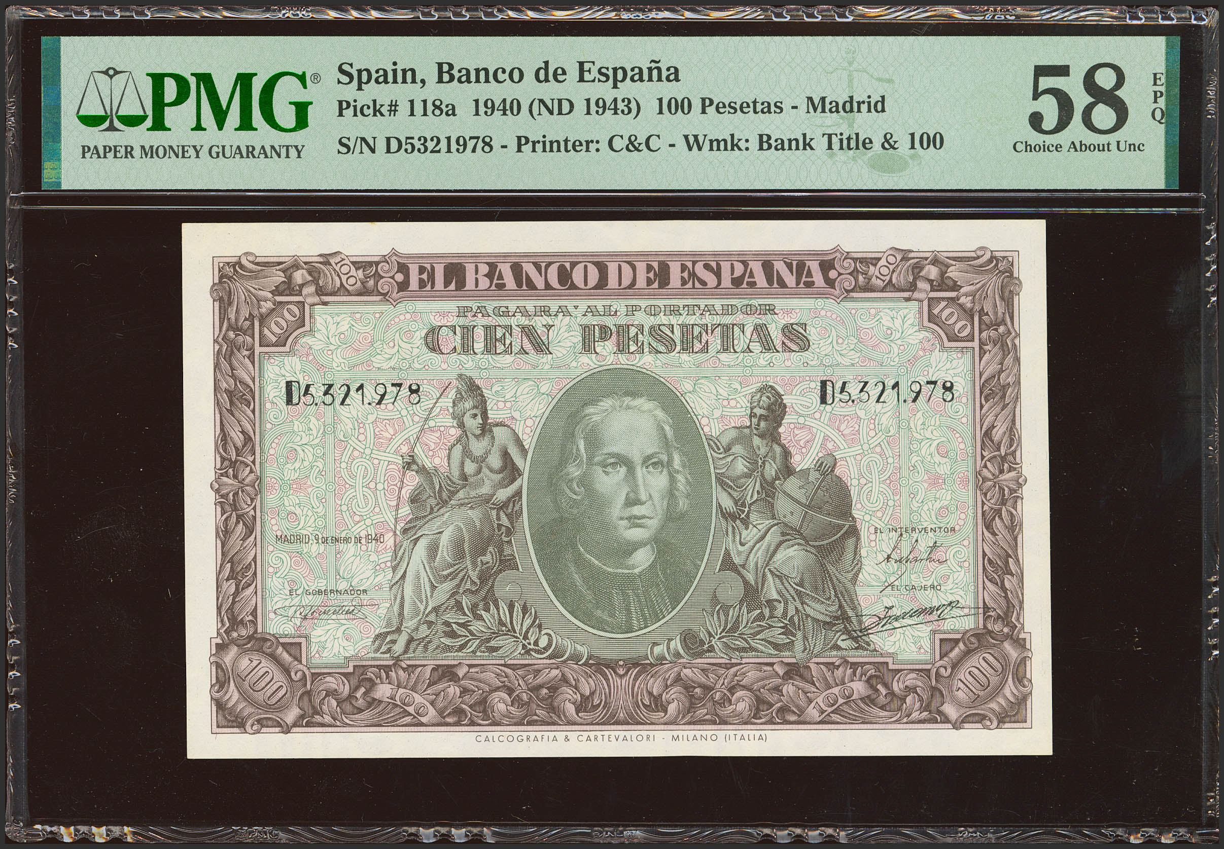 100 Pesetas. January 9, 1940. Series D. (Edifil 2023: 438a, Pick: 118a). Unusual, original sizing. Good Extremely Fine++. PMG58EPQ package.