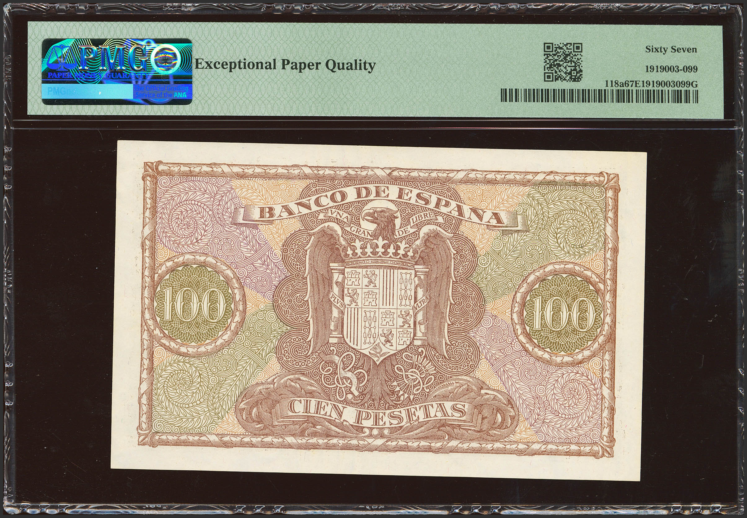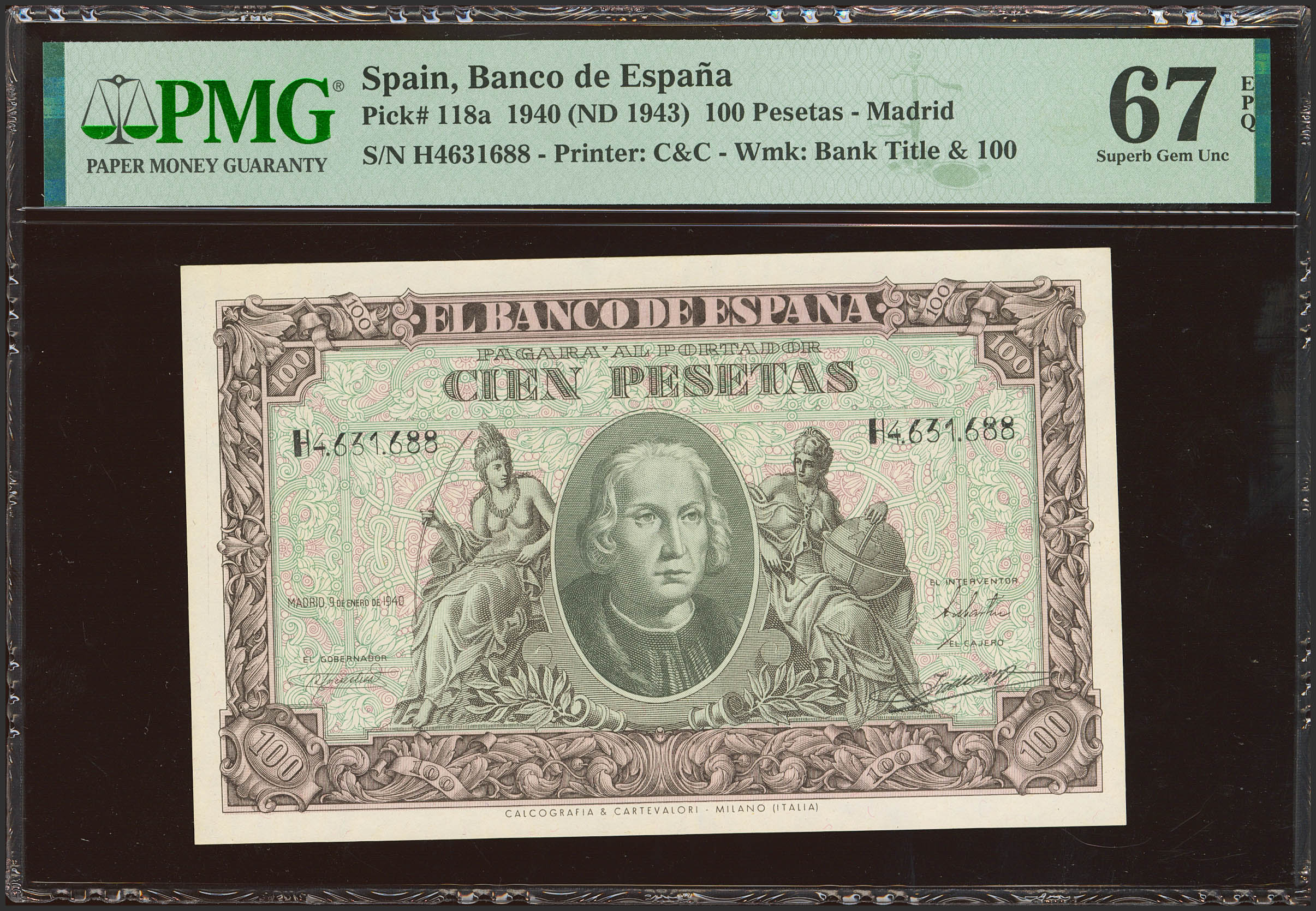 English 100 Pesetas. January 9, 1940. Series H. (Edifil 2023: 438a, Pick: 118a). Very rare in this exceptional quality, original sizing. Uncirculated. PMG67EPQ package.