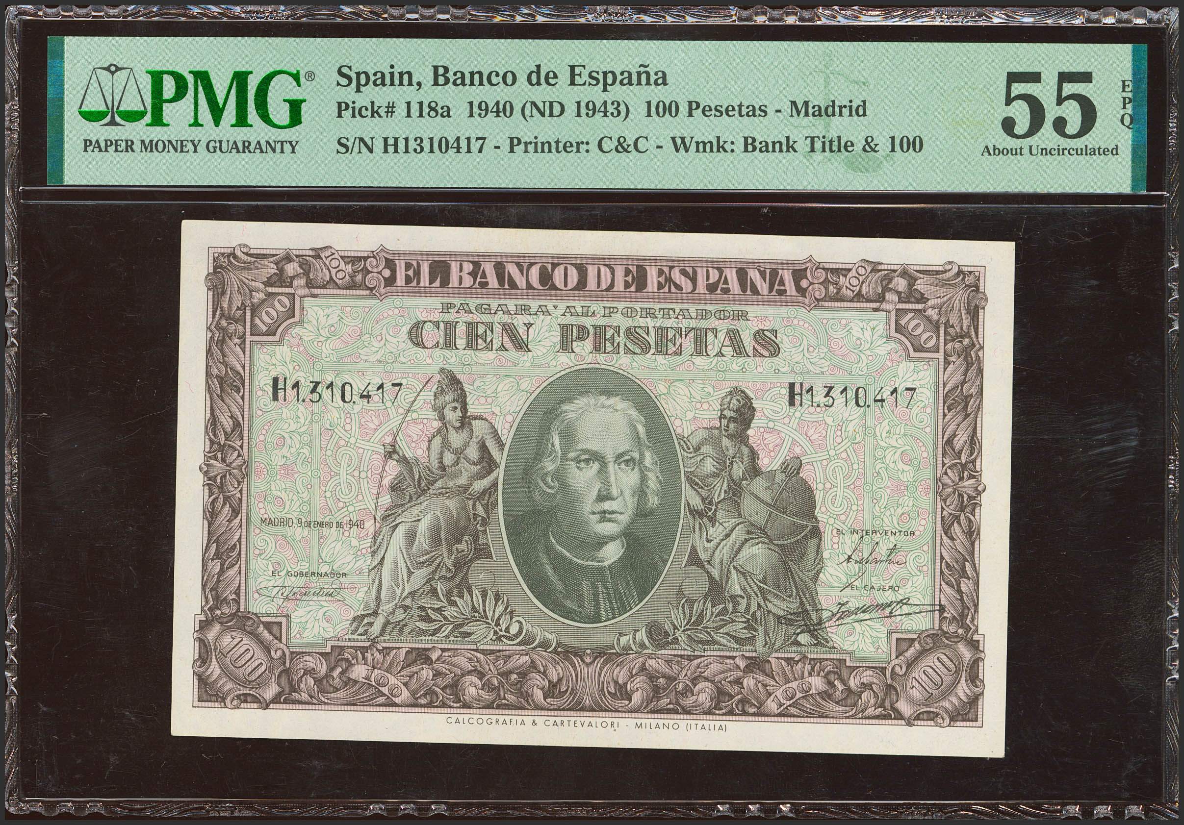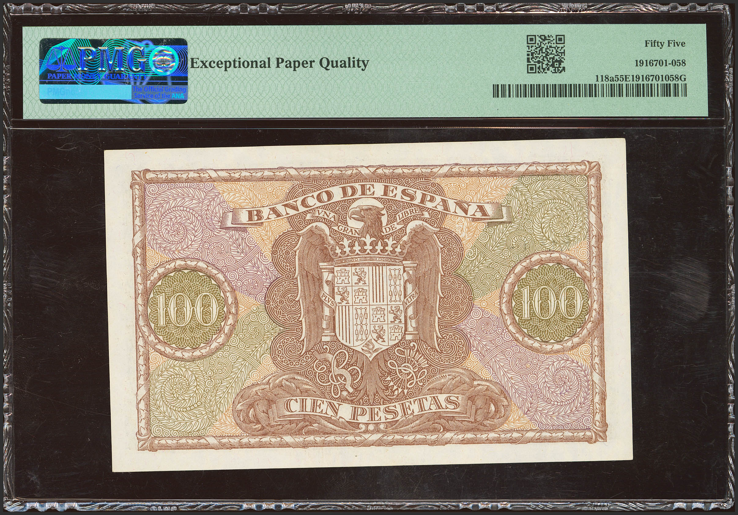 100 Pesetas. January 9, 1940. Series H. (Edifil 2023: 438a, Pick: 118a). Original sizing. Good Extremely Fine+. PMG55EPQ package.