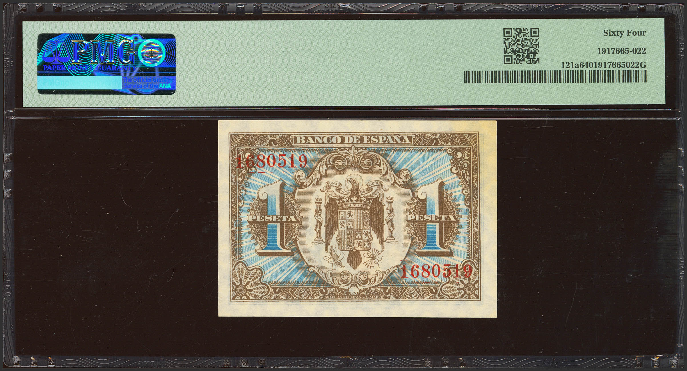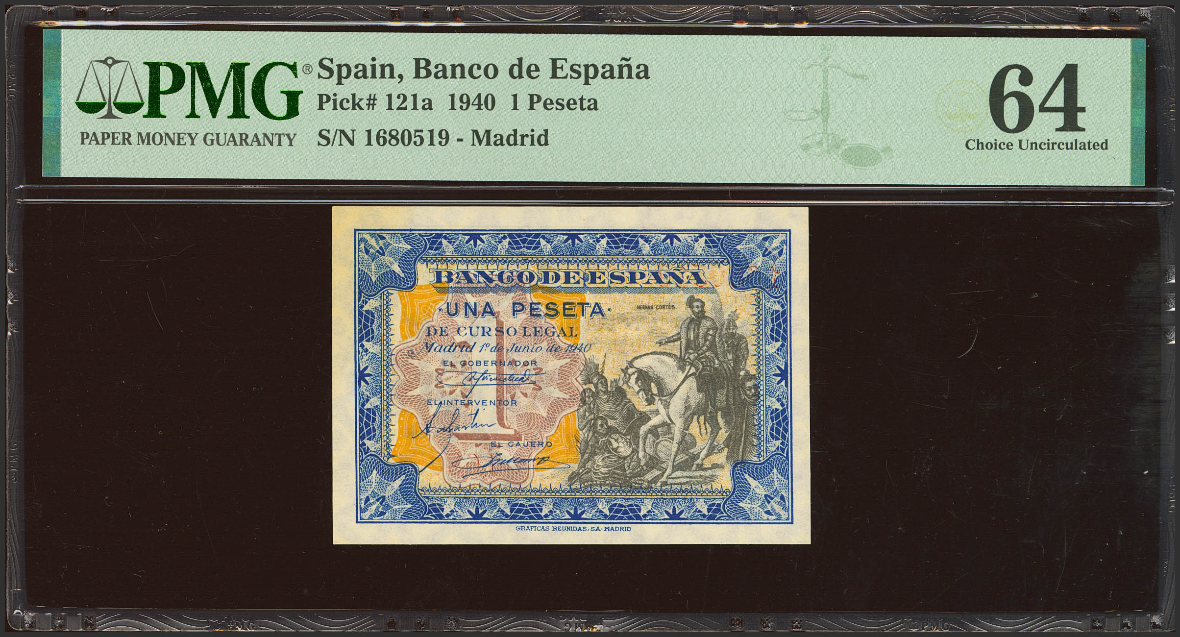 English 1 Peseta. June 1, 1940. No series. (Edifil 2021: 441, Pick: 121a). Unusual. Uncirculated. PMG64 encapsulation.