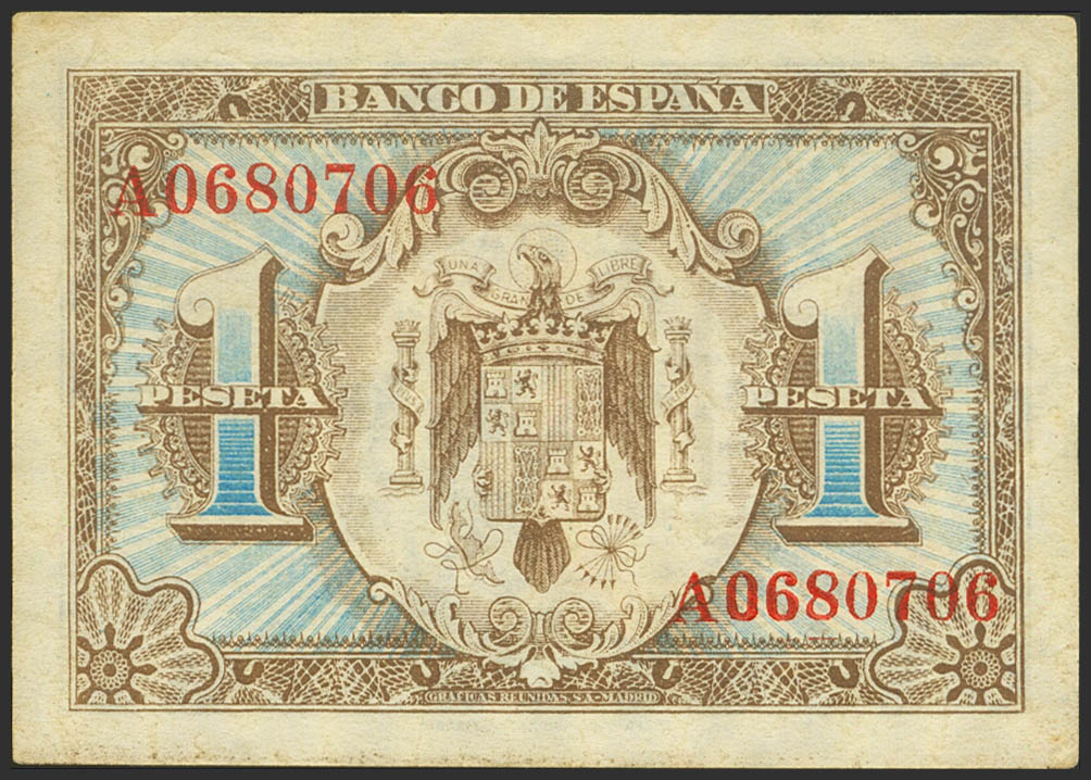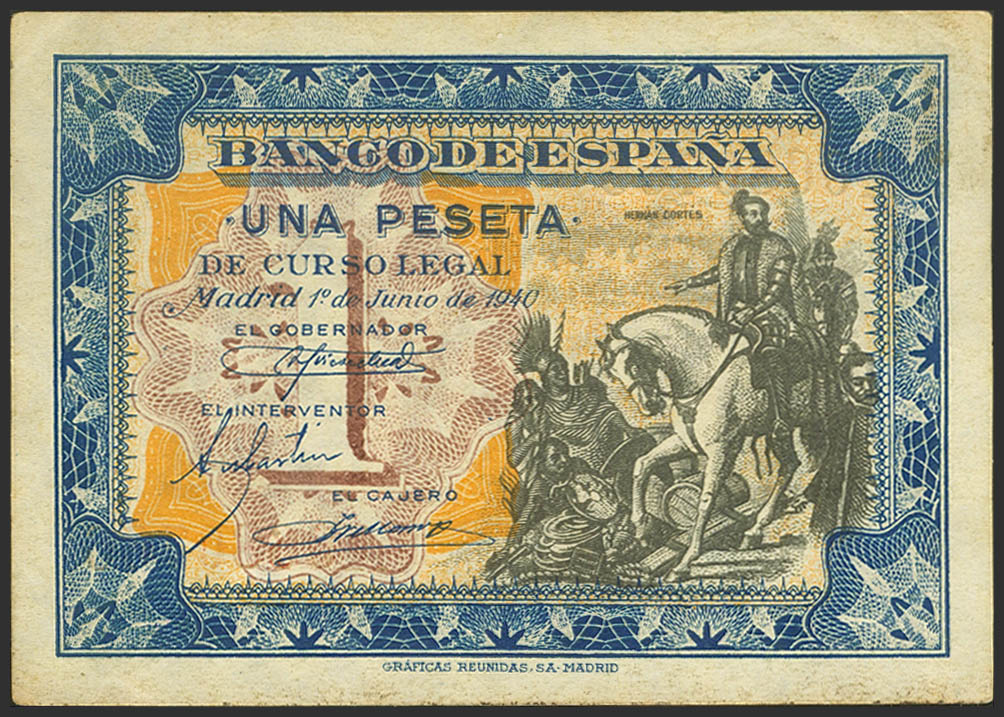 English 1 Peseta. June 1, 1940. Series A. (Edifil 2023: 441a). It retains part of the original, toned finish. Uncirculated--.