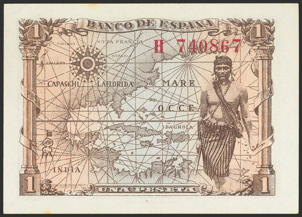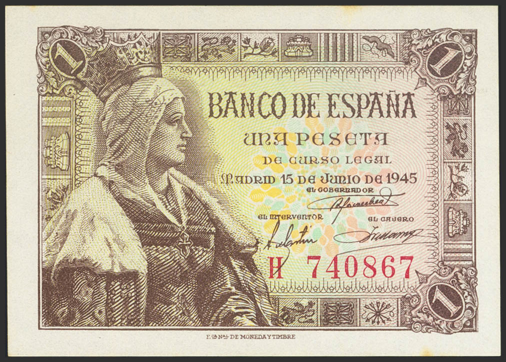 1 Peseta. June 15, 1945. Series H. (Edifil 2023: 448a). Original sizing, time stains. Uncirculated-.