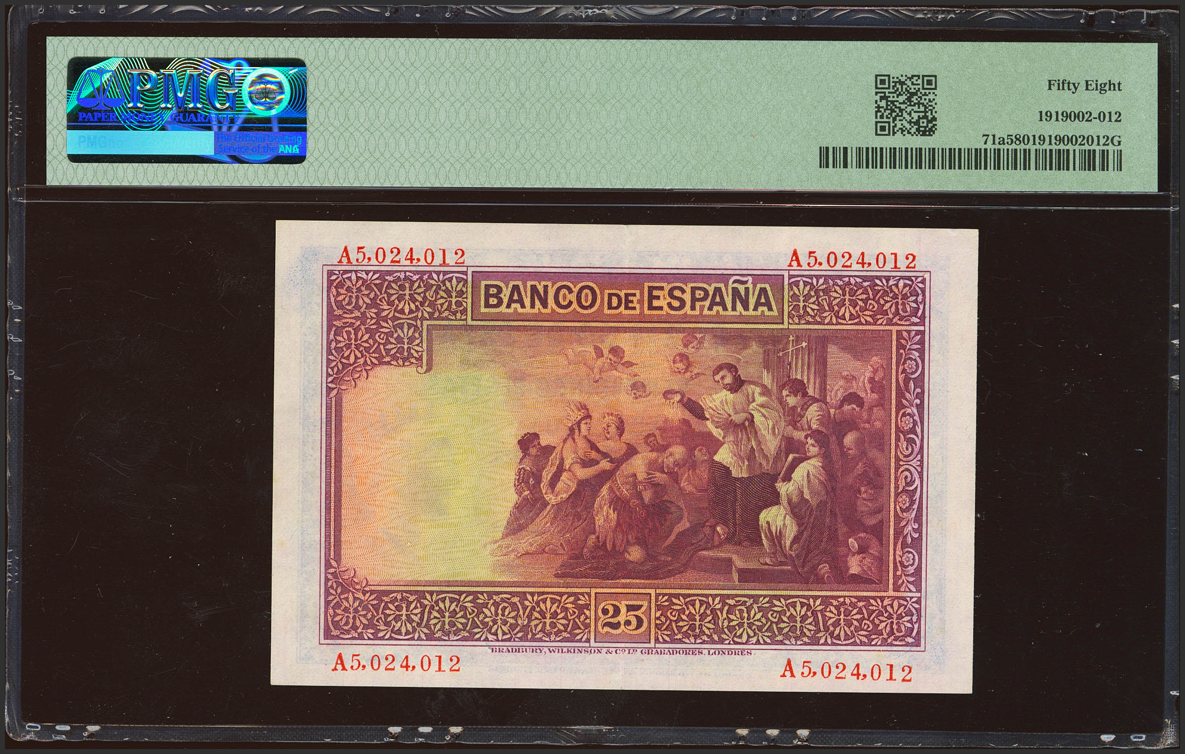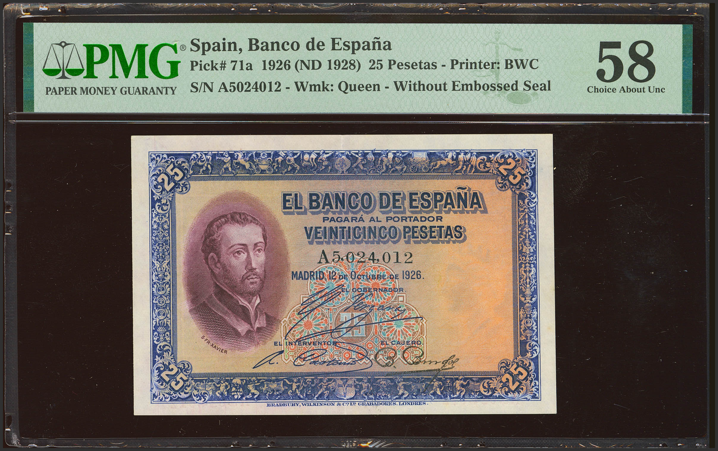 25 Pesetas. October 12, 1926. Series A. (Edifil 2023: 325a, Pick: 71a). Unusual in this quality. Good Extremely Fine+. PMG58 encapsulation.