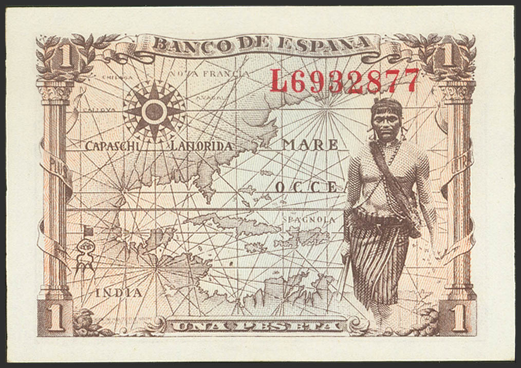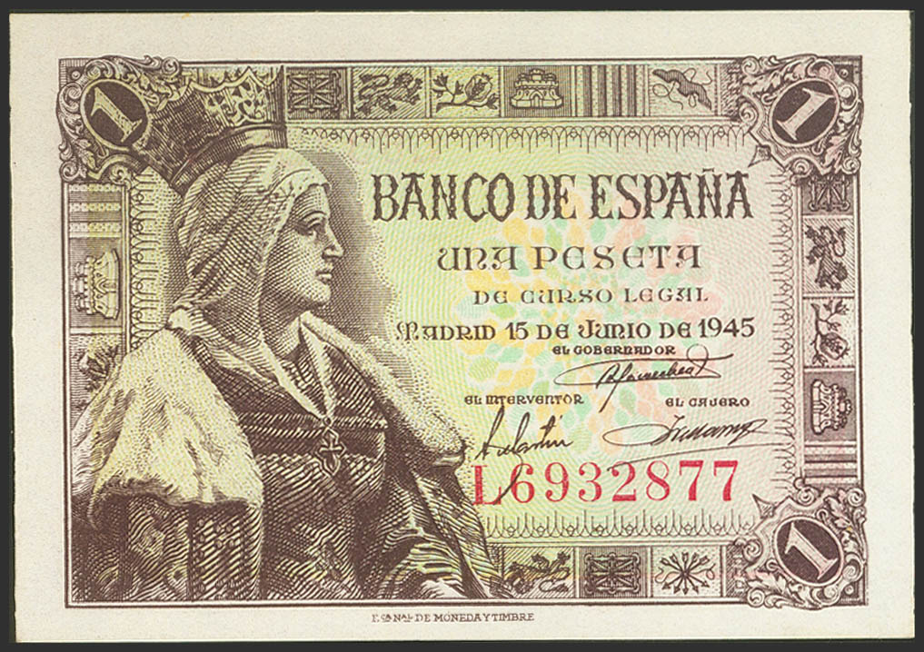 1 Peseta. June 15, 1945. Series L. (Edifil 2023: 448a). Original sizing. Uncirculated.