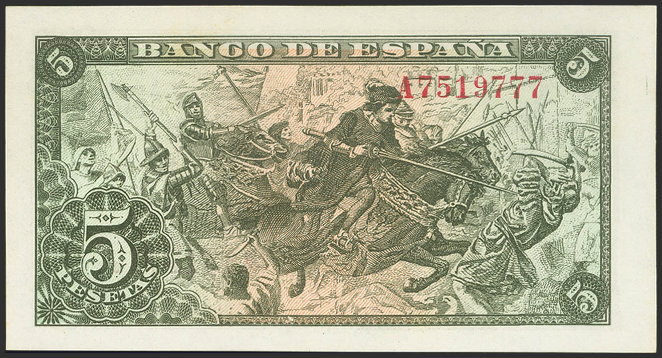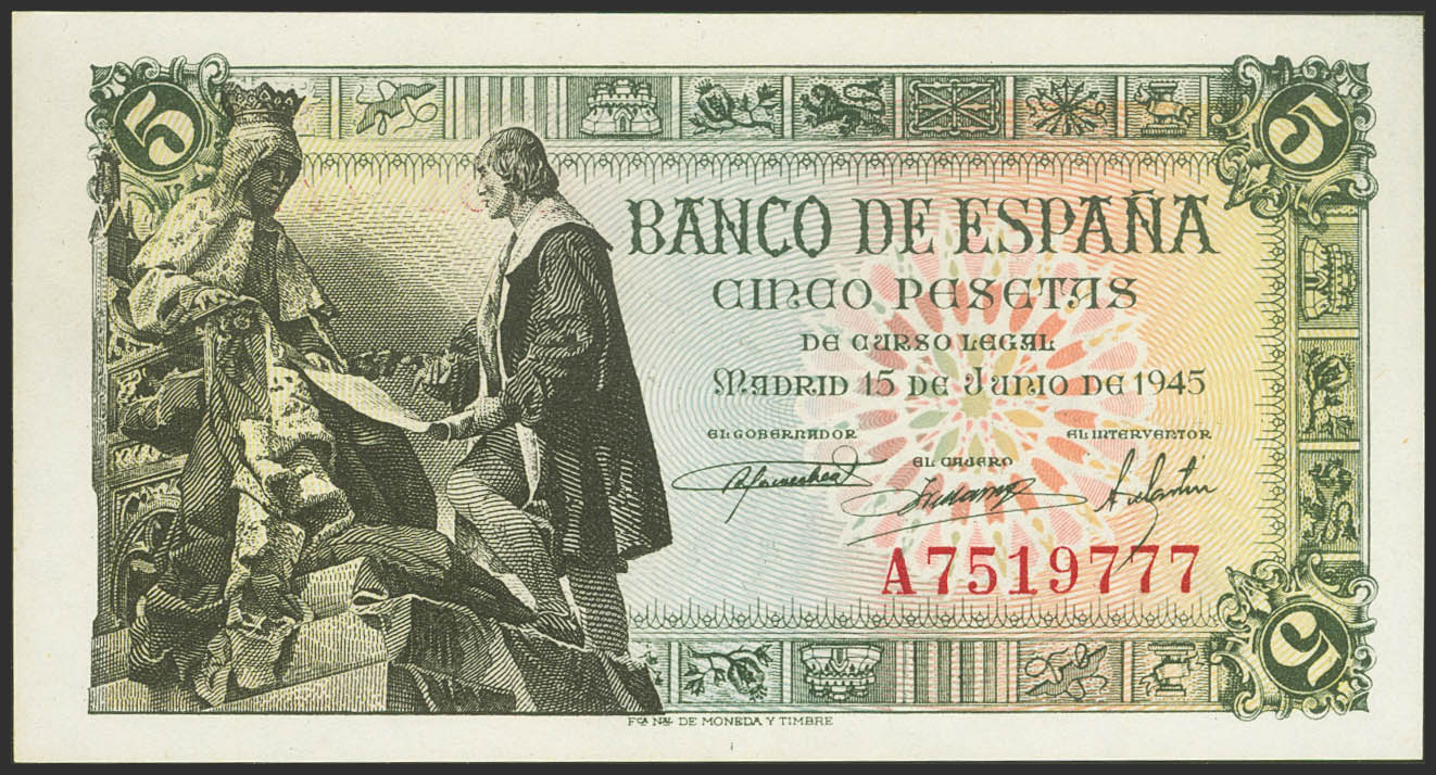 5 Pesetas. June 15, 1945. Series A. (Edifil 2023: 449a). Original sizing. Uncirculated.