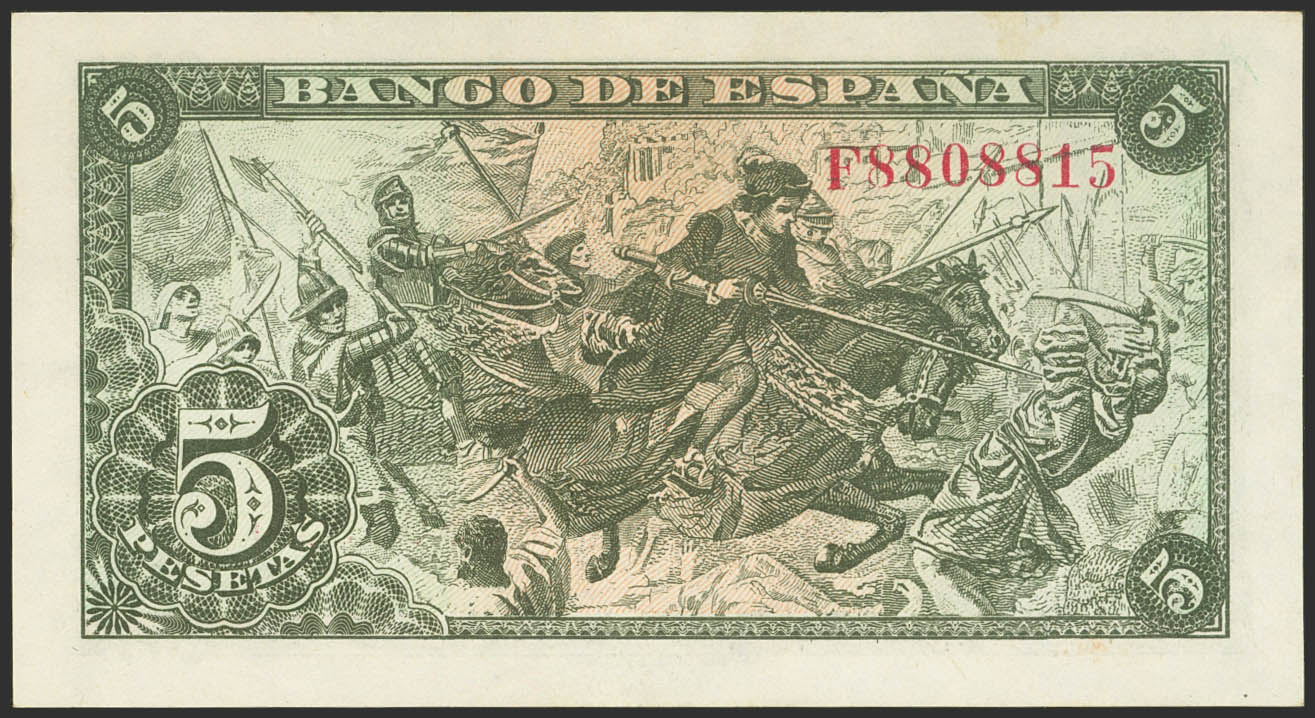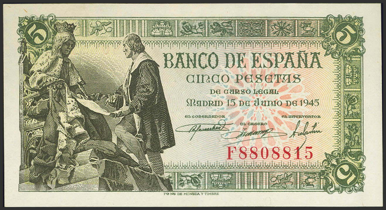 5 Pesetas. July 15, 1945. Series F. (Edifil 2023: 449a). Original sizing. Uncirculated.