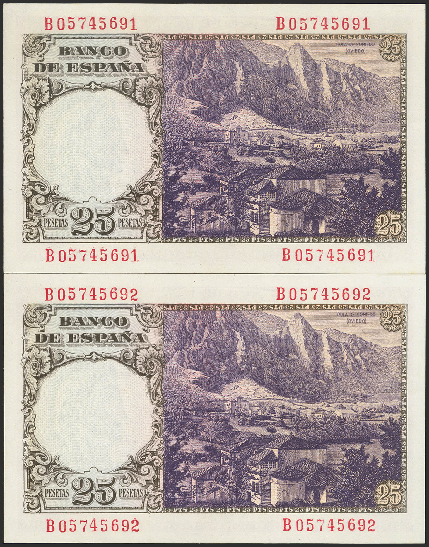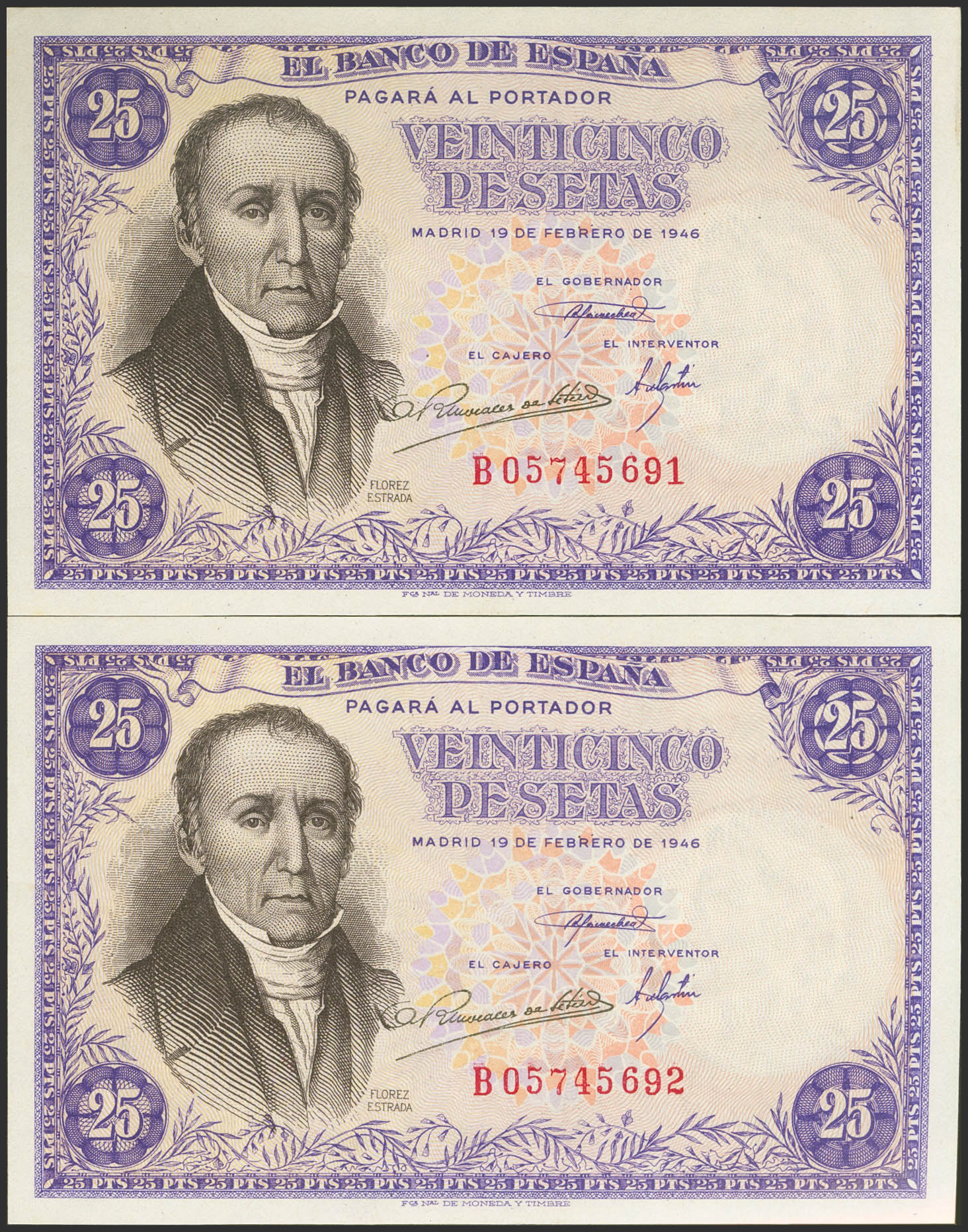25 Pesetas. February 19, 1946. Correlative couple. Series B. (Edifil 2023: 450a). Original sizing. Uncirculated.