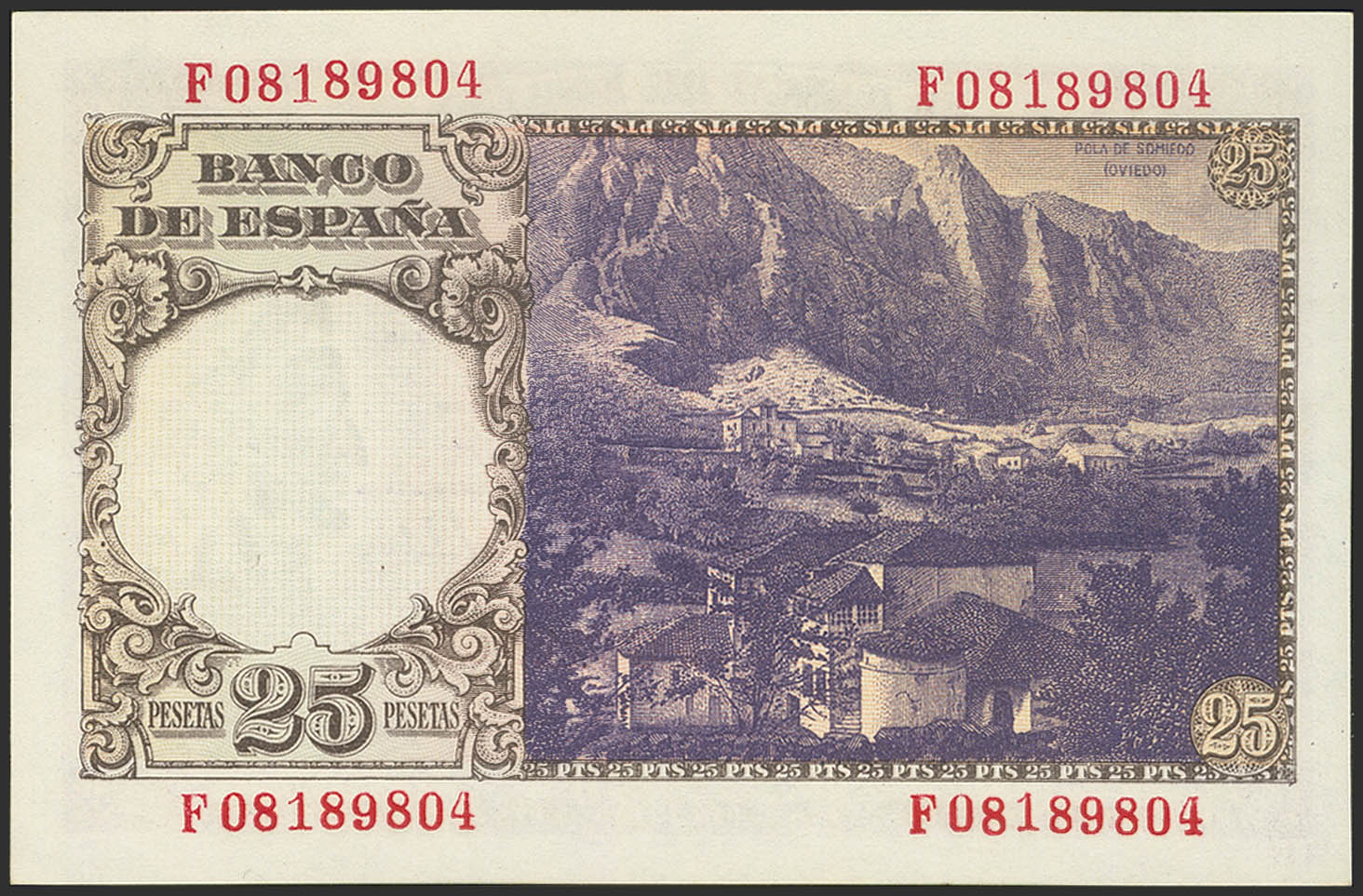 25 Pesetas. February 19, 1946. Series F. (Edifil 2023: 450a). Original sizing. Uncirculated.