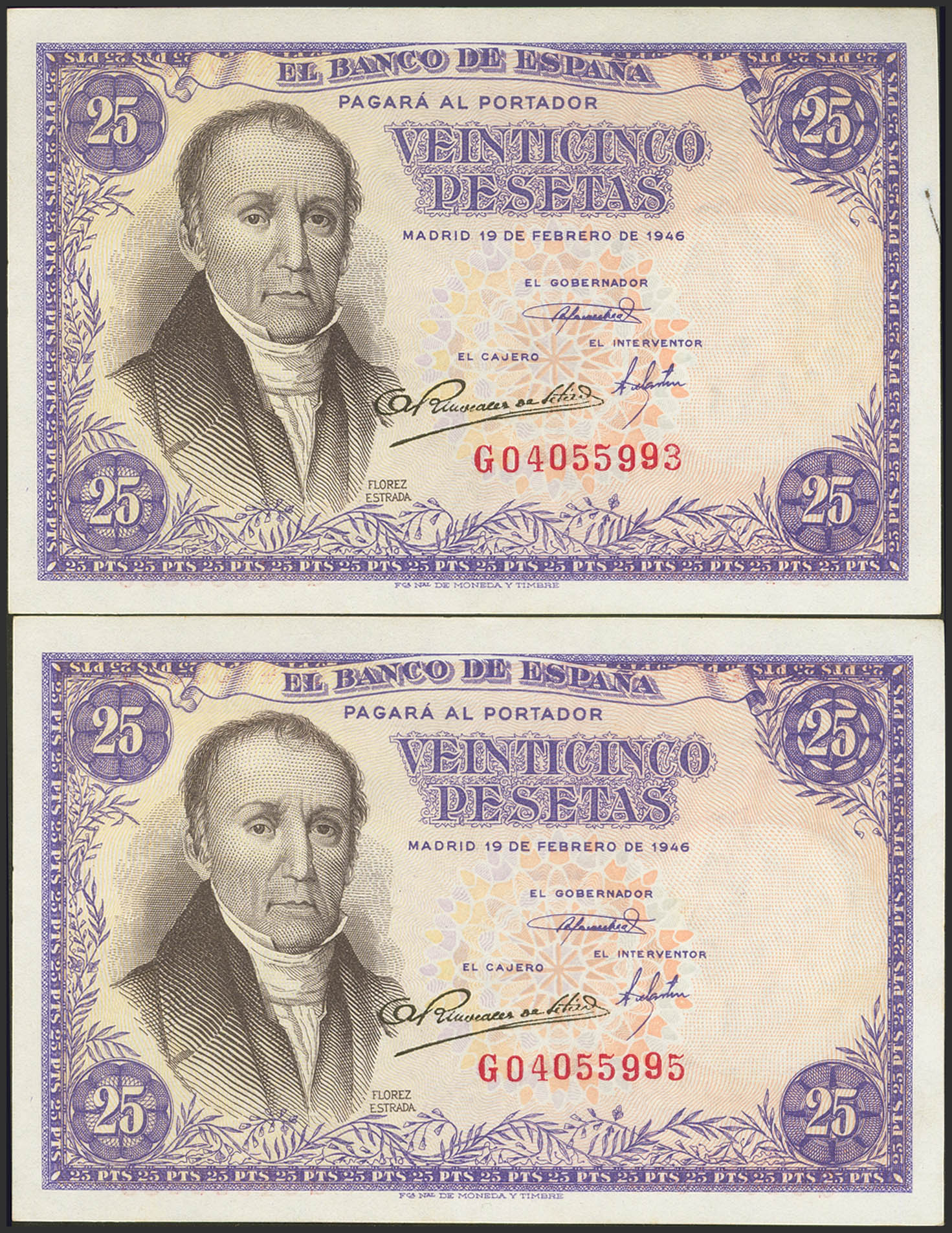 25 Pesetas. February 19, 1946. Correlative couple. Series G. (Edifil 2023: 450a). Original sizing, one of them remaining ink. Uncirculated/Uncirculated-.