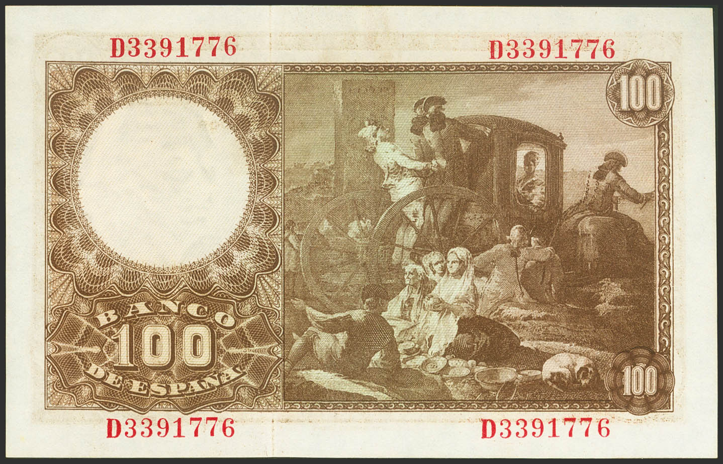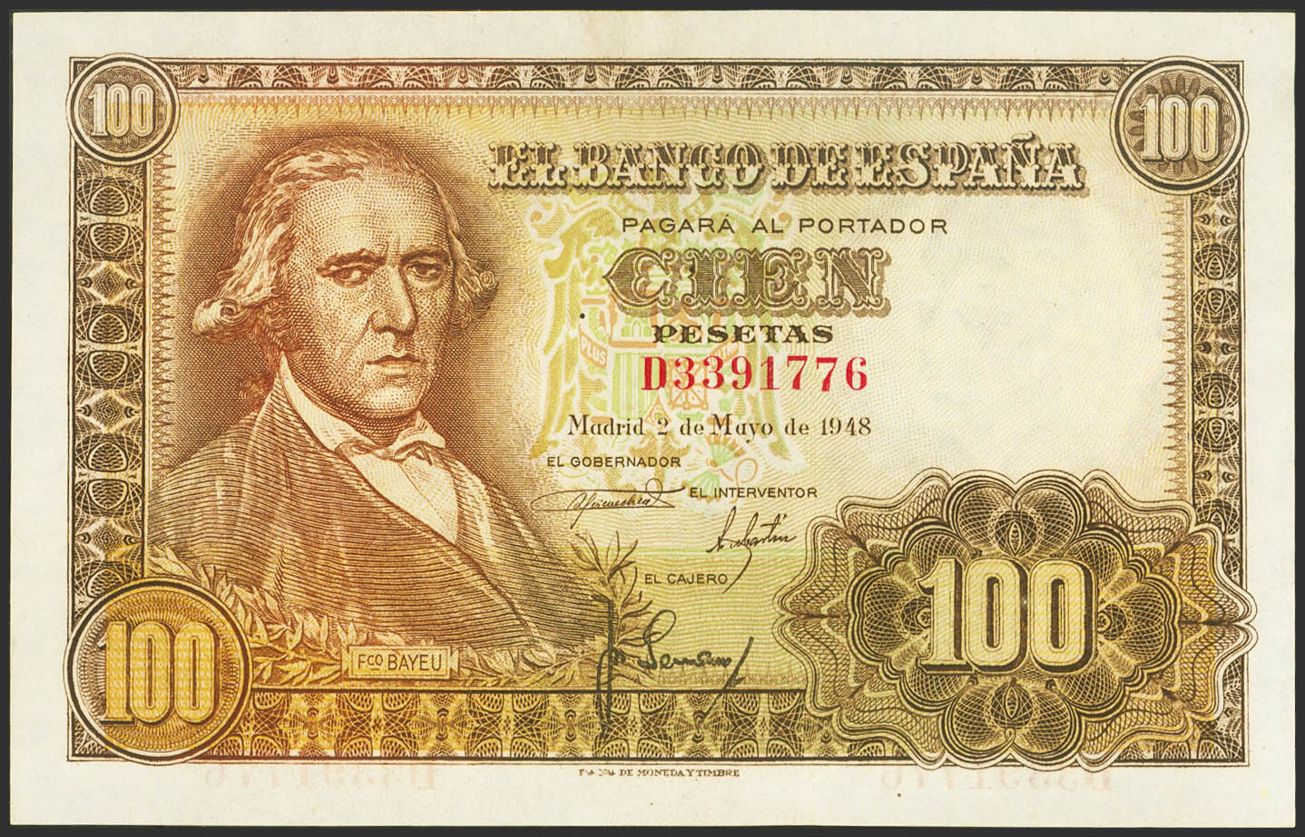 100 Pesetas. May 2, 1948. Series D. (Edifil 2023: 456a). It retains much of the original finish. Good Extremely Fine.