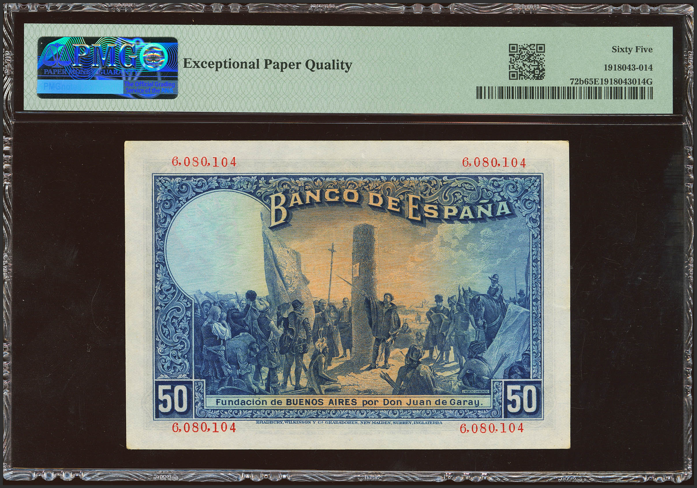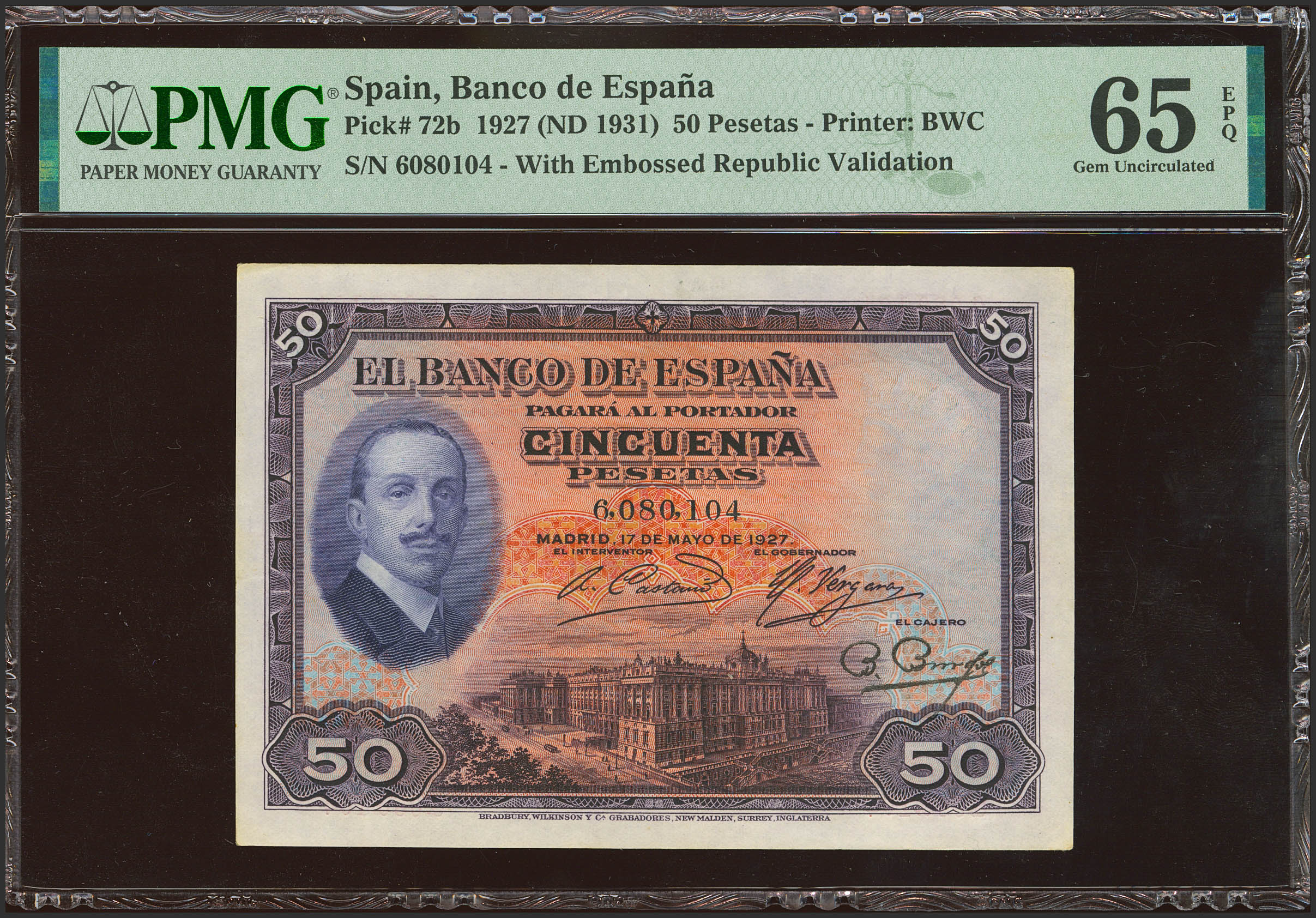50 Pesetas. May 17, 1927. Without series and dry stamp "Provisional Government of the Republic / April 14, 1931". (Edifil 2023: 339, Pick: 72b). Extremely rare especially in this exceptional quality, original sizing. Uncirculated. PMG65EPQ package.