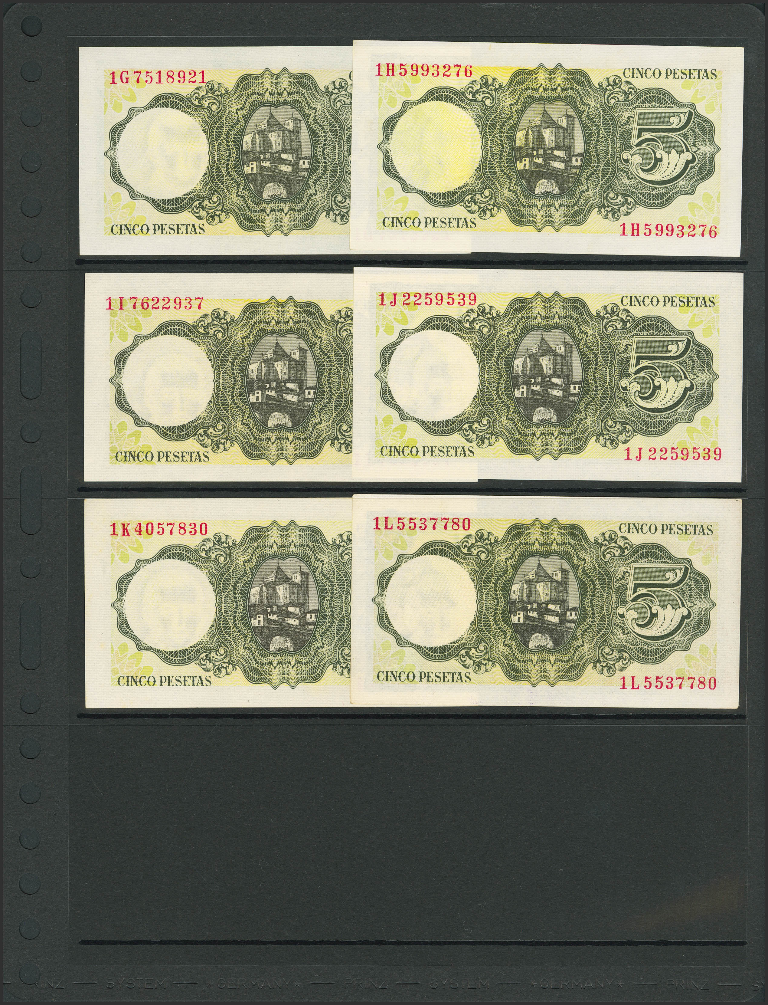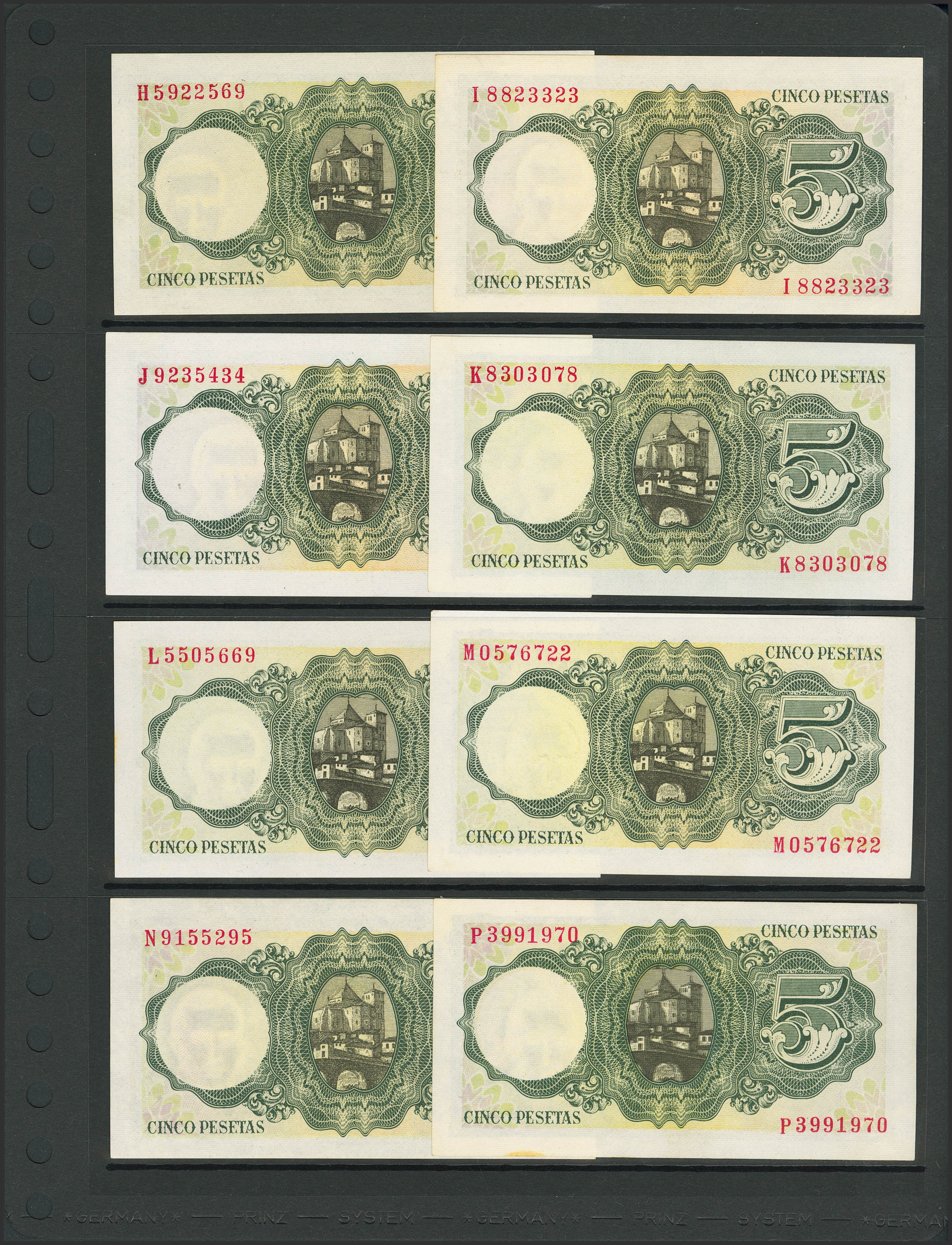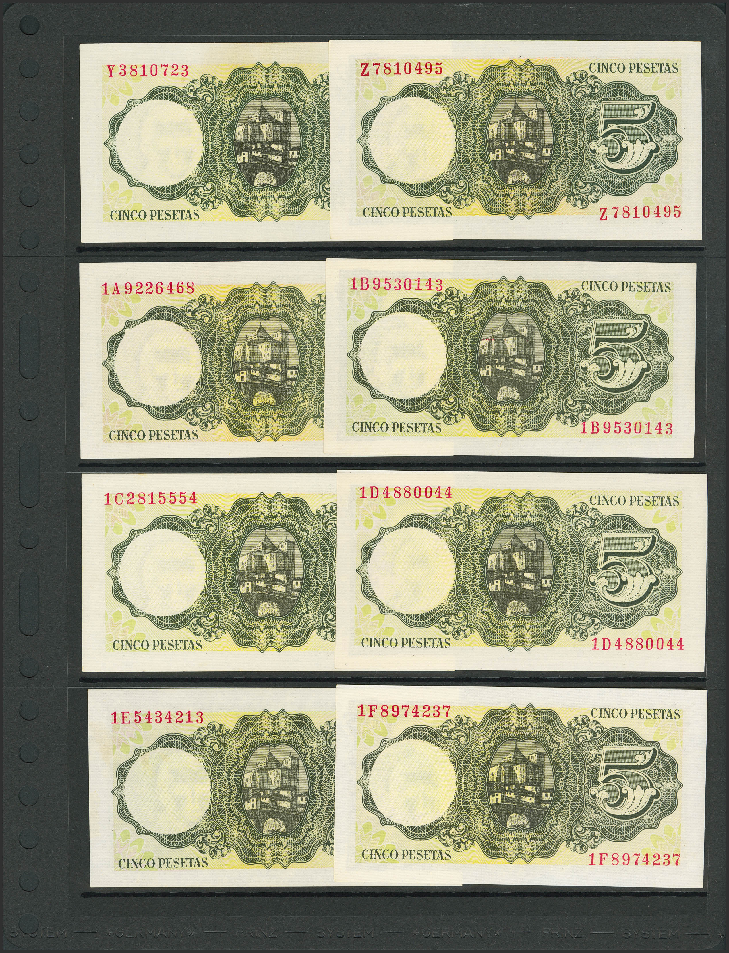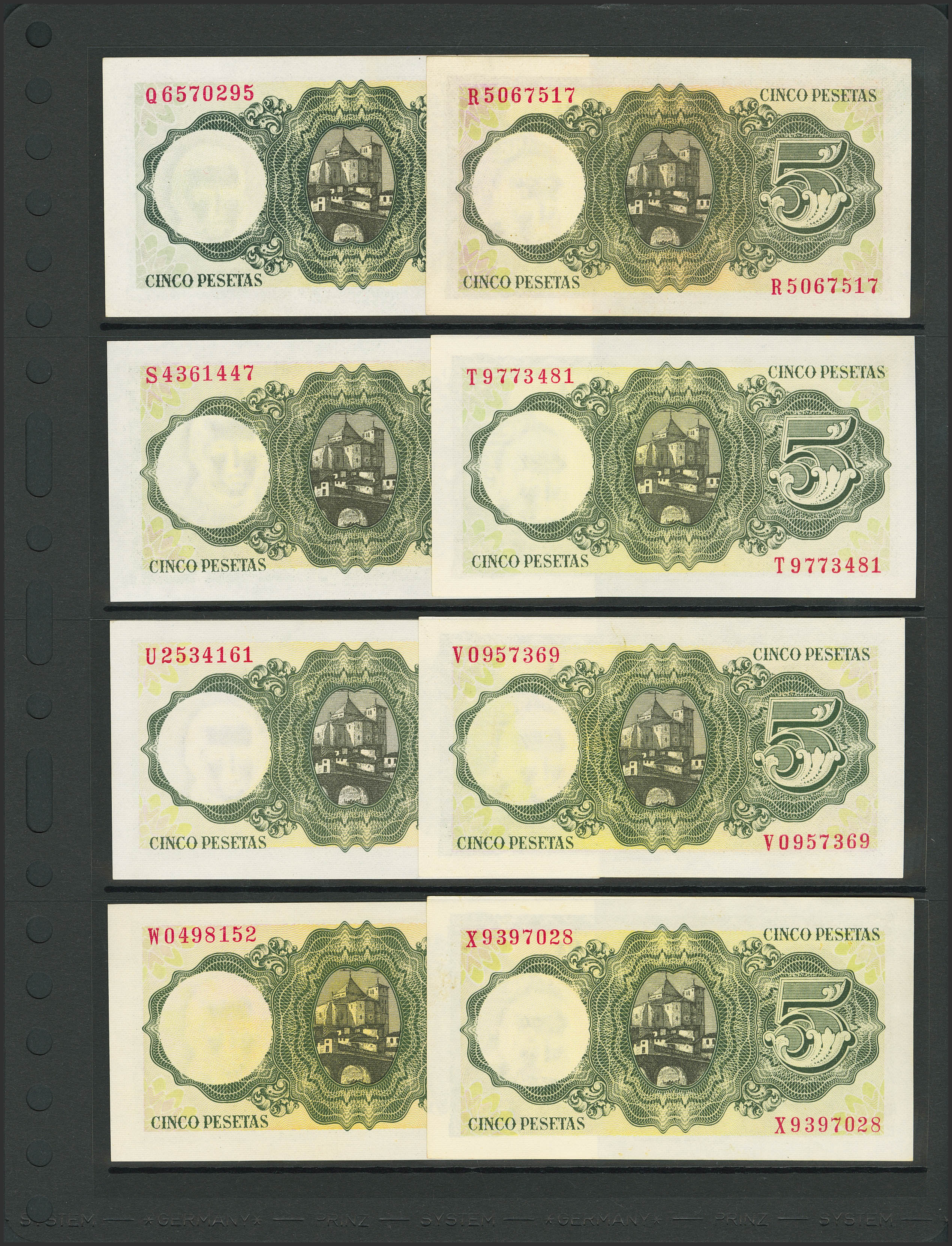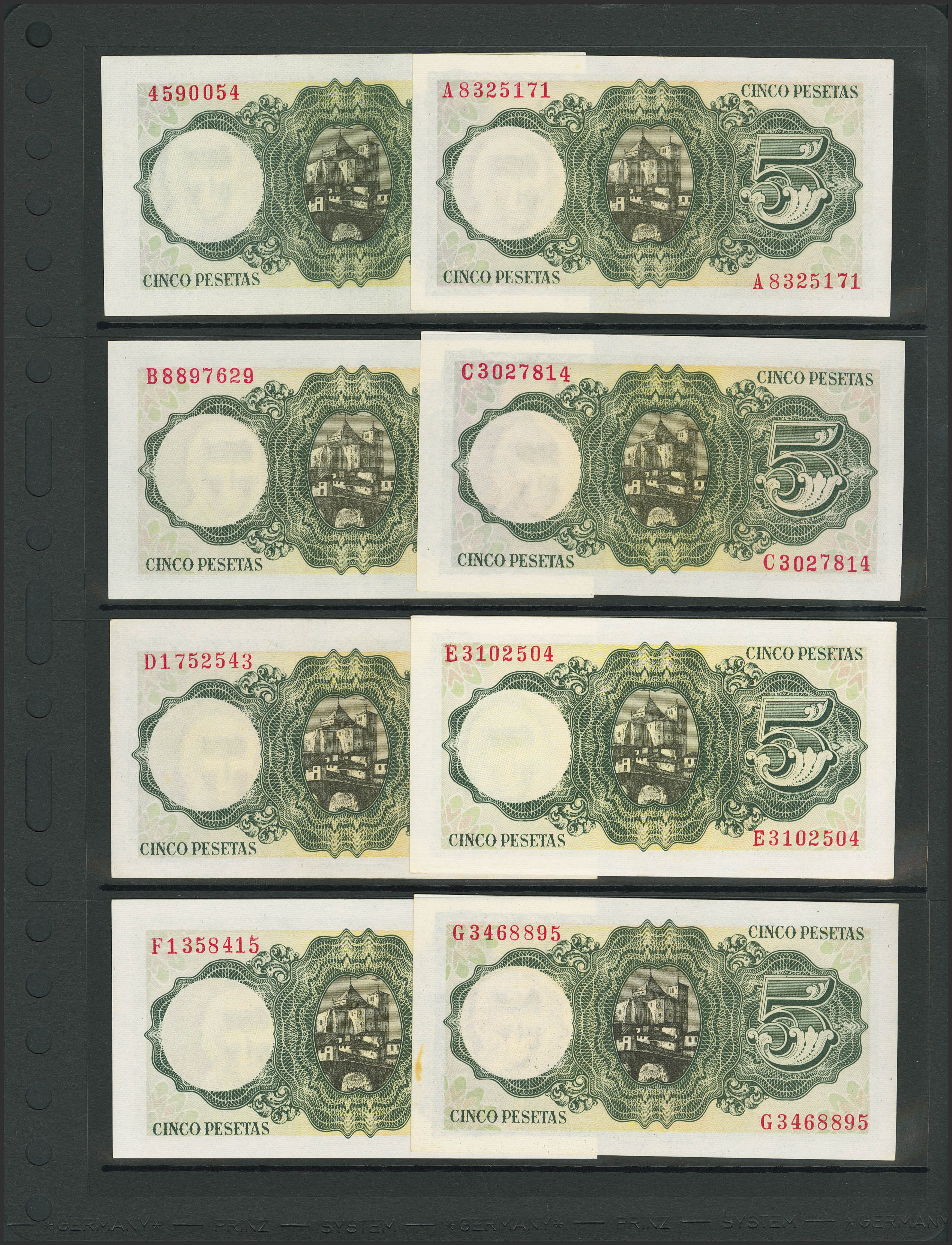 Set of 37 5 Pesetas banknotes issued on August 16, 1951 and corresponding to all known series that include the no series and the series A, B, C, D, E, F, G (little spot), H, I, J, K, L, M, N, P (Good Extremely Fine++), Q (Good Extremely Fine), R, S, T, U, V, W, X, Y, Z (Good Extremely Fine+), 1A, 1B, 1C, 1D, 1E , 1F, 1G, 1H, 1I, 1J, 1K and 1L. (Edifil 2023: 459, 459a, 459b). Very unusual set that includes all the different series issued and preserved all its original preparation. Uncirculated/Uncirculated-.