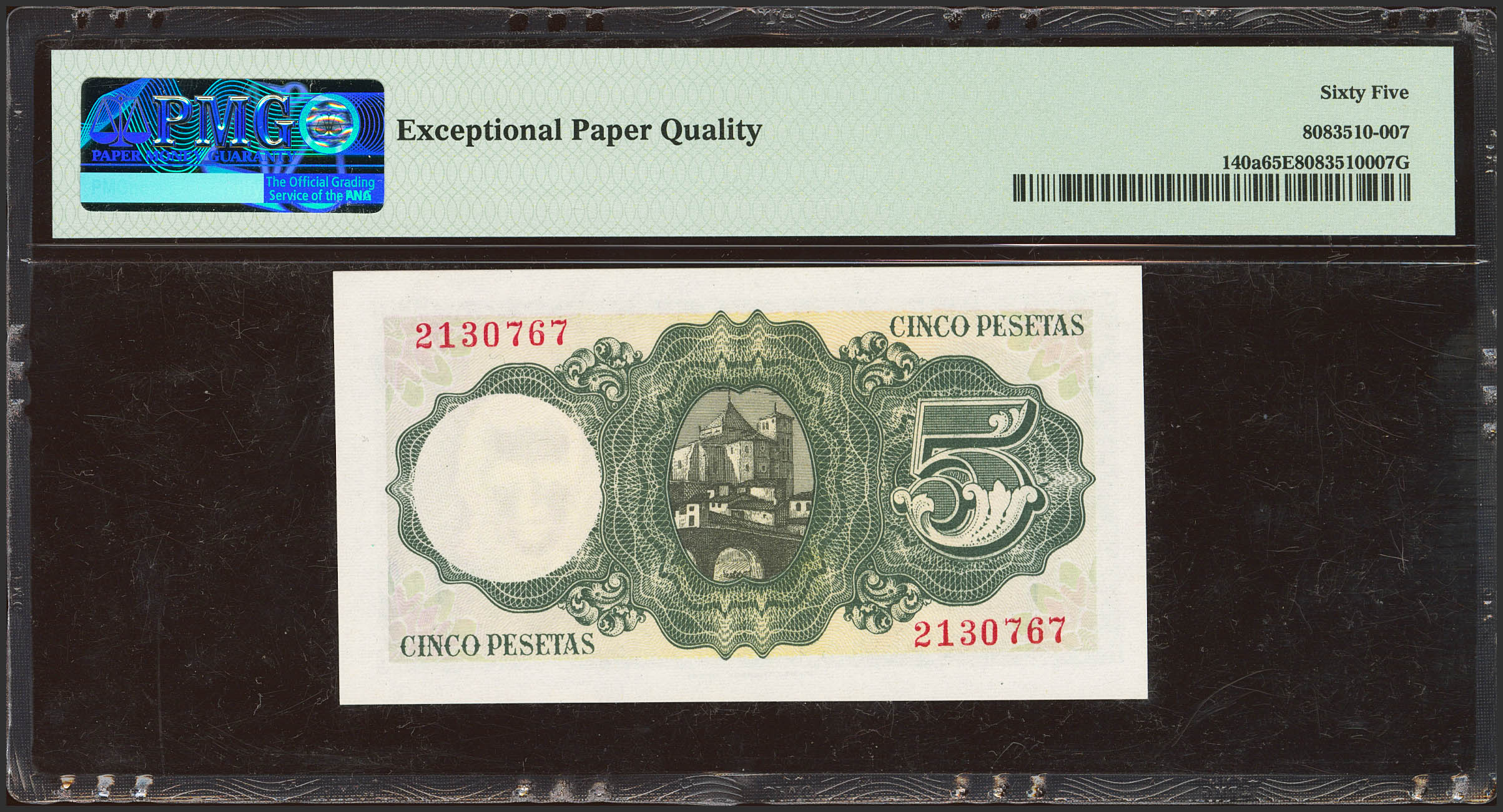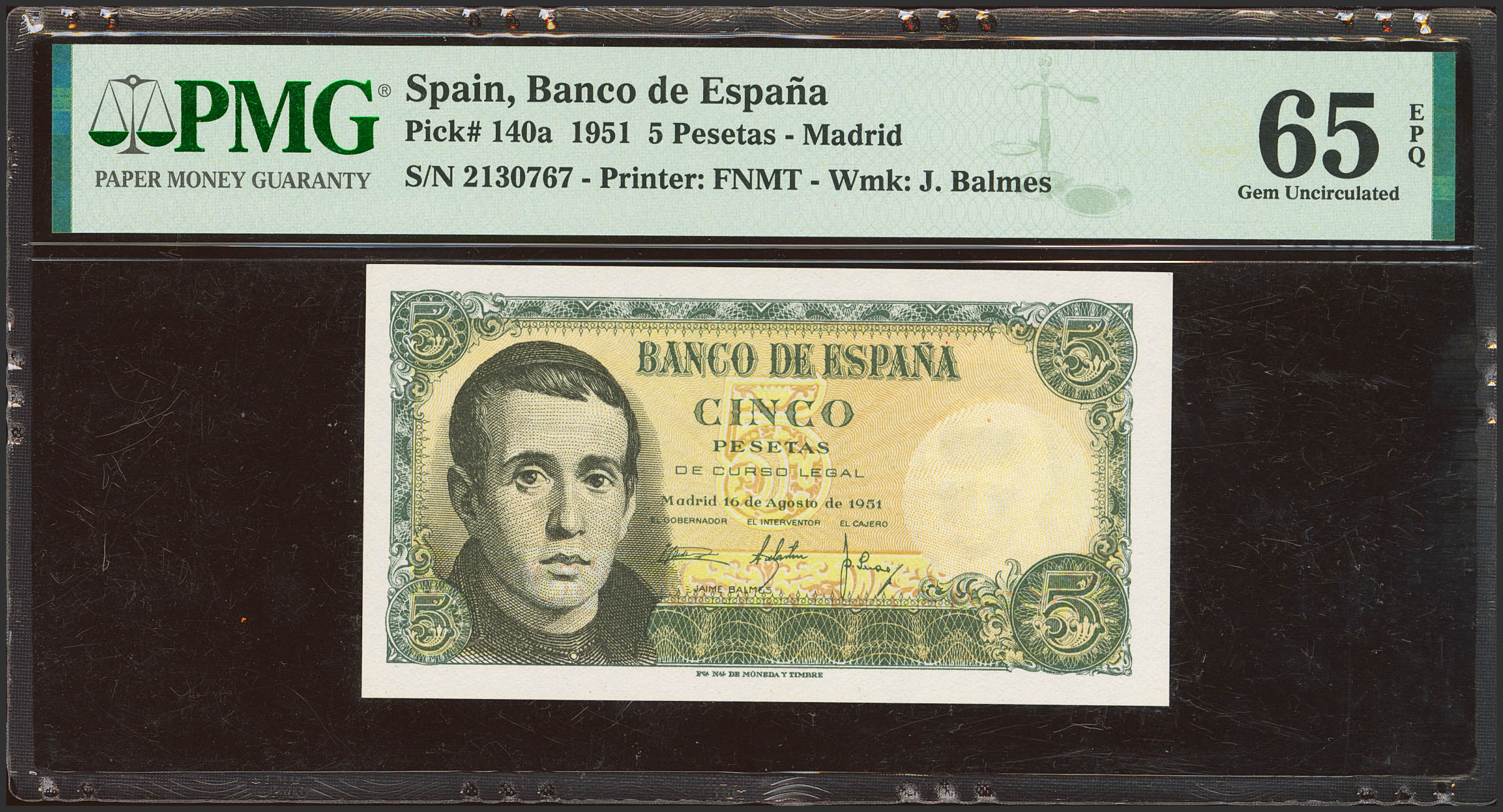 5 Pesetas. August 16, 1951. No series. (Edifil 2023: 459, Pick: 140a). Original sizing. Uncirculated. PMG65EPQ package.