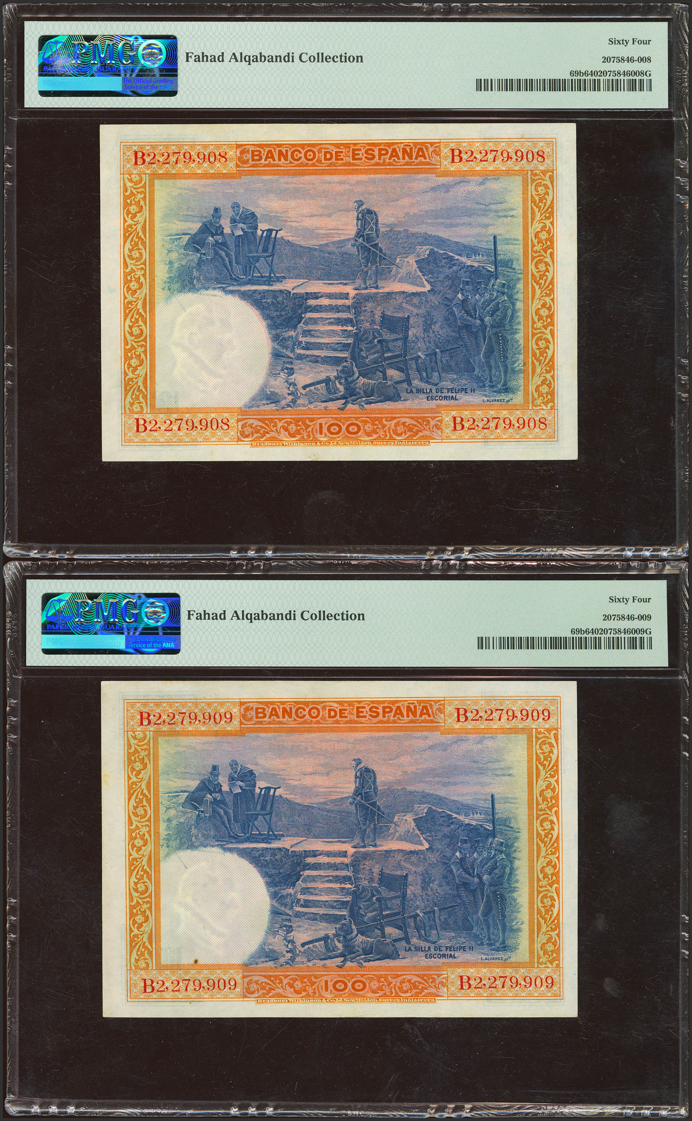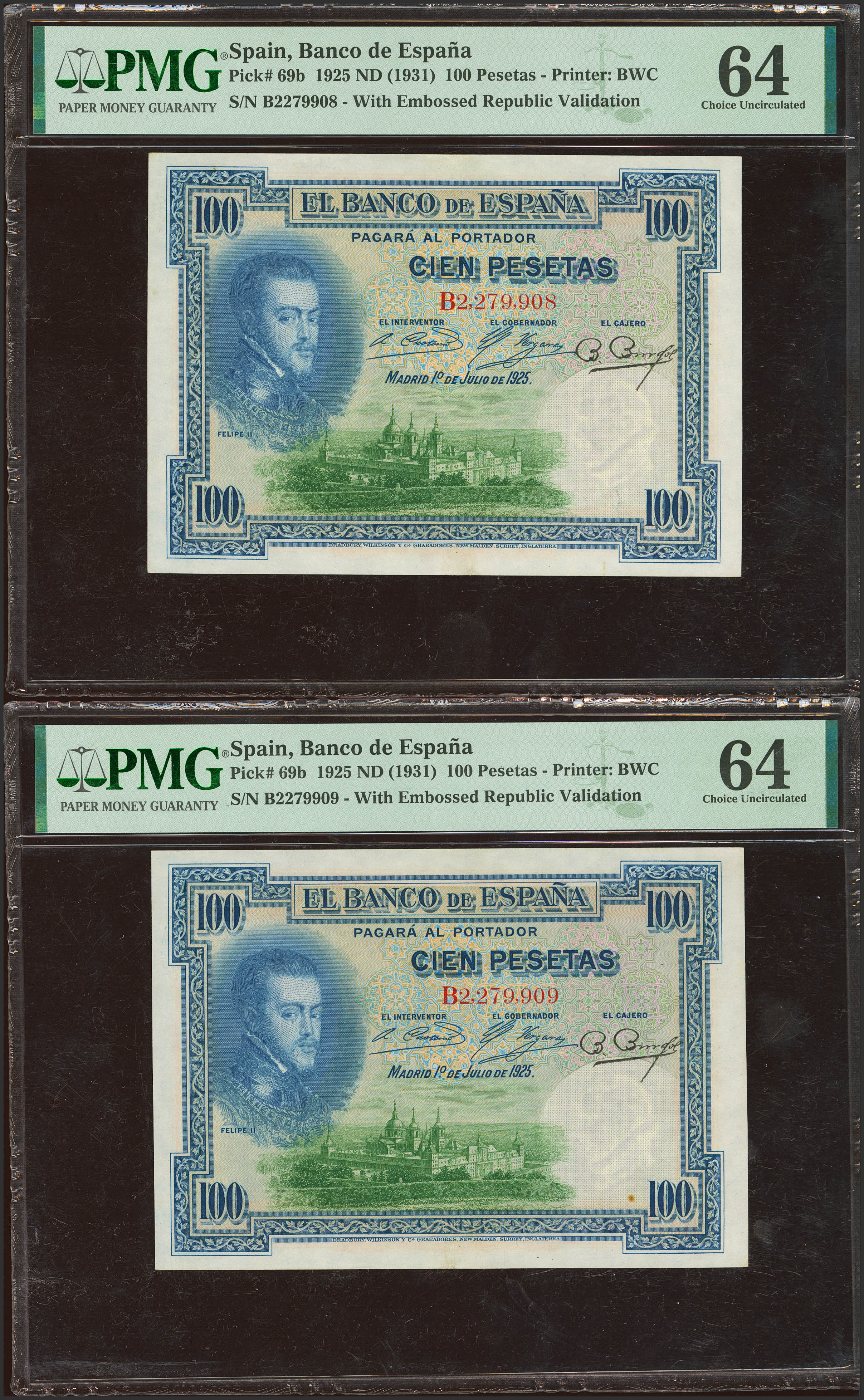 100 Pesetas. July 1, 1925. Correlative couple. Series B and dry seal PROVISIONAL GOVERNMENT OF THE REPUBLIC / APRIL 14, 1931. (Edifil 2021: 344, Pick: 69b). Uncirculated. PMG64 encapsulated, both.