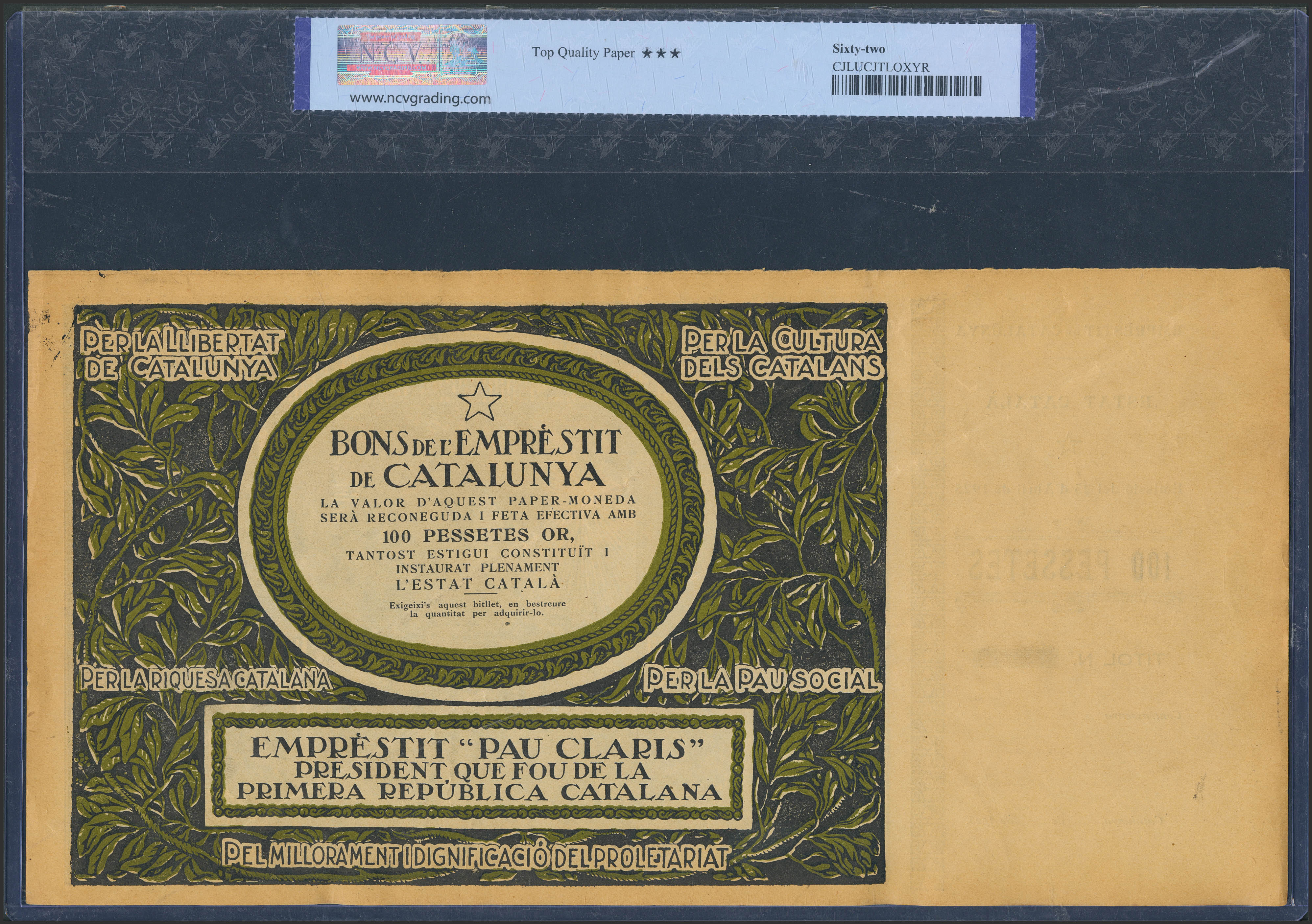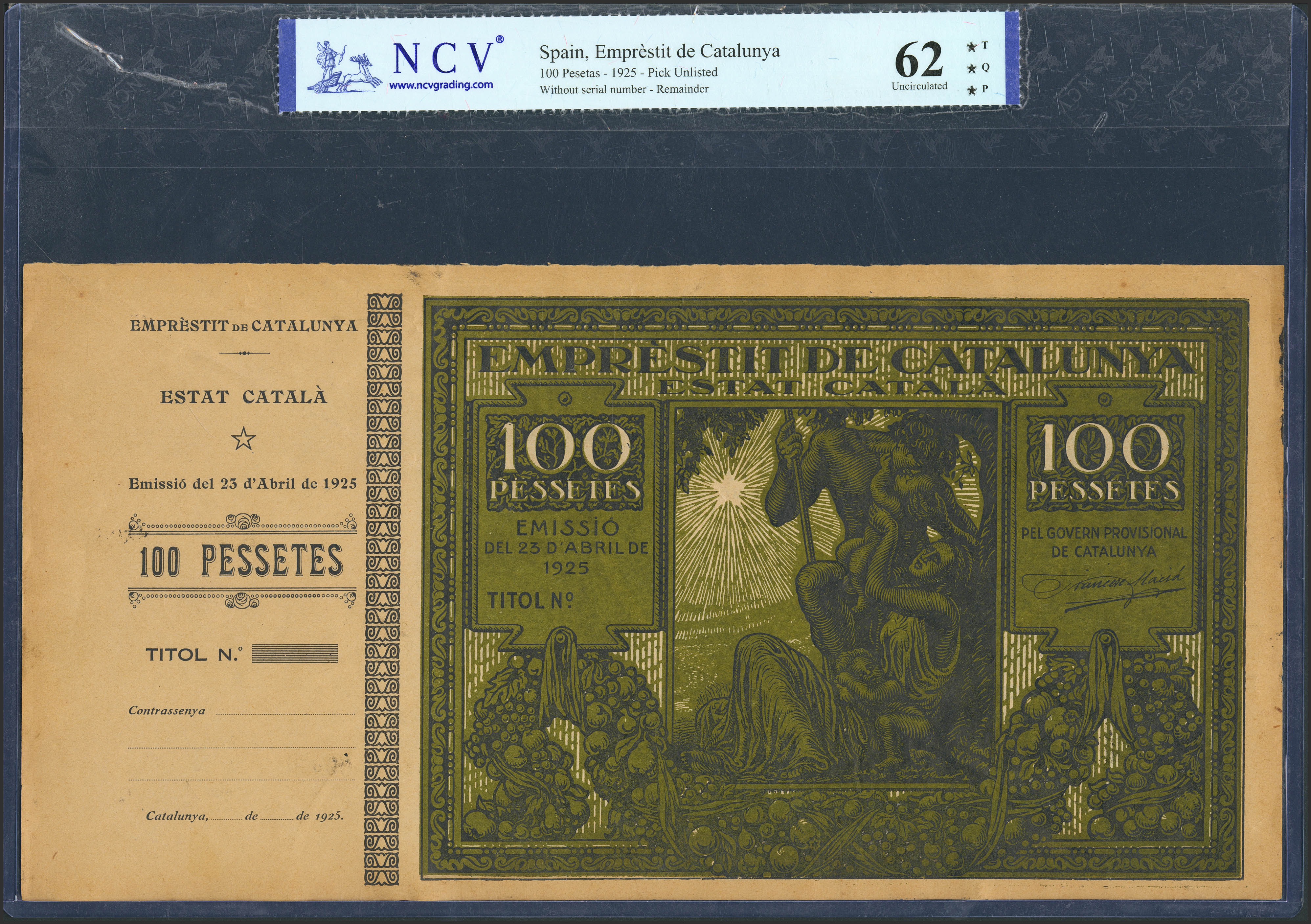 EMPRESTIT OF CATALONIA. STATE CATALAN. April 23, 1925. Emprestits Pau Clarís. Proof of the front and back of the 100 Pessetes bill. Original sizing. Uncirculated. NCV62TQP package.