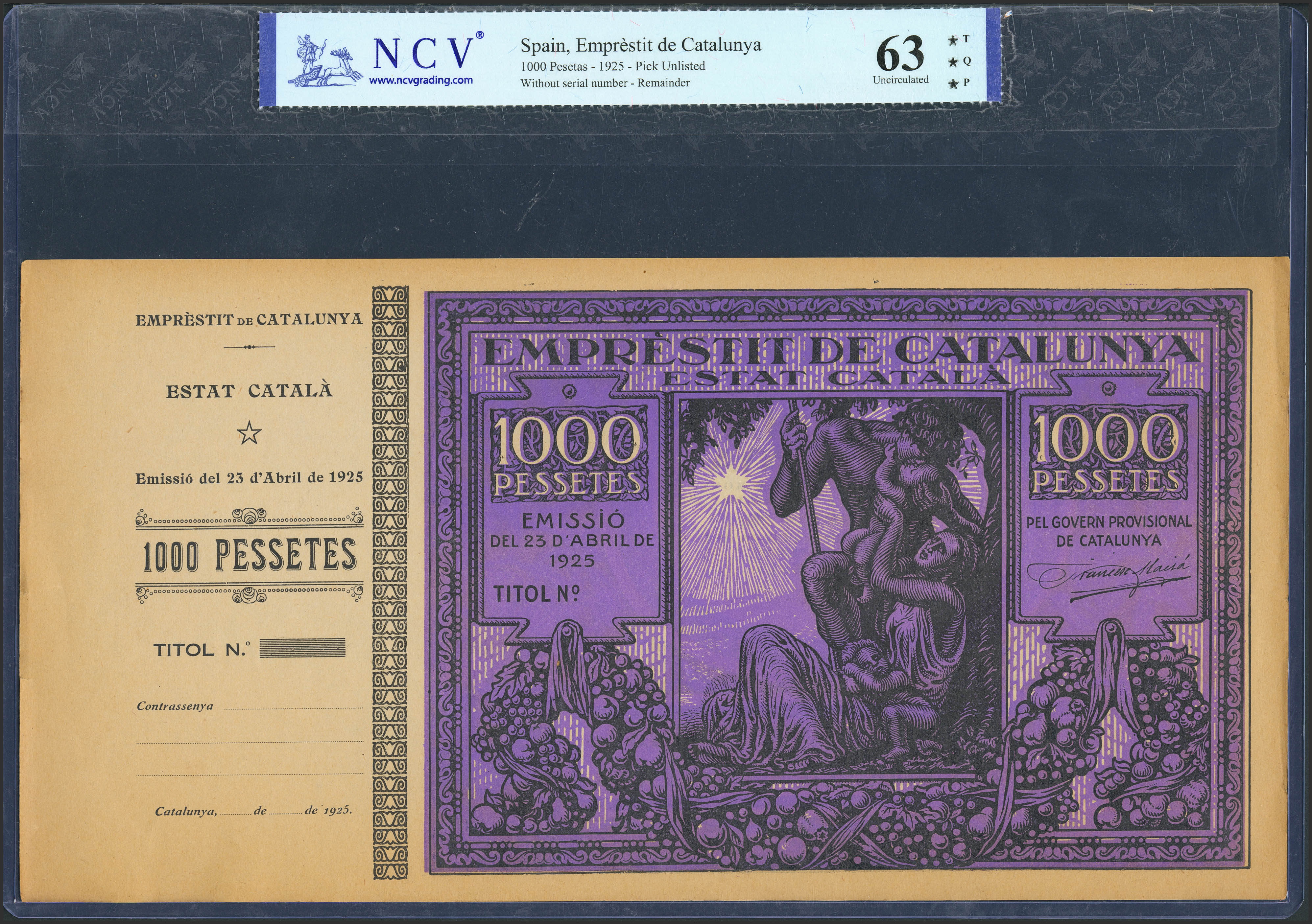 EMPRESTIT OF CATALONIA. STATE CATALAN. April 23, 1925. Emprestits Pau Clarís. Proof of the front and back of the 1000 Pessetes bill. Original sizing. Uncirculated. NCV63TQP package.
