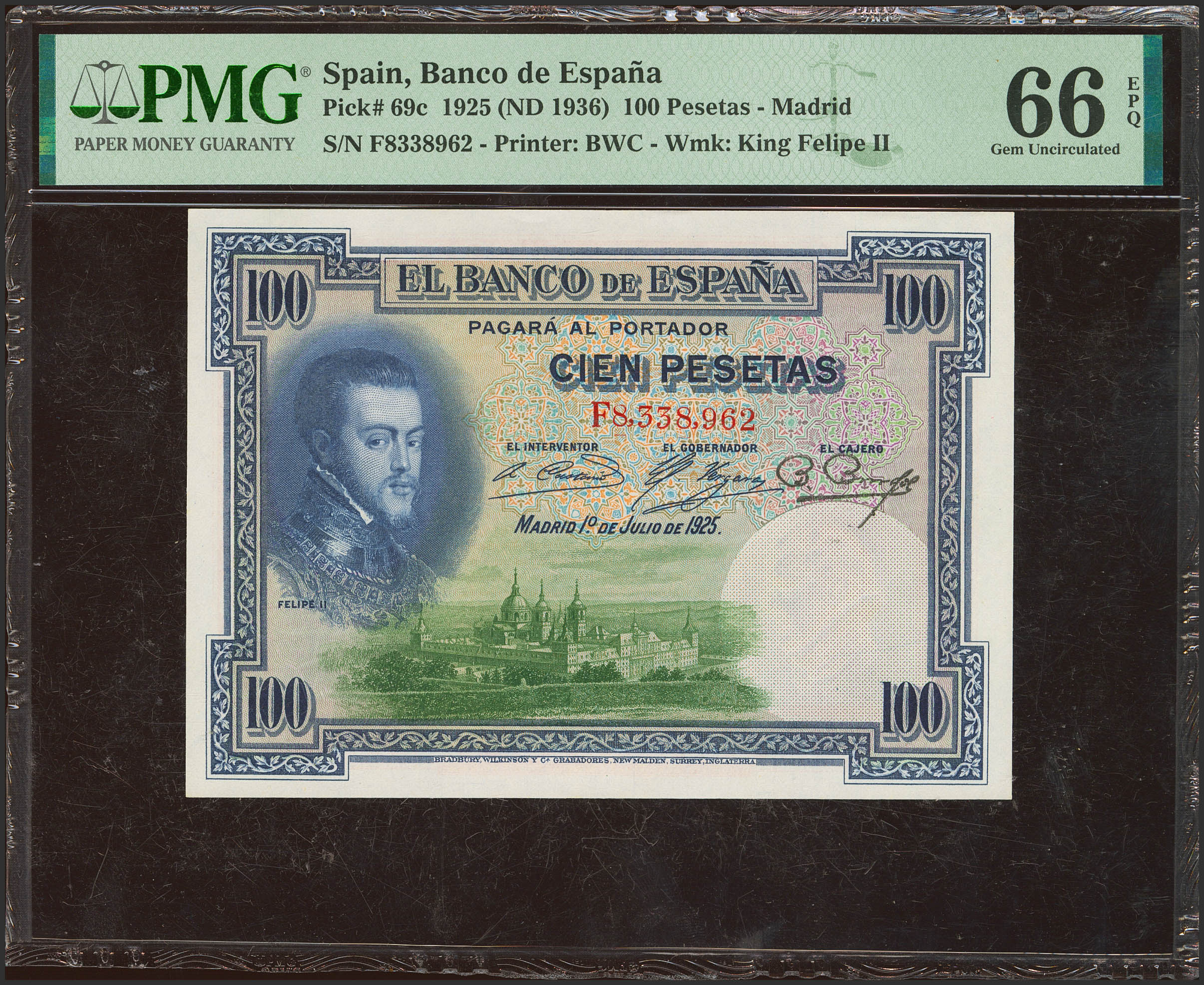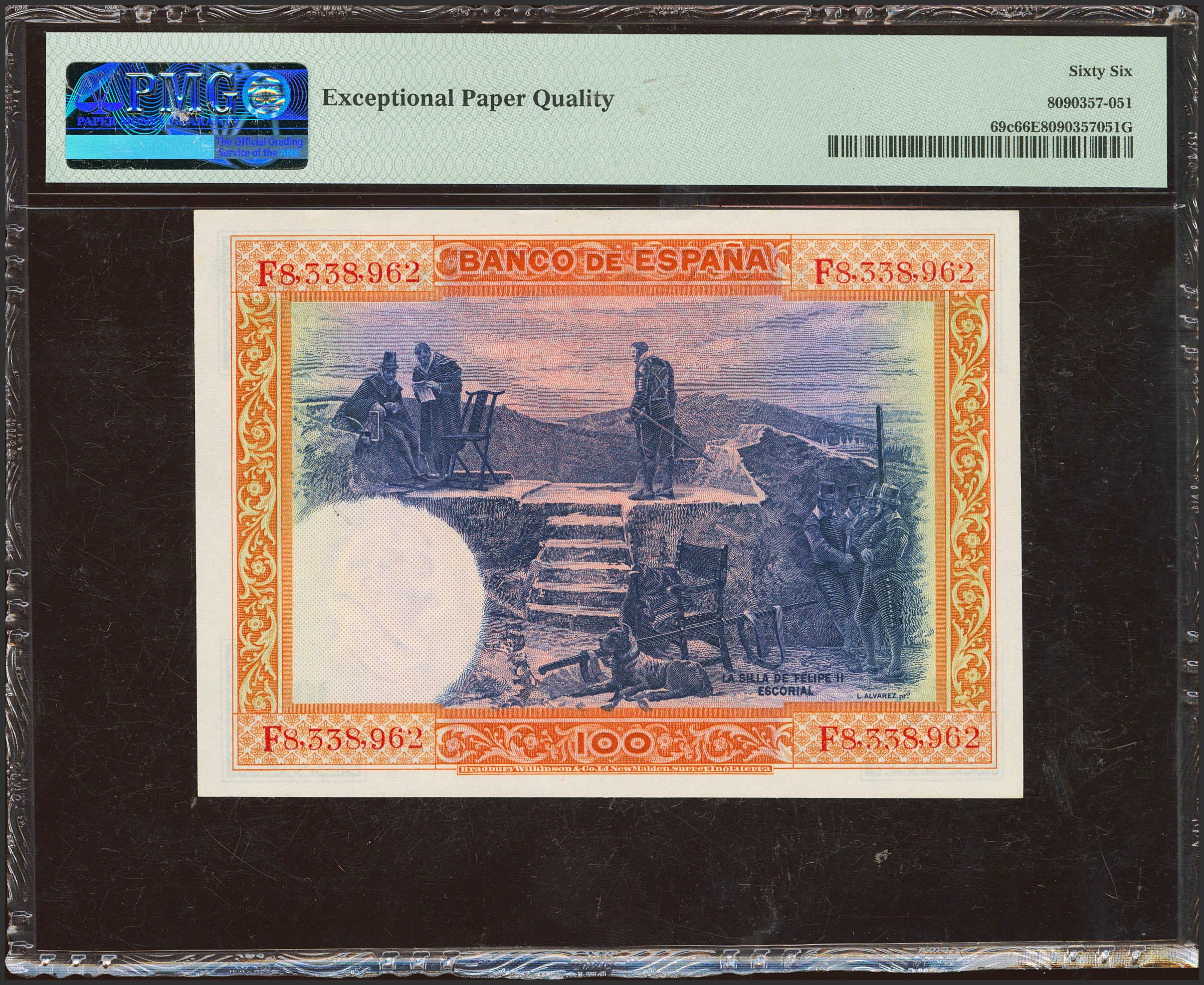 100 Pesetas. June 1, 1925. Series F. (Edifil 2021: 350, Pick: 69c). Original Uncirculated sizing. PMG66EPQ package.
