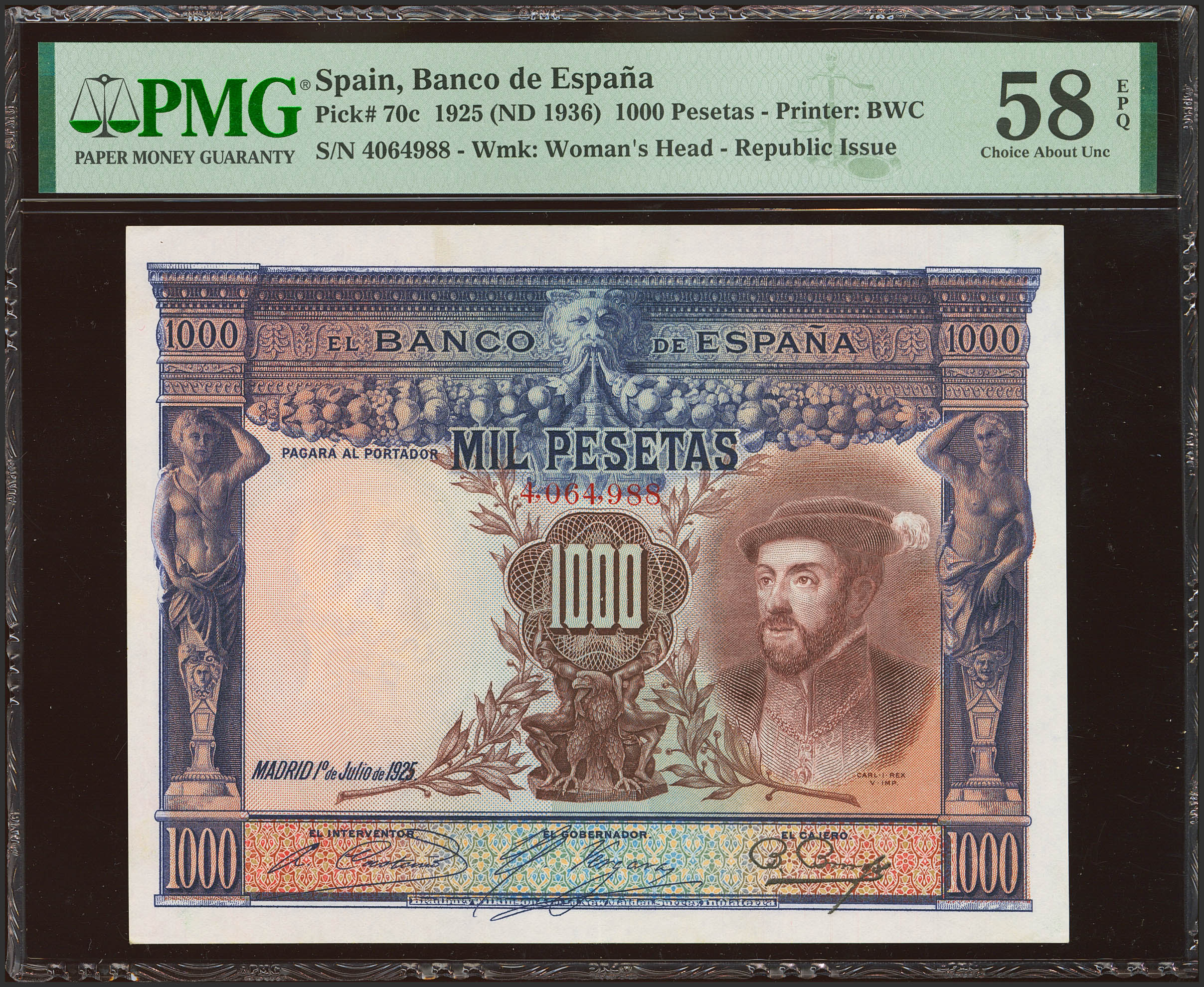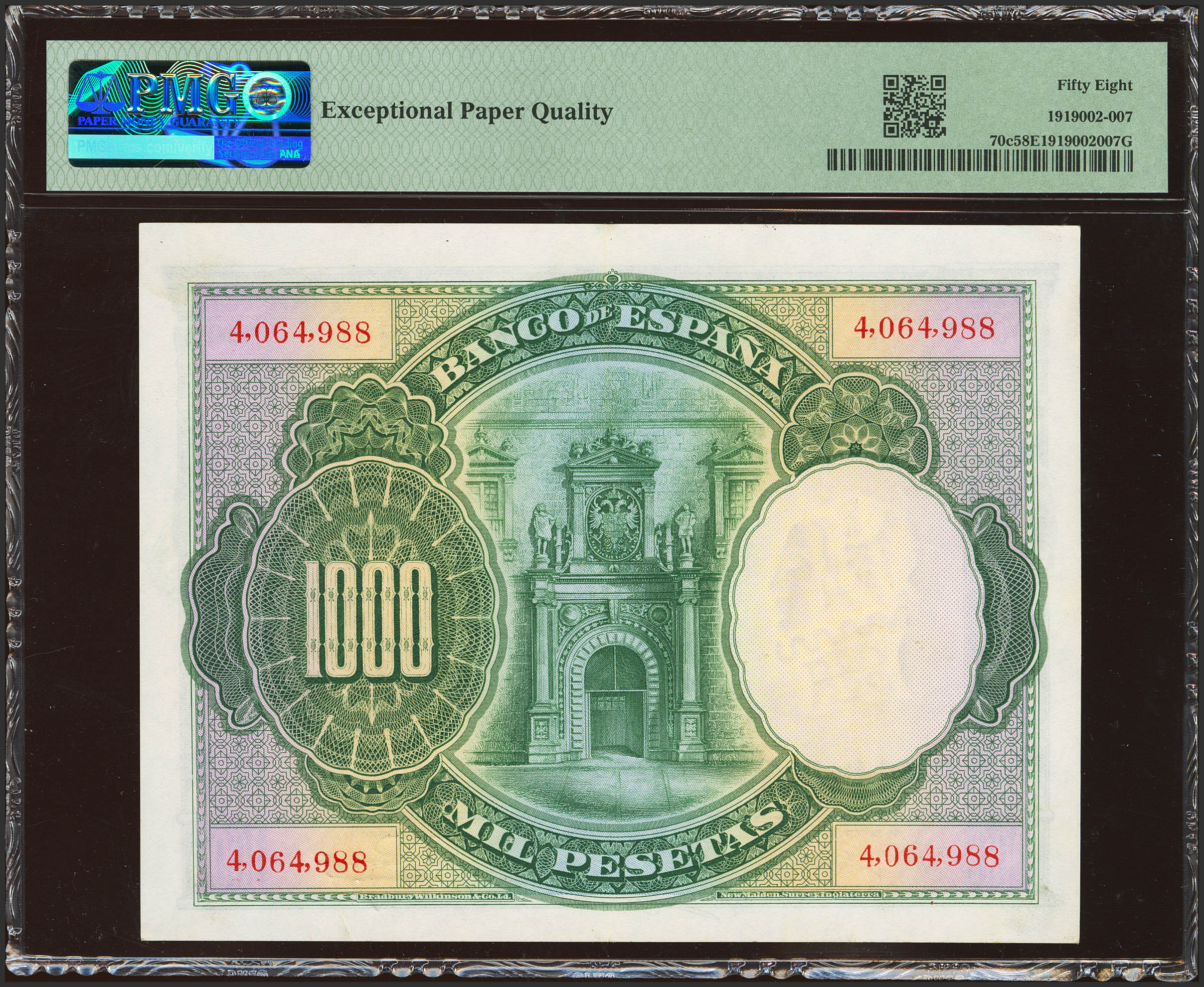 1000 Pesetas. July 1, 1925. Without series and numbering greater than 3646000. (Edifil 2023: 351, Pick: 70c). Unusual in this quality. Good Extremely Fine++. PMG58EPQ package.