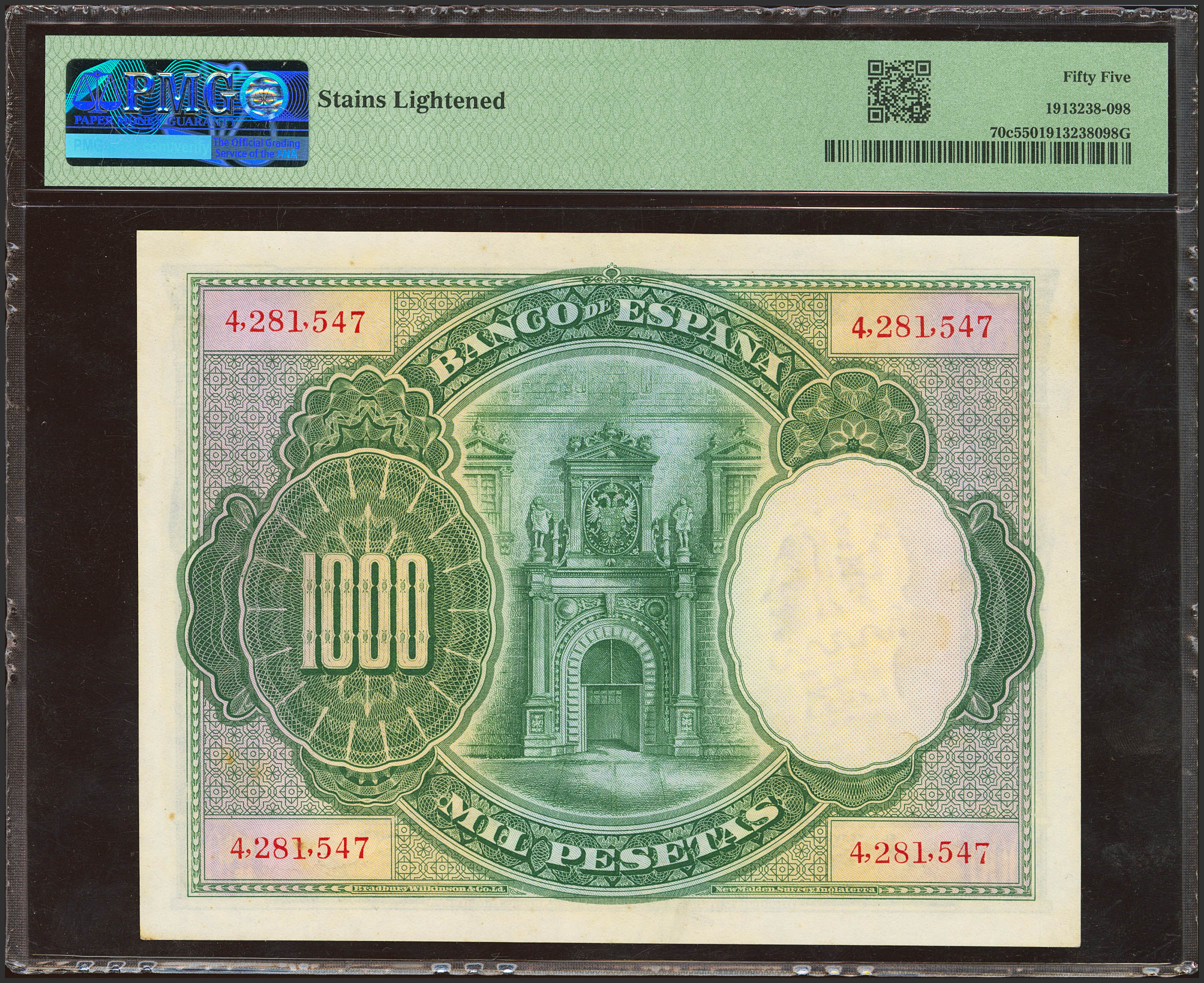 1000 Pesetas. July 1, 1925. Without series and numbering after 3646000. (Edifil 2023: 351, Pick: 70c). Unusual in this quality. Good Extremely Fine. PMG55 encapsulation (lightened stains).