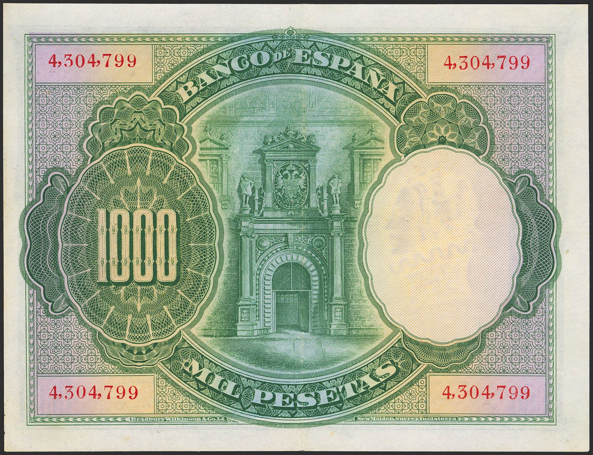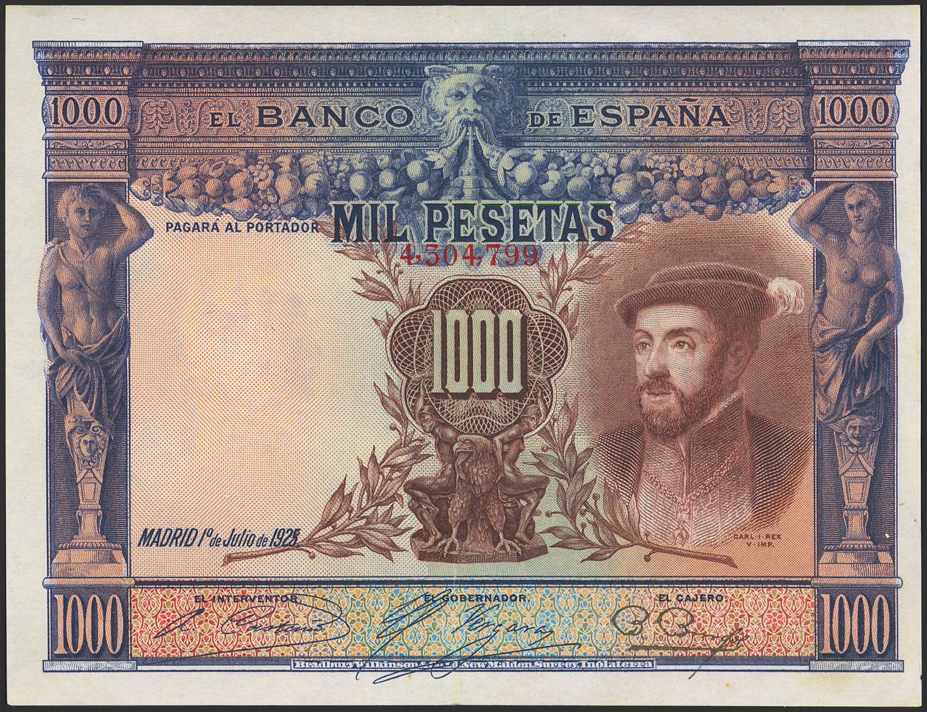 1000 Pesetas. July 1, 1925. Without series and numbering after 3646000. (Edifil 2023: 351). Extremely Fine.