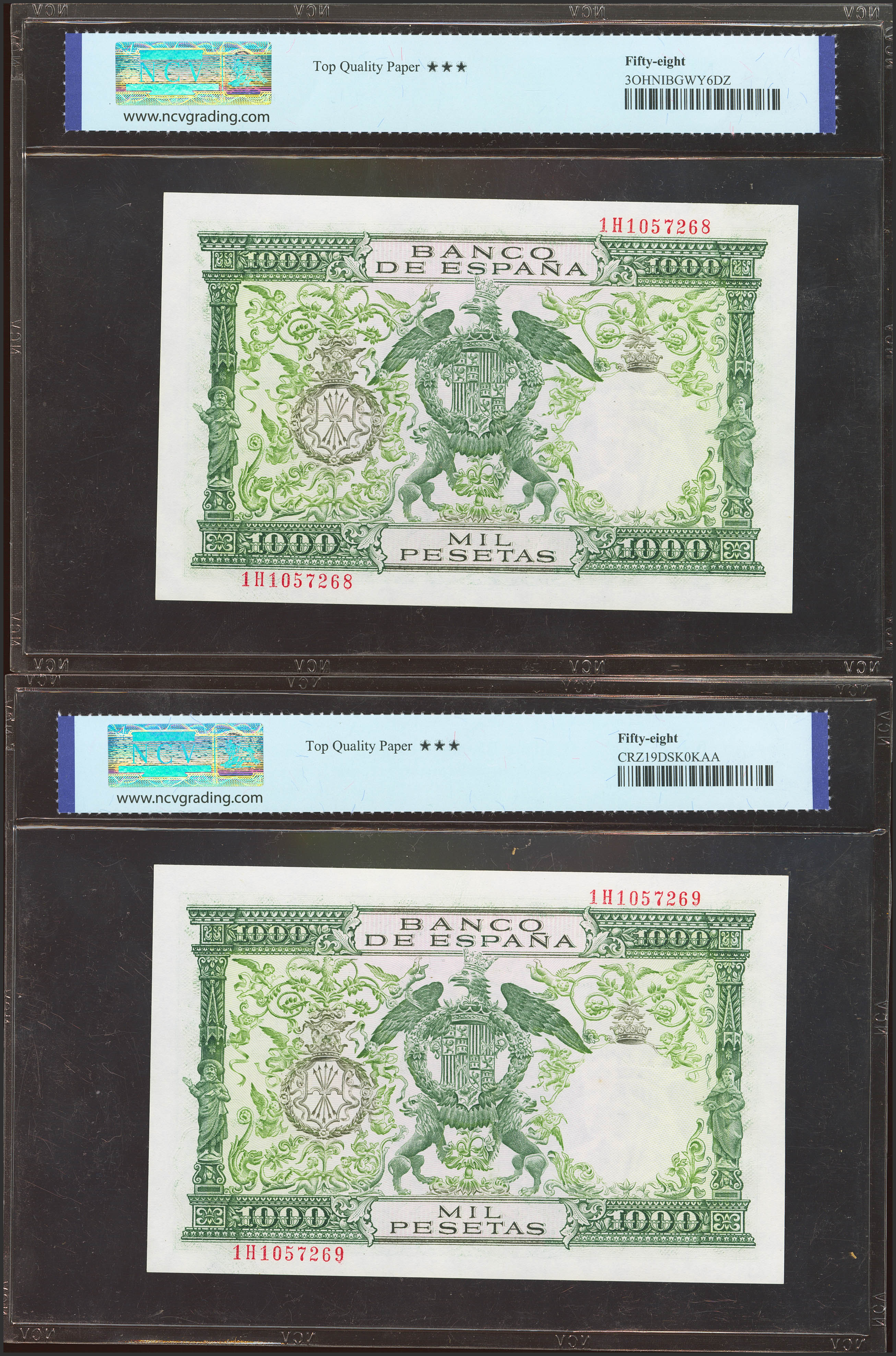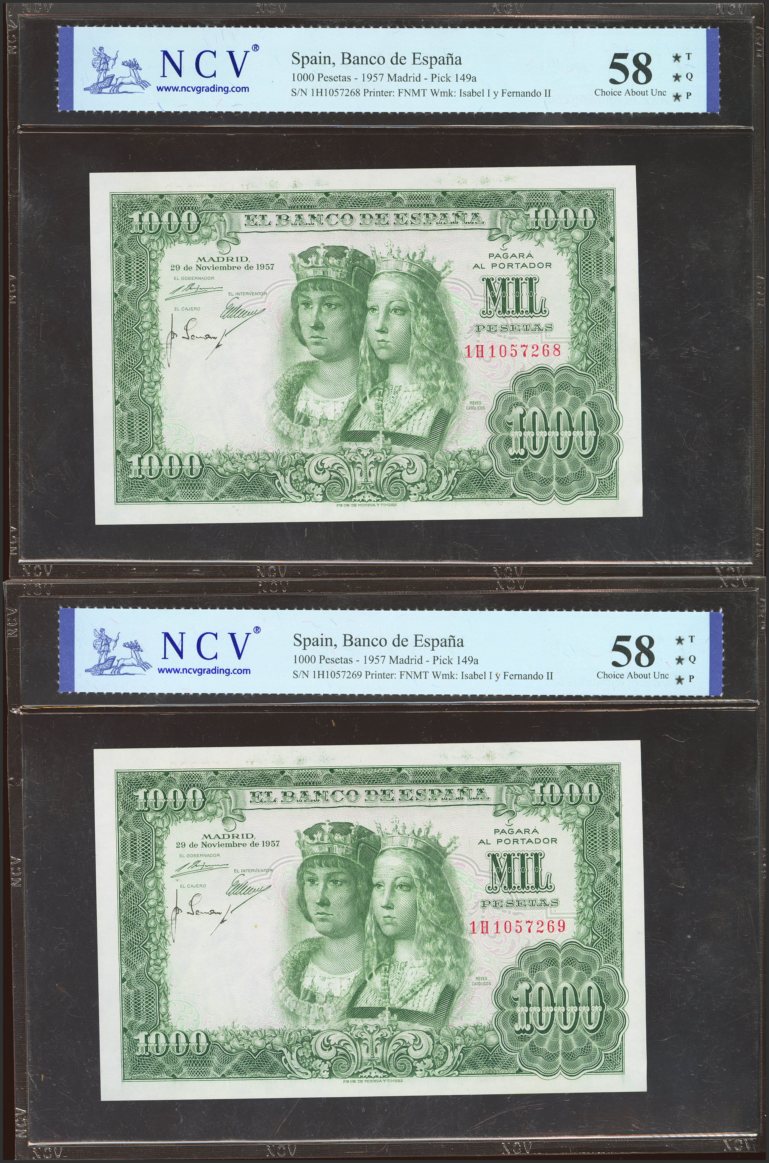 1000 Pesetas. November 29, 1957. Correlative pair. 1H series. (Edifil 2023: 469b, Pick: 149a). Good Extremely Fine++. NCV58TQP packages, both.