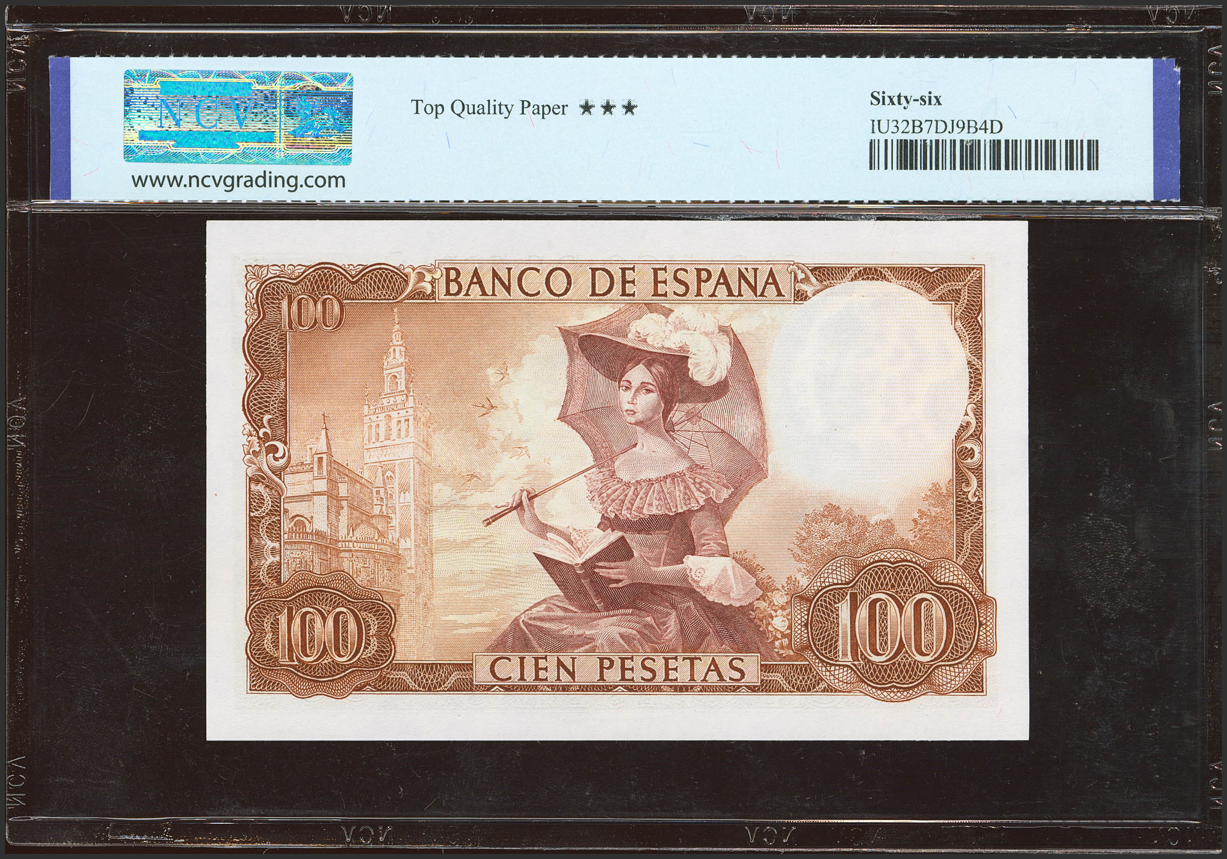 100 Pesetas. November 19, 1965. No series. (Edifil 2023: 470, Pick: 150). Unusual, original sizing. Uncirculated. NCV66TQP package.