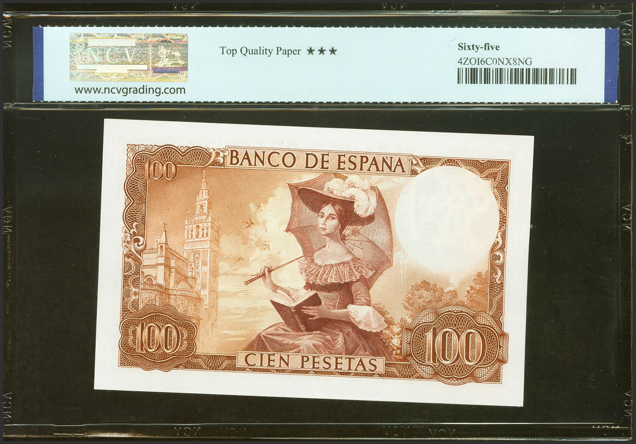 100 Pesetas. November 19, 1965. No series. (Edifil 2023: 470, Pick: 150). Unusual, original sizing. Uncirculated. NCV65TQP package.