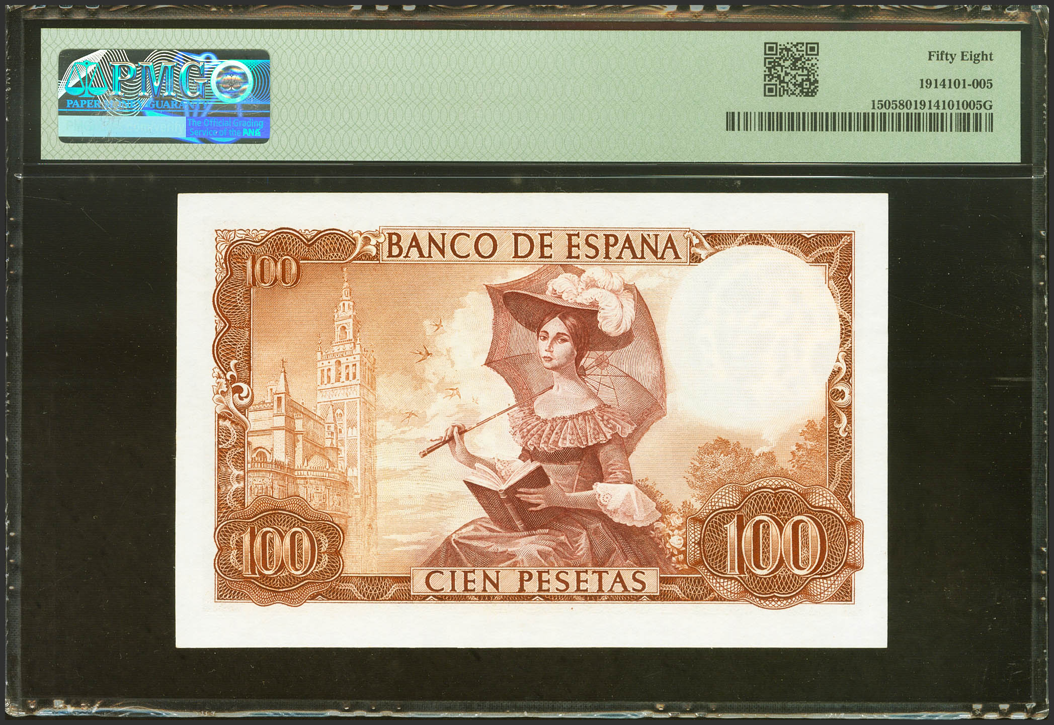 100 Pesetas. November 19, 1965. No series. (Edifil 2021: 470, Pick: 150). Good Extremely Fine+. PMG58 encapsulation.