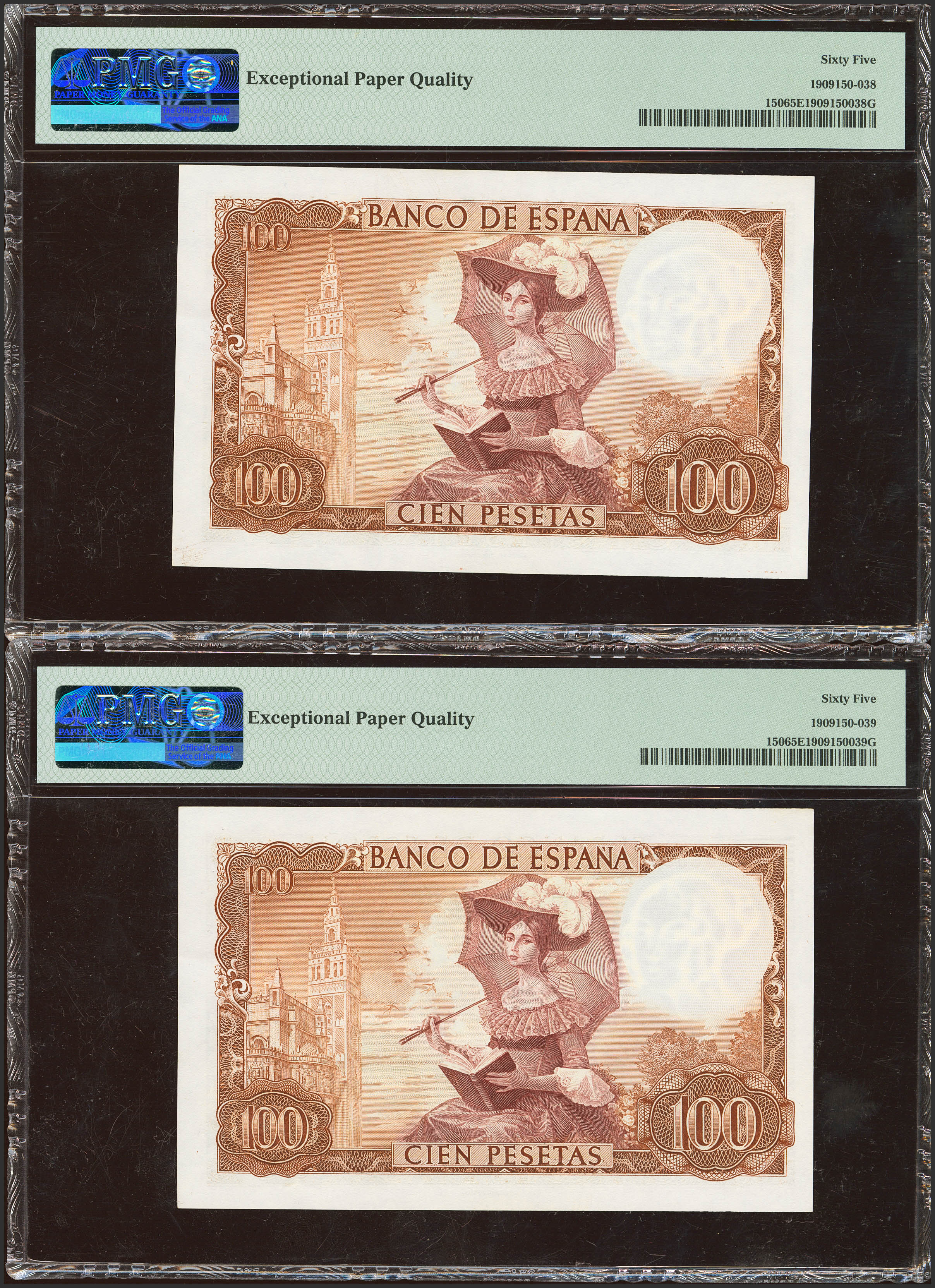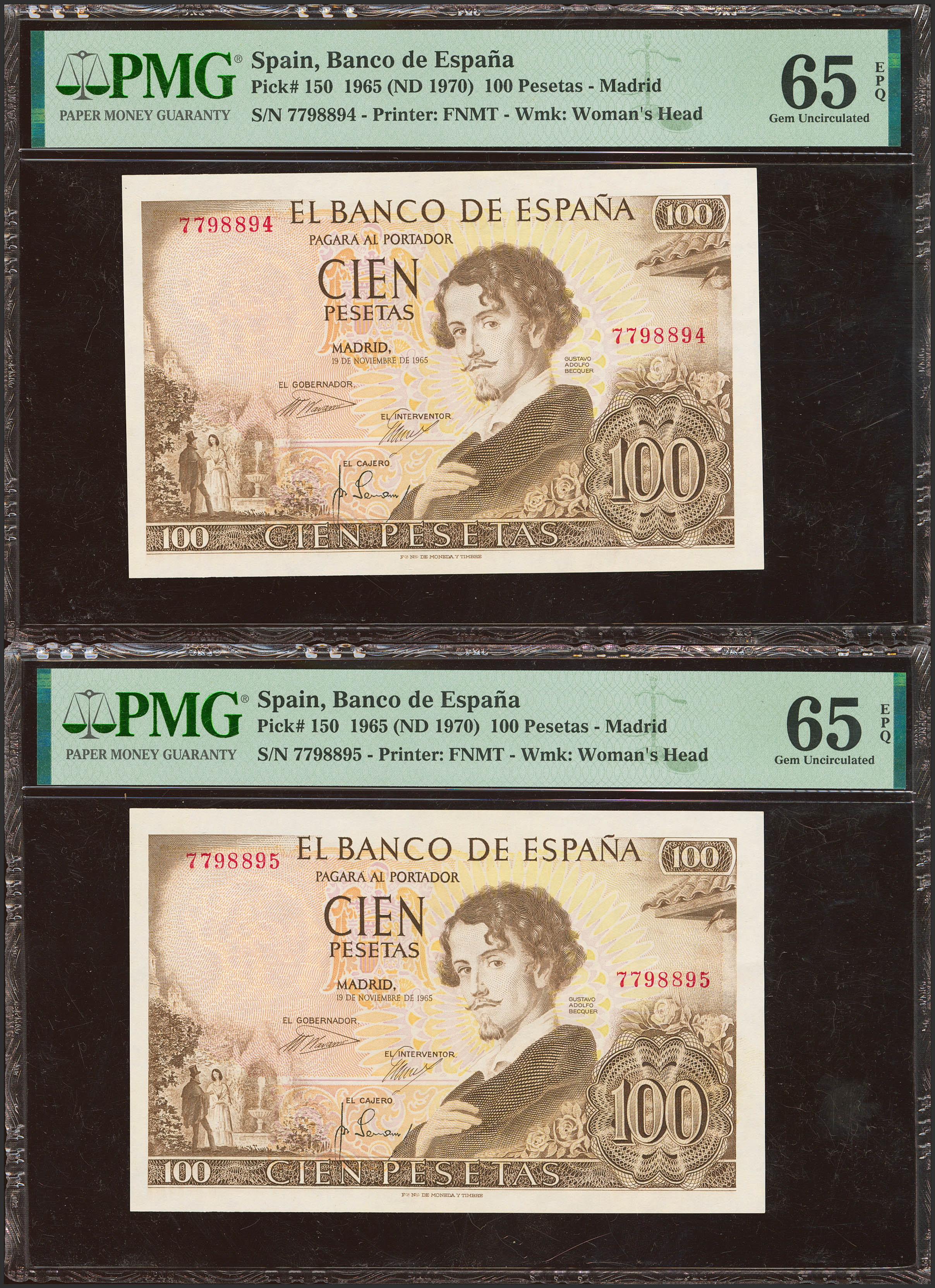 100 Pesetas. November 19, 1965. Correlative couple. No serie. (Edifil 2023: 470, Pick: 150). Original sizing. PMG65EPQ encapsulated, both.