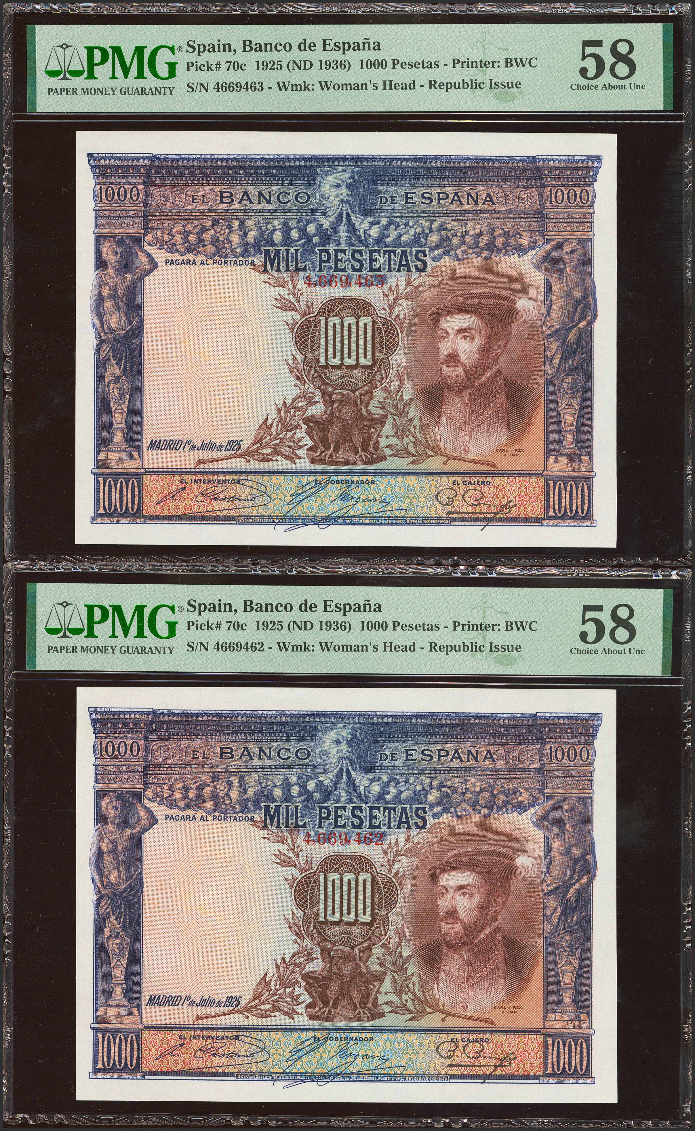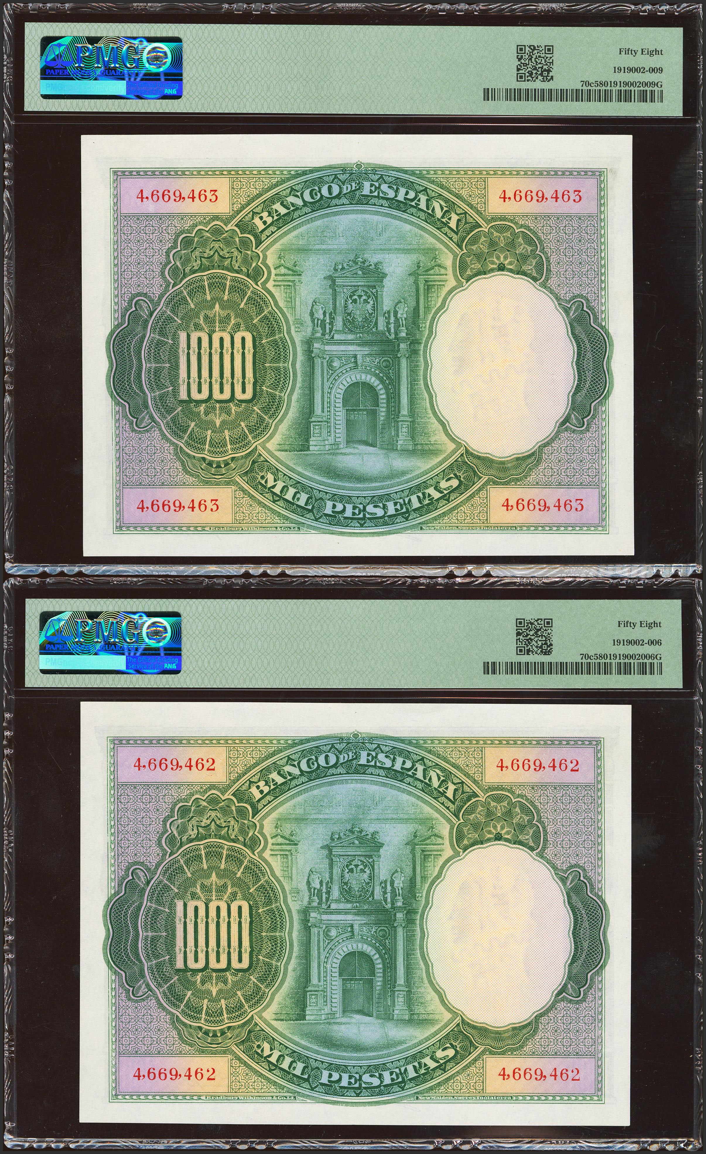 1000 Pesetas. July 1, 1925. Correlative couple. Without series and numbering higher than 3646000. (Edifil 2021: 351, Pick: 70c). Unusual in this quality. Good Extremely Fine+. PMG58 encapsulated, both.
