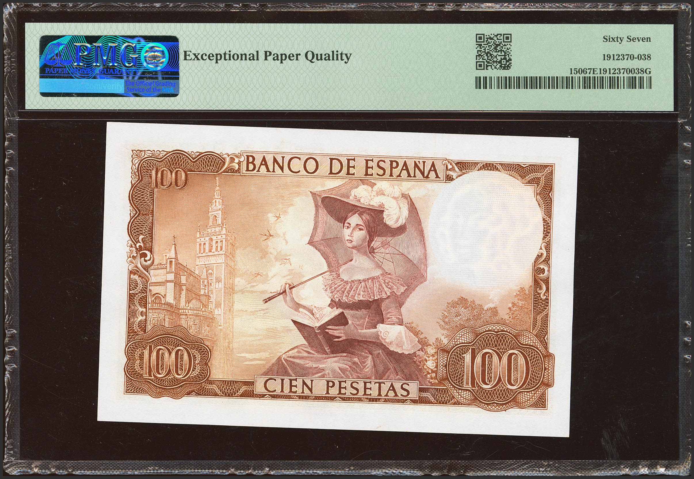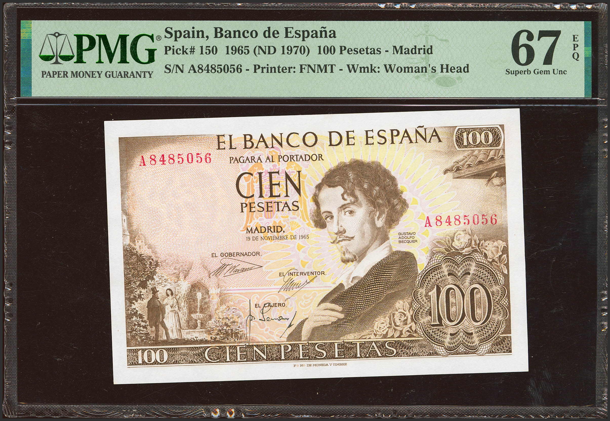 100 Pesetas. November 19, 1965. Series A. (Edifil 2023: 470a, Pick: 150). Original sizing. PMG67EPQ package.